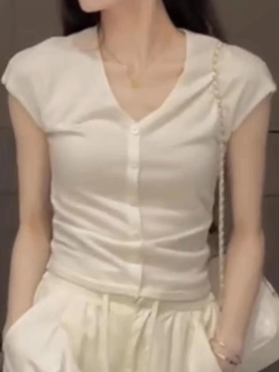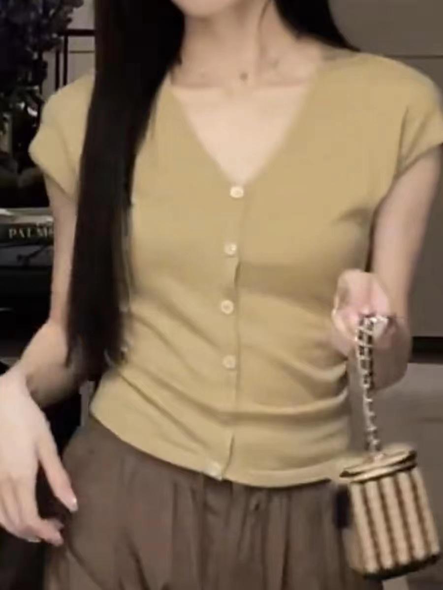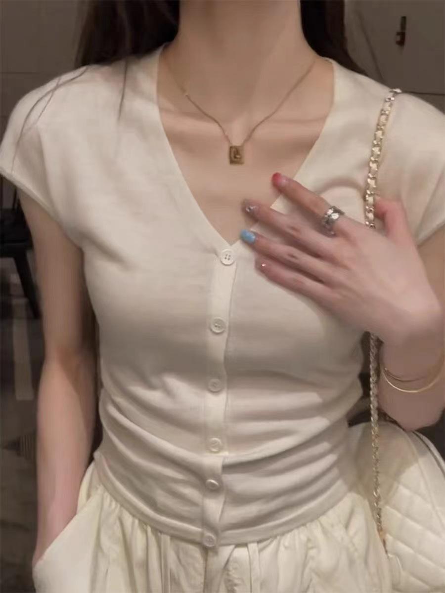 2024 Verano Nuevo Maduro Ligero Casual Clavícula Tejido Camiseta de Manga Corta Verano Nuevo Ajustado Adelgazante