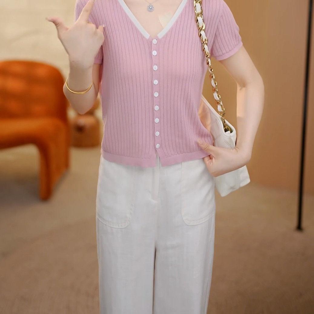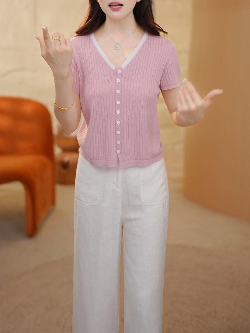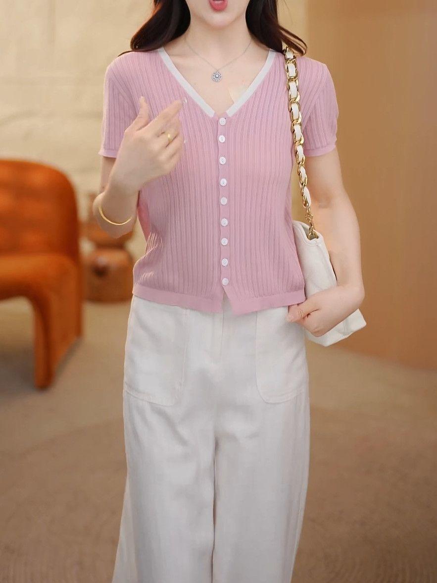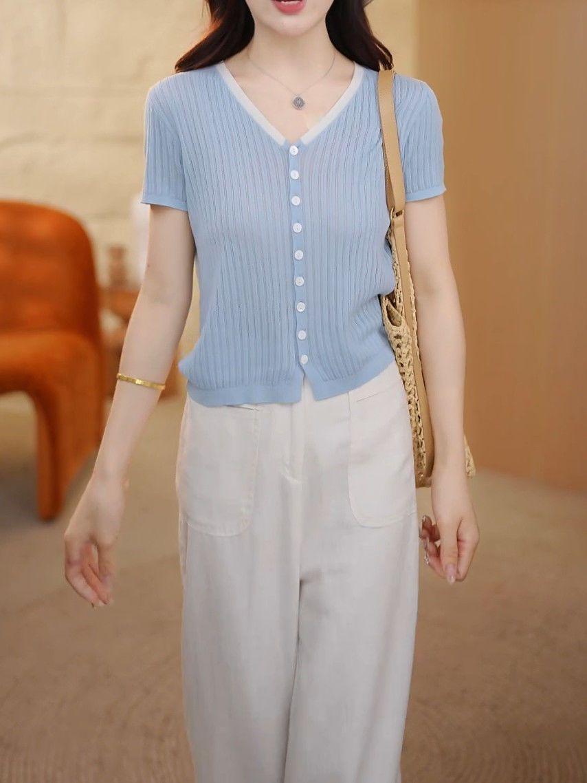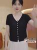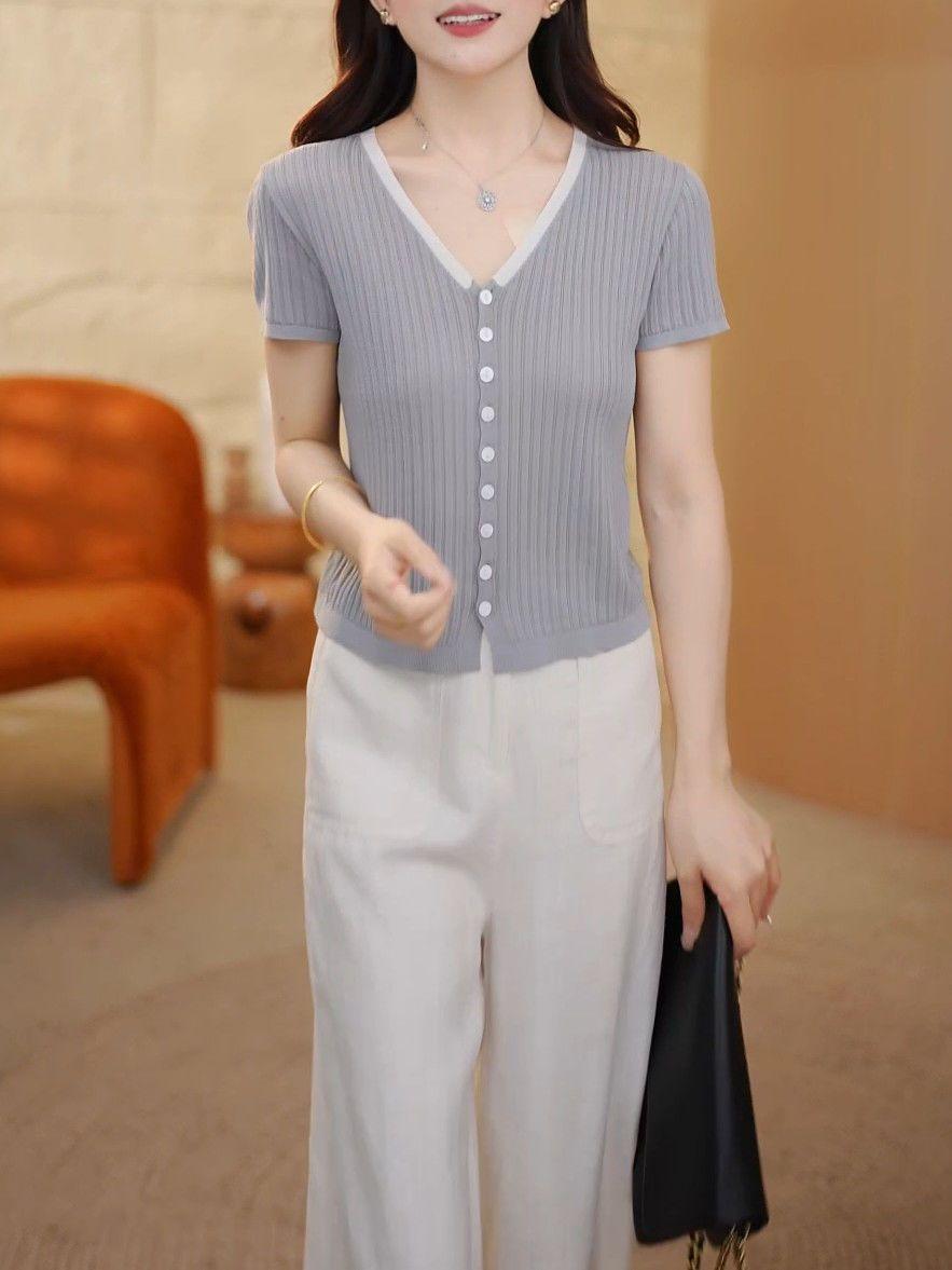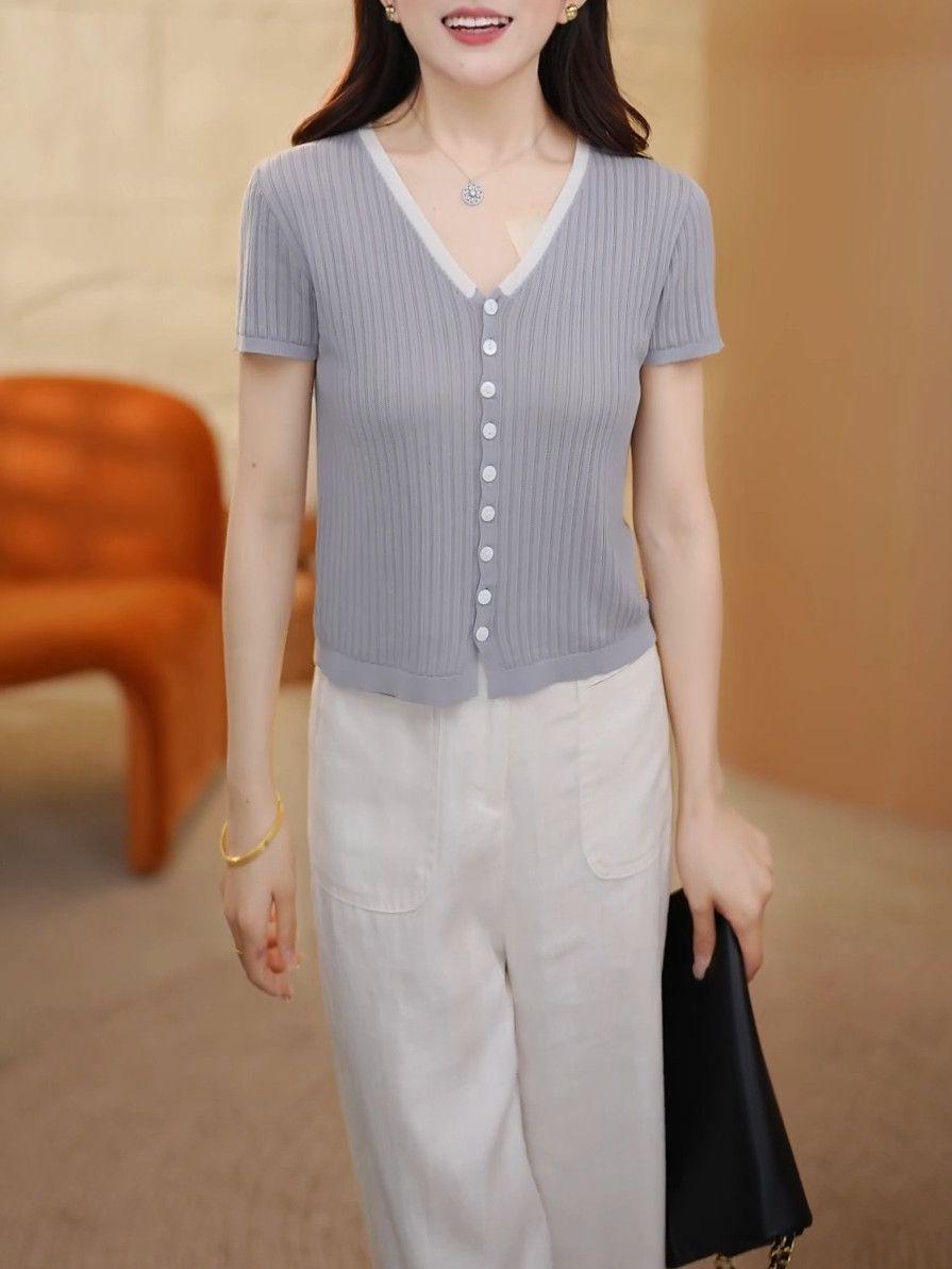Elegante Top de Punto de Manga Corta de Seda de Hielo Verano 2025 Delgado Nueva Moda de Botonadura Sencilla para Mujer Casual Versátil Adelgazante