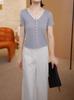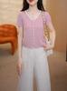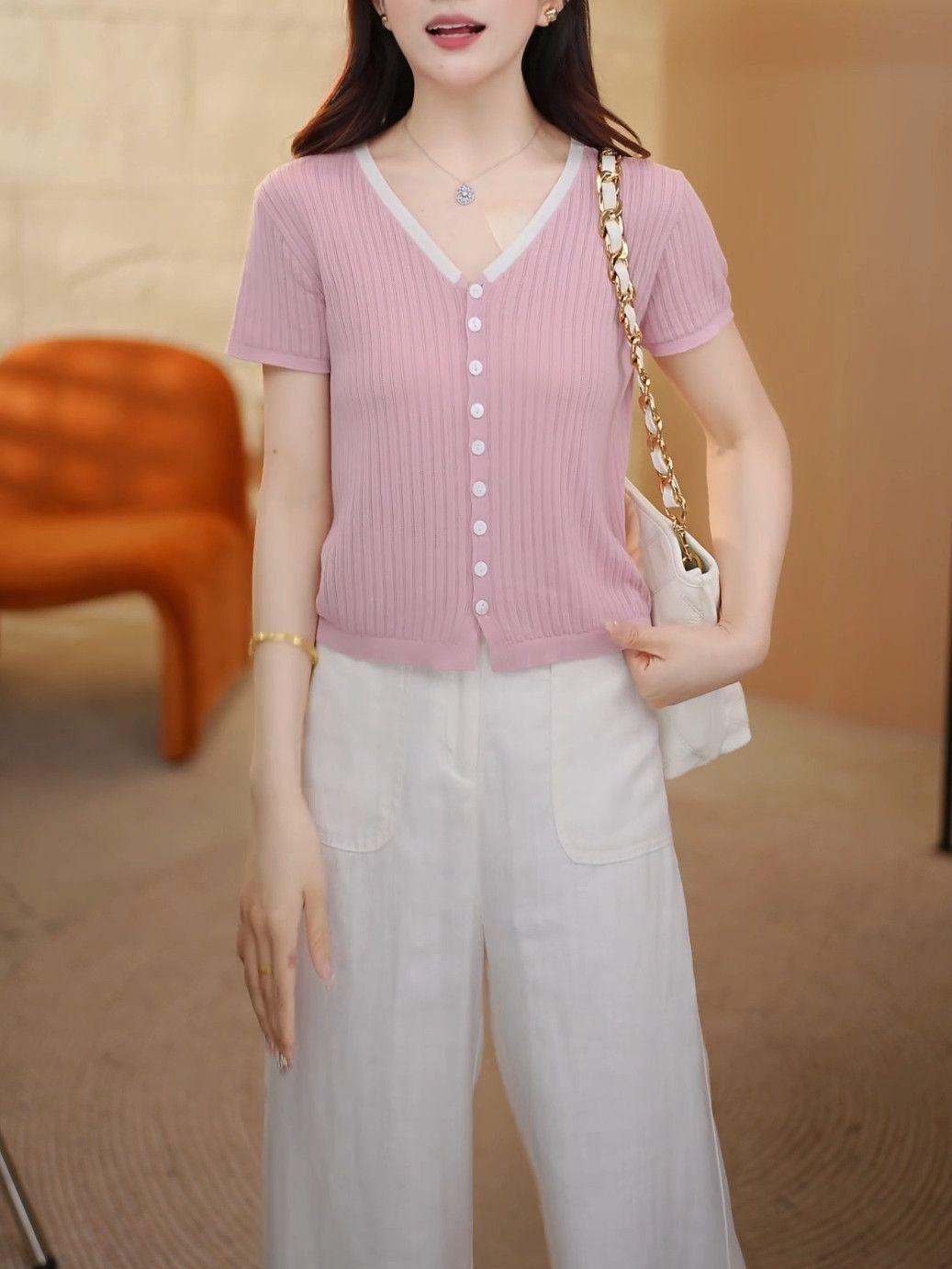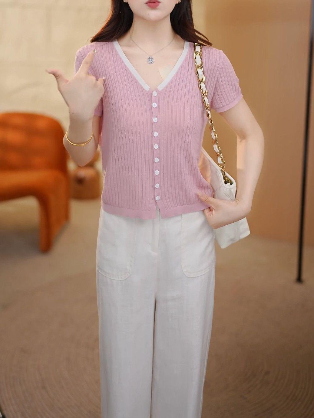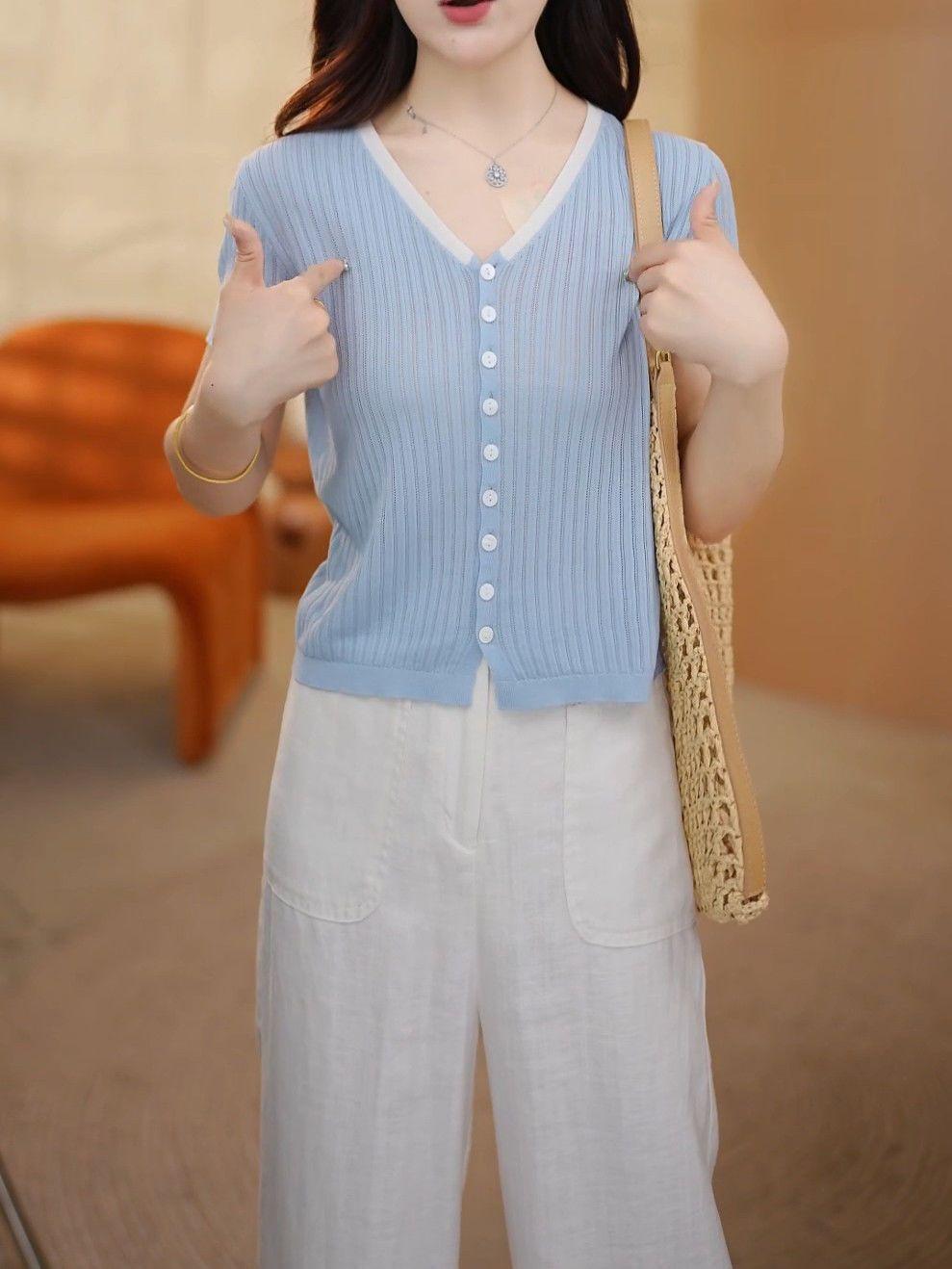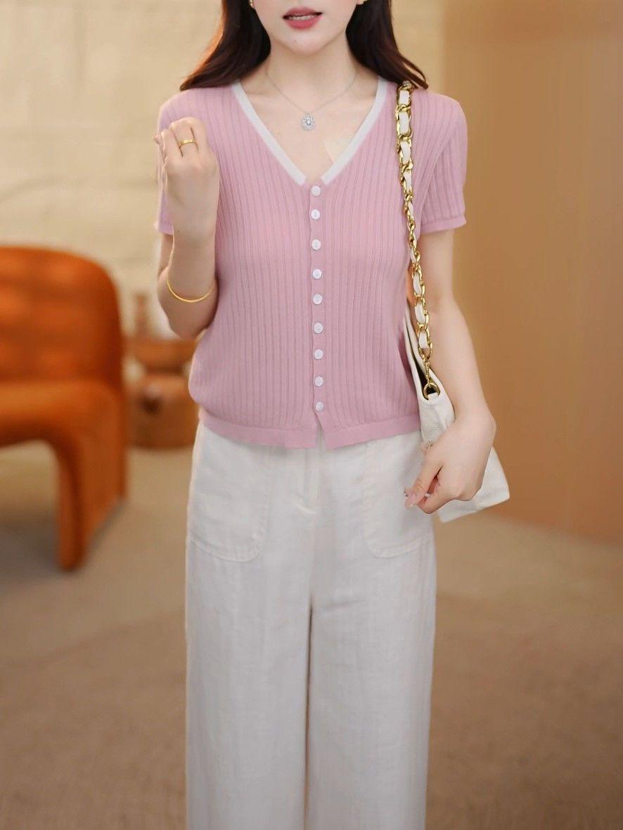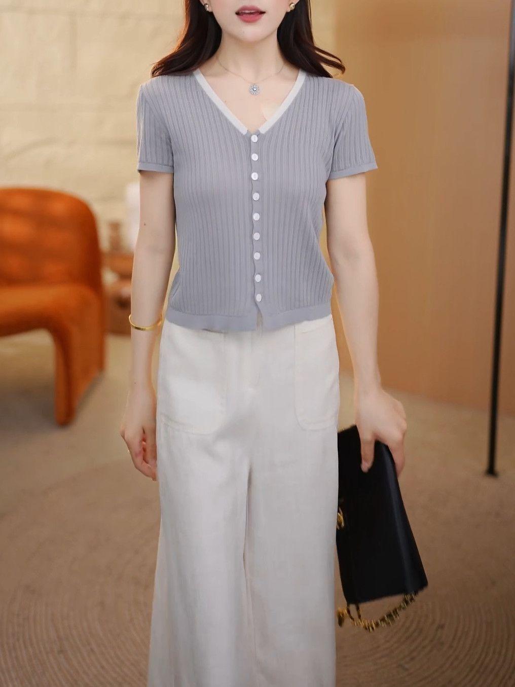 Elegante Top de Punto de Manga Corta de Seda de Hielo Verano 2025 Delgado Nueva Moda de Botonadura Sencilla para Mujer Casual Versátil Adelgazante