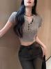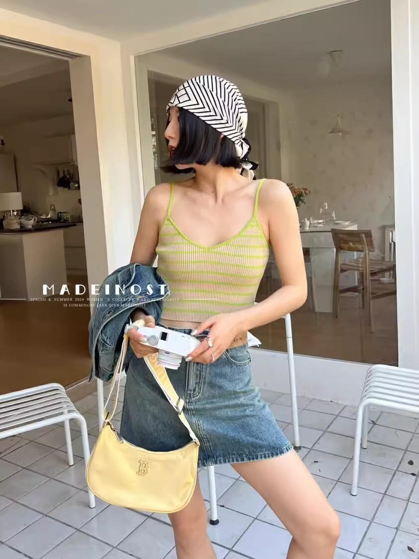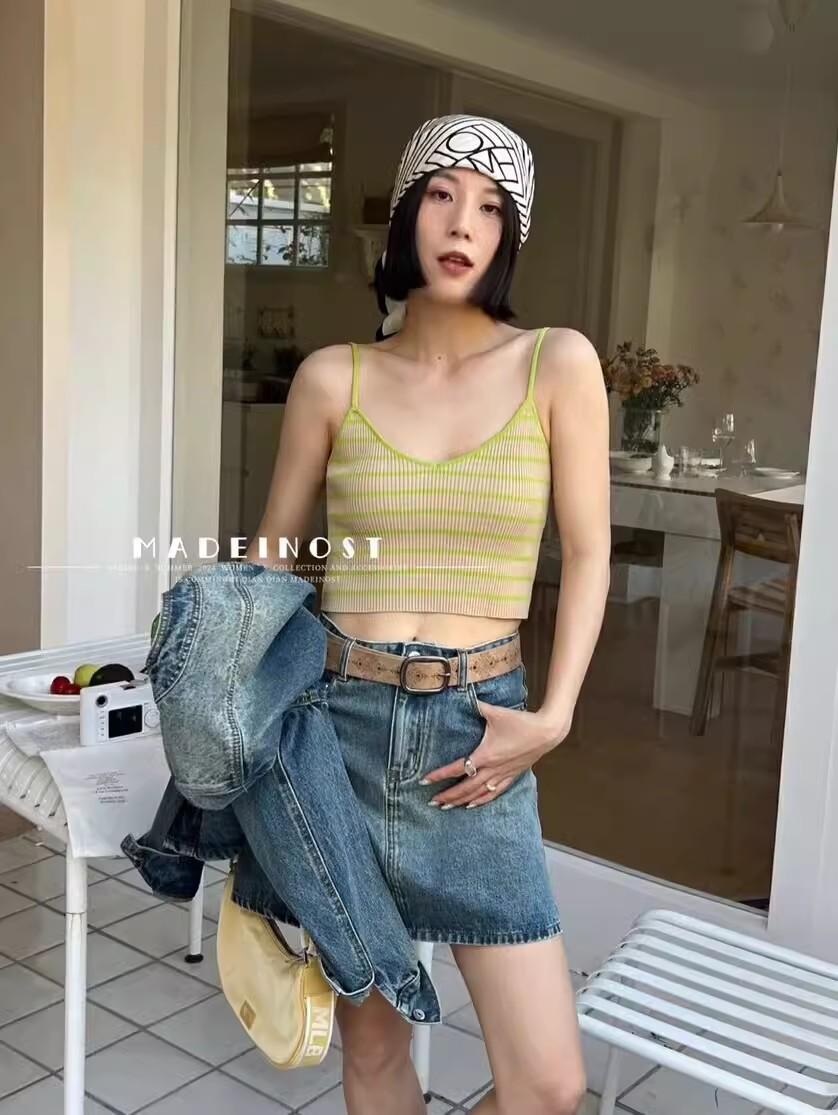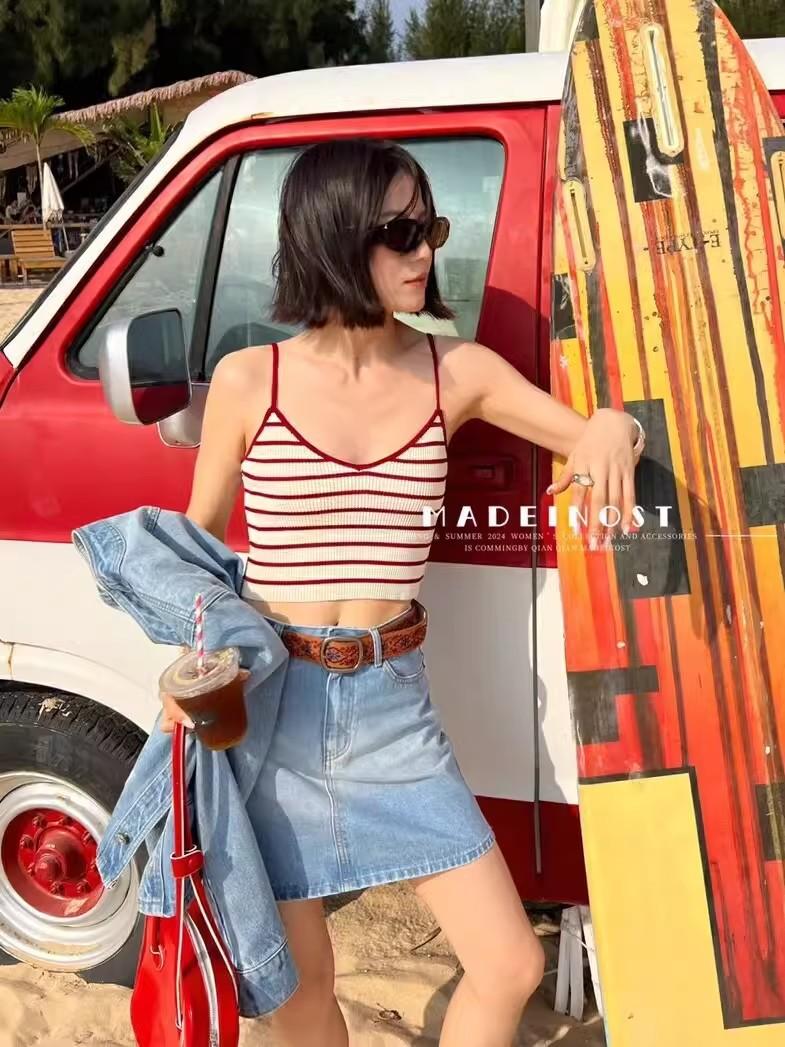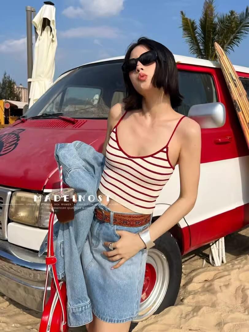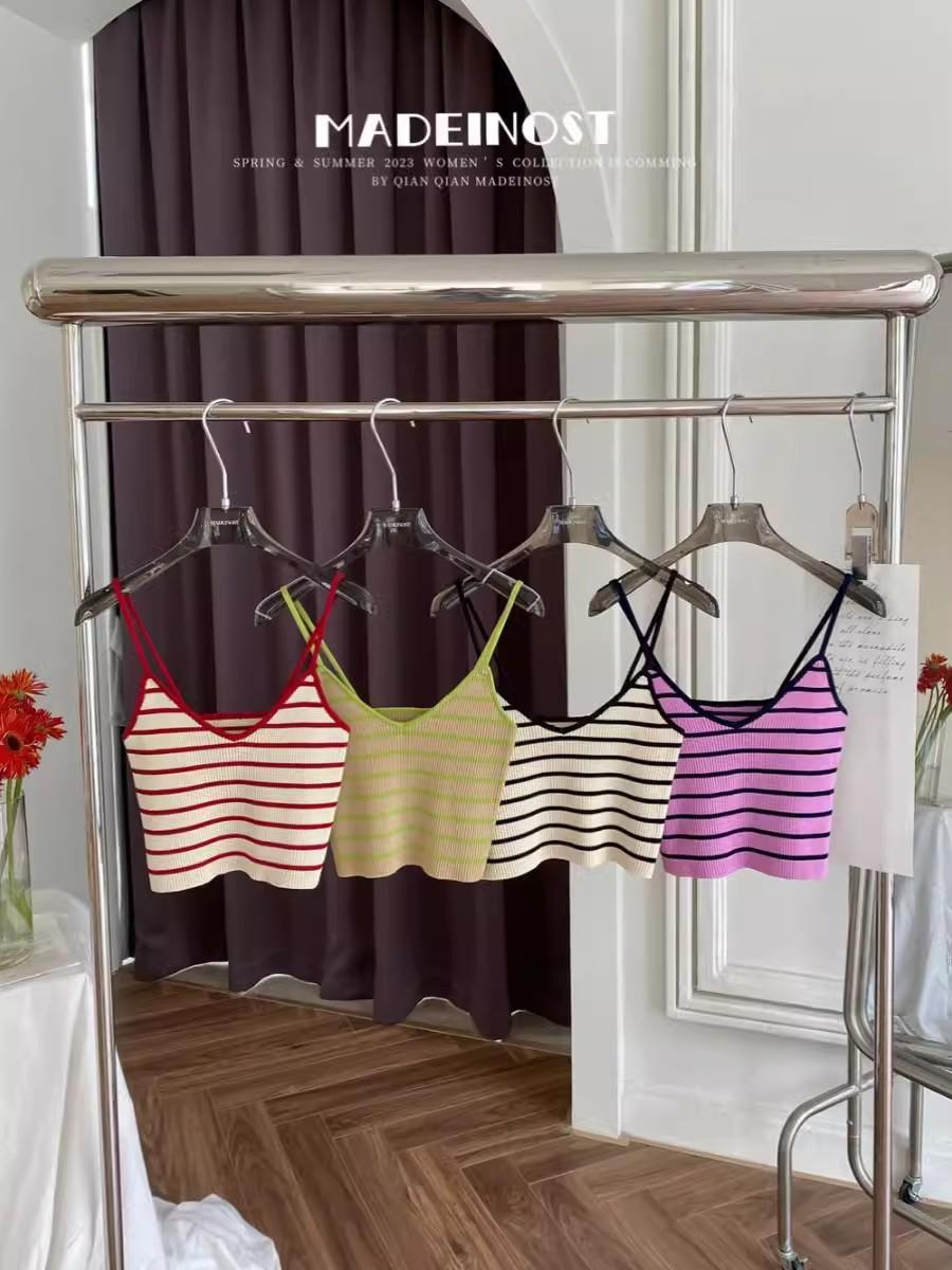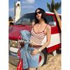 Camisola de Punto de Lana a Rayas de Contraste Primavera y Verano Ajustada y Versátil Top Exterior Corto para Mujer