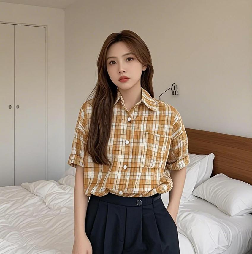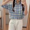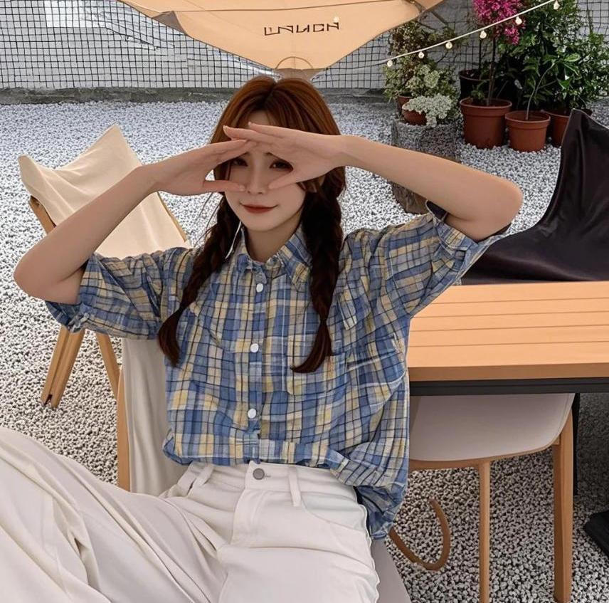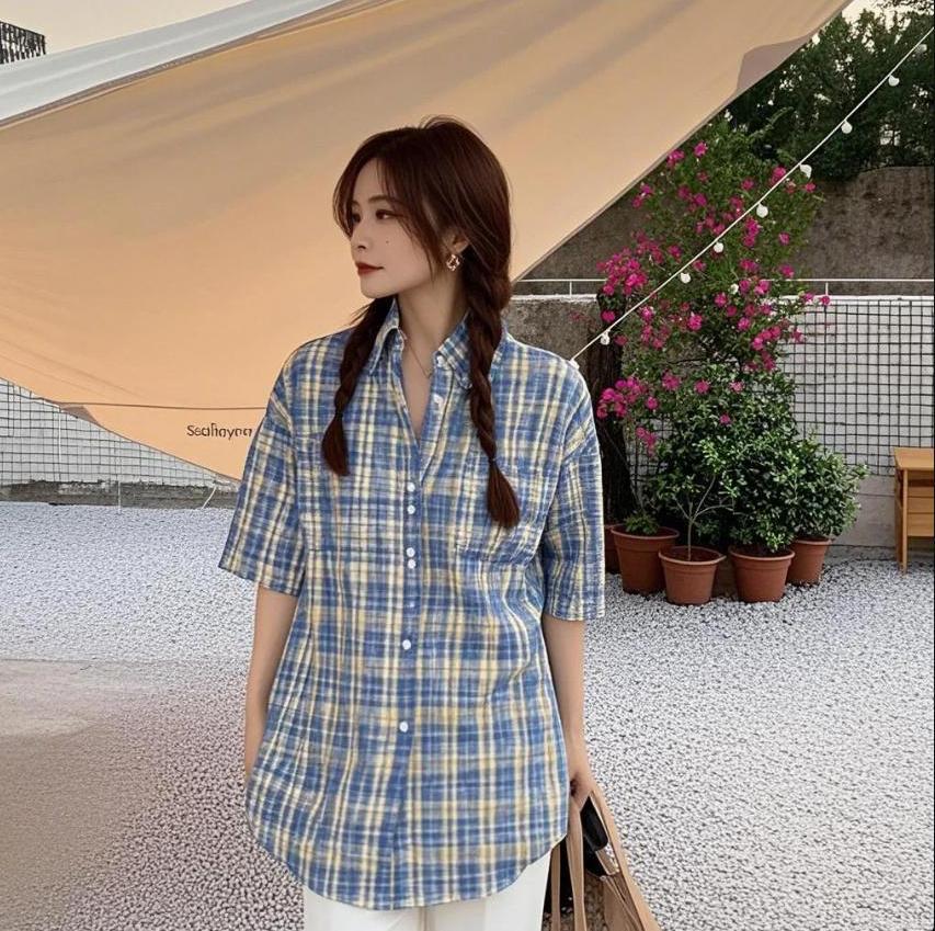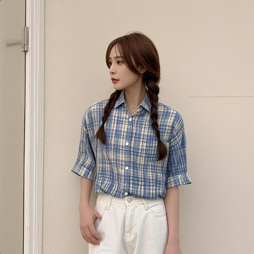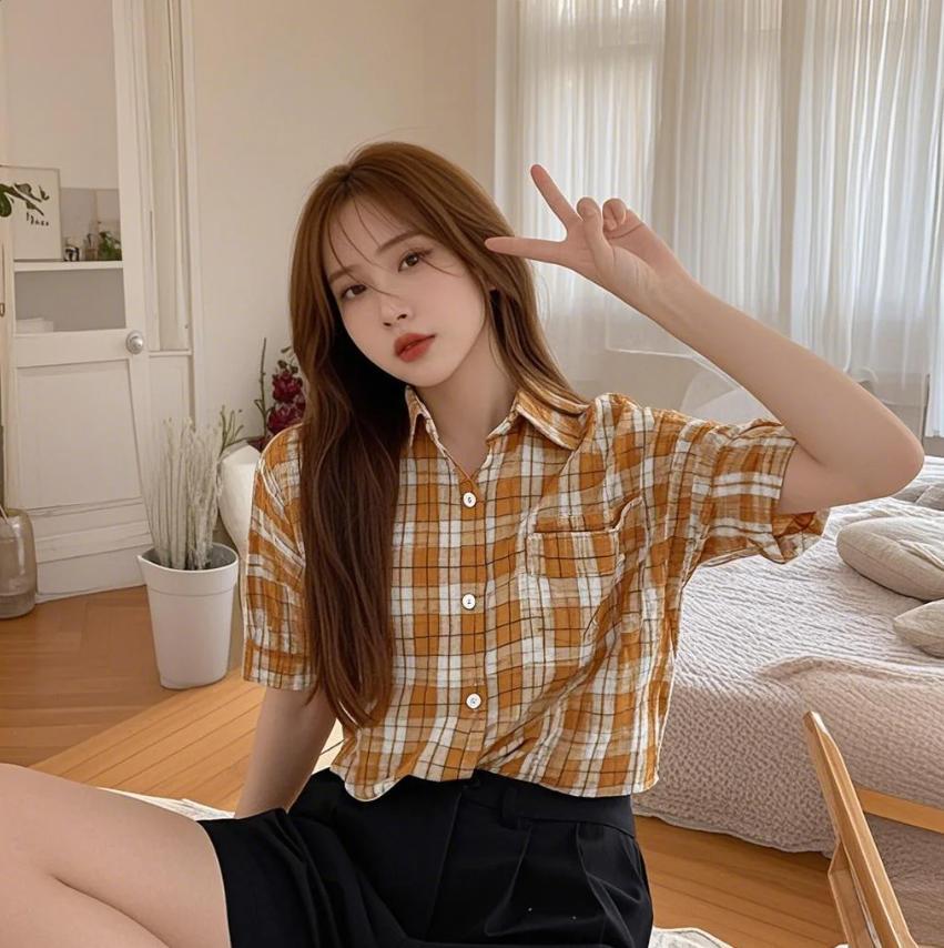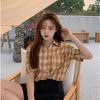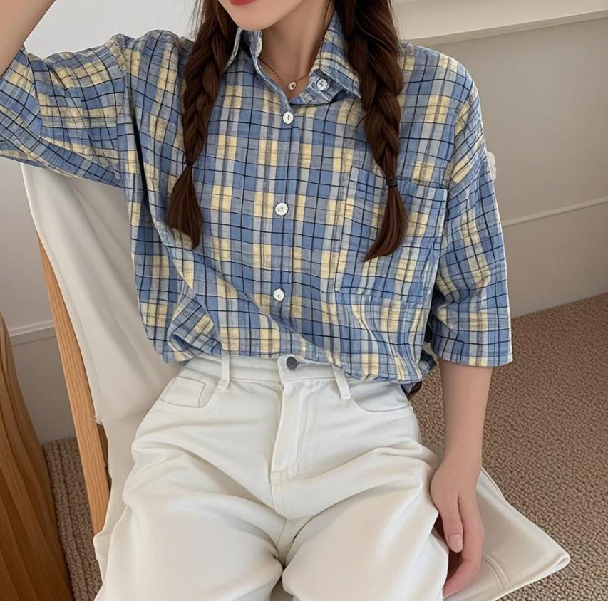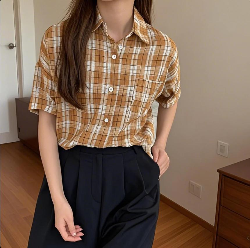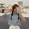 [Estilo Caliente Transfronterizo] Camisa de Cuadros Estilo Hong Kong para Mujer, Top de Diseño Nicho, Camisa Versátil de Manga Corta y Largo Medio