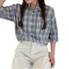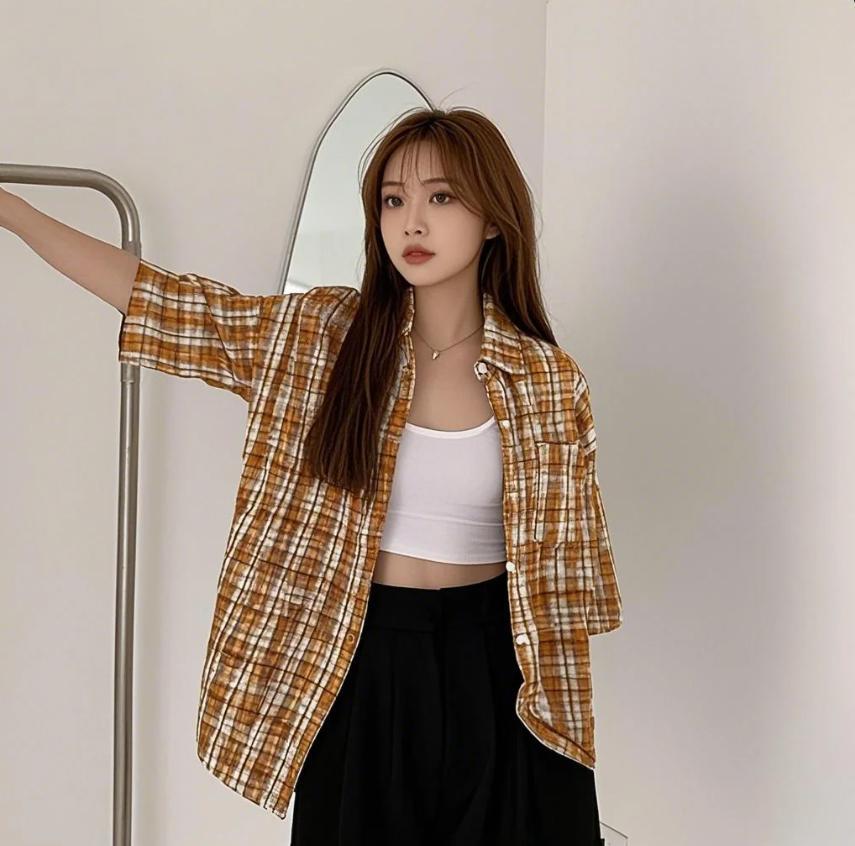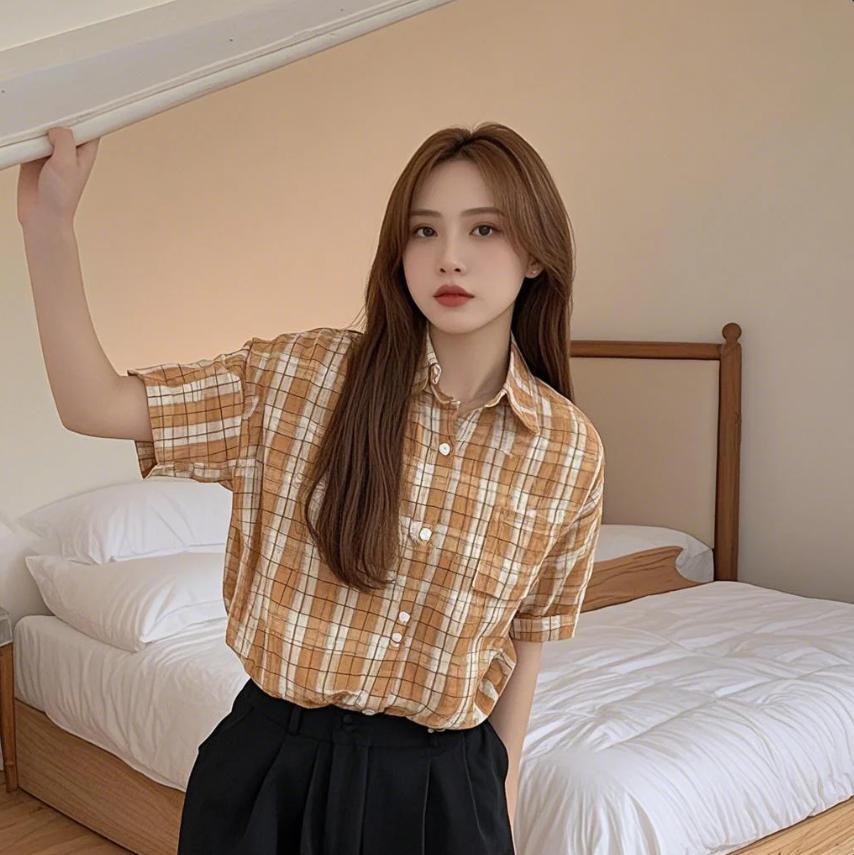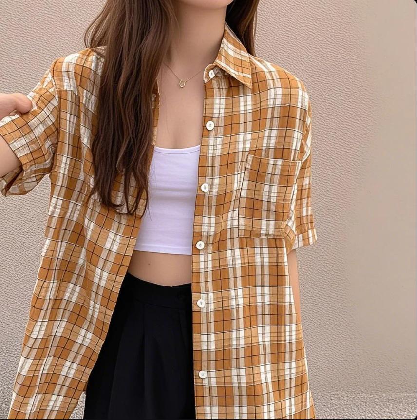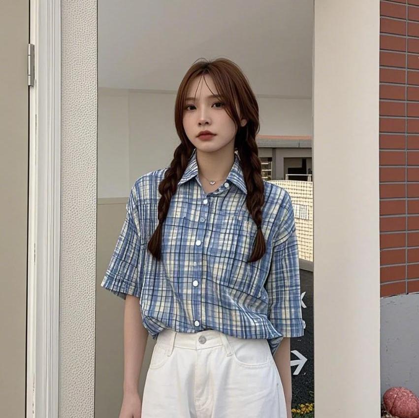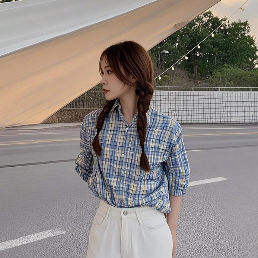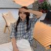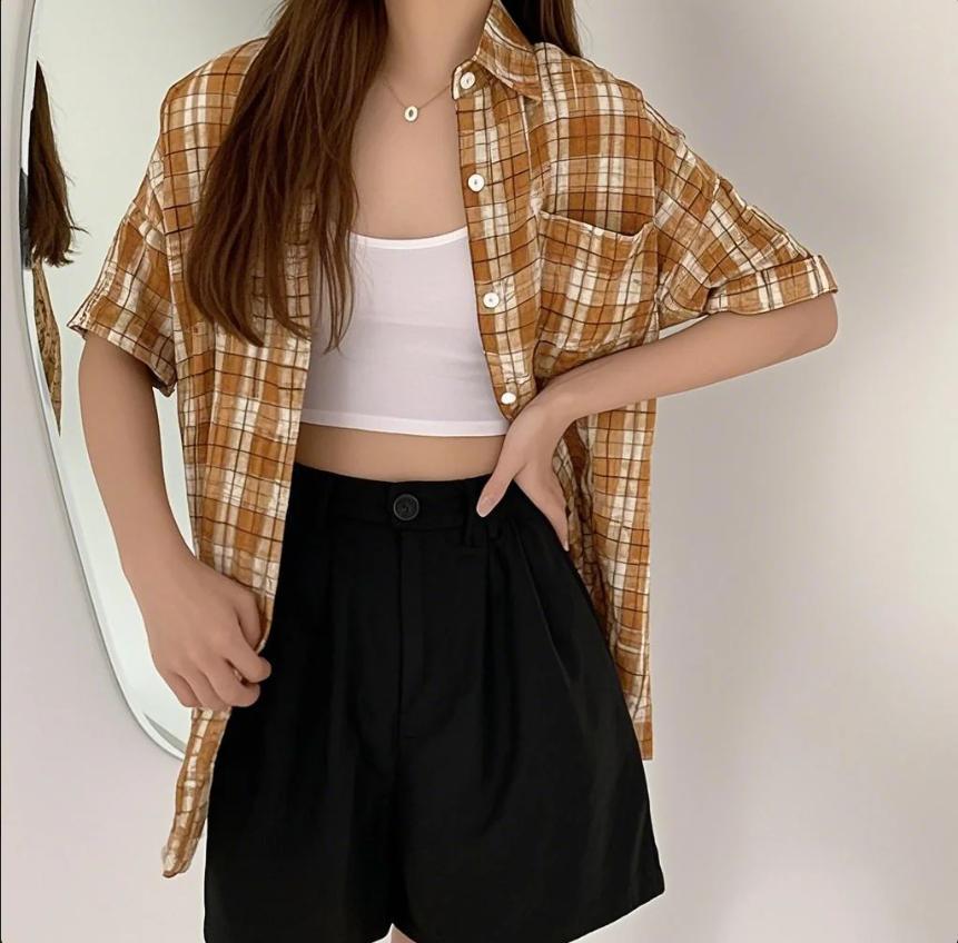 [Estilo Caliente Transfronterizo] Camisa de Cuadros Estilo Hong Kong para Mujer, Top de Diseño Nicho, Camisa Versátil de Manga Corta y Largo Medio