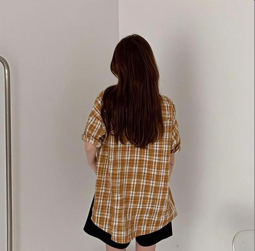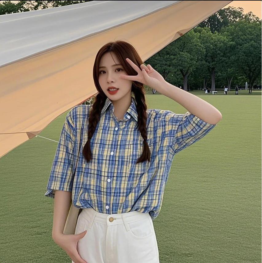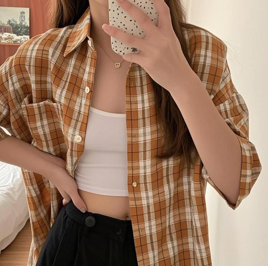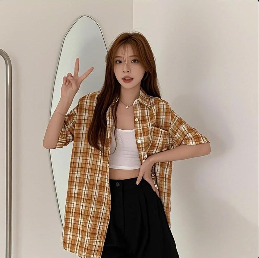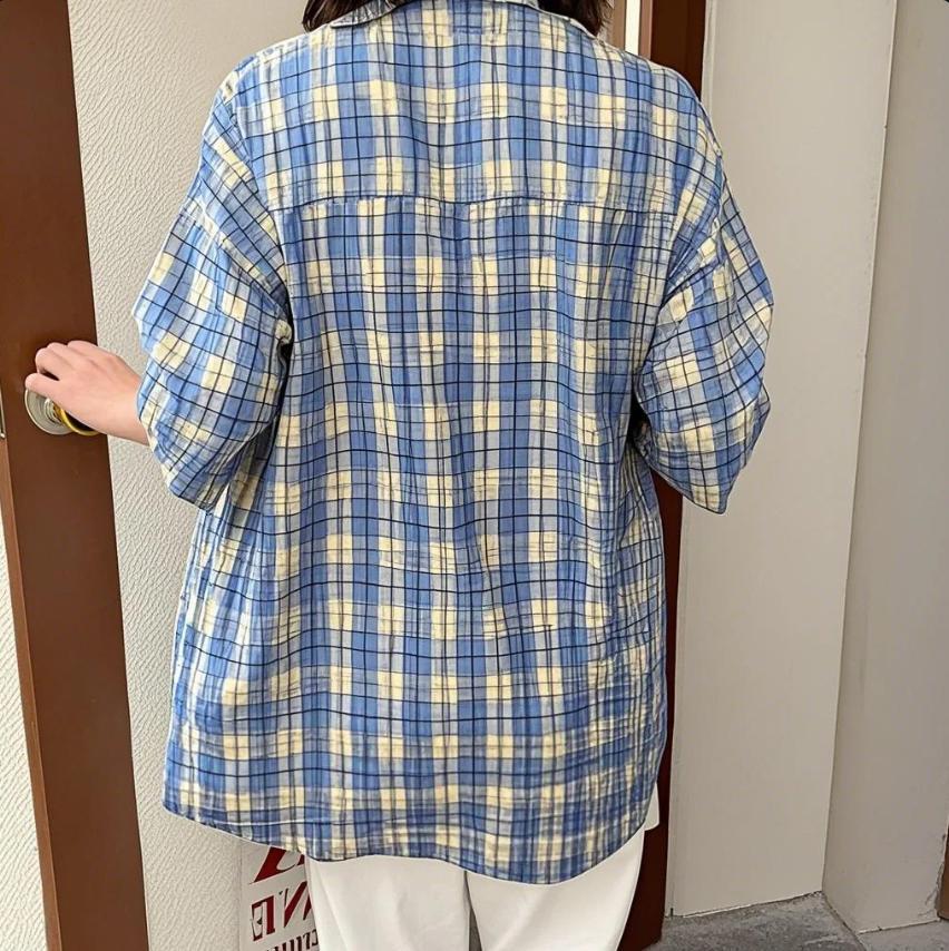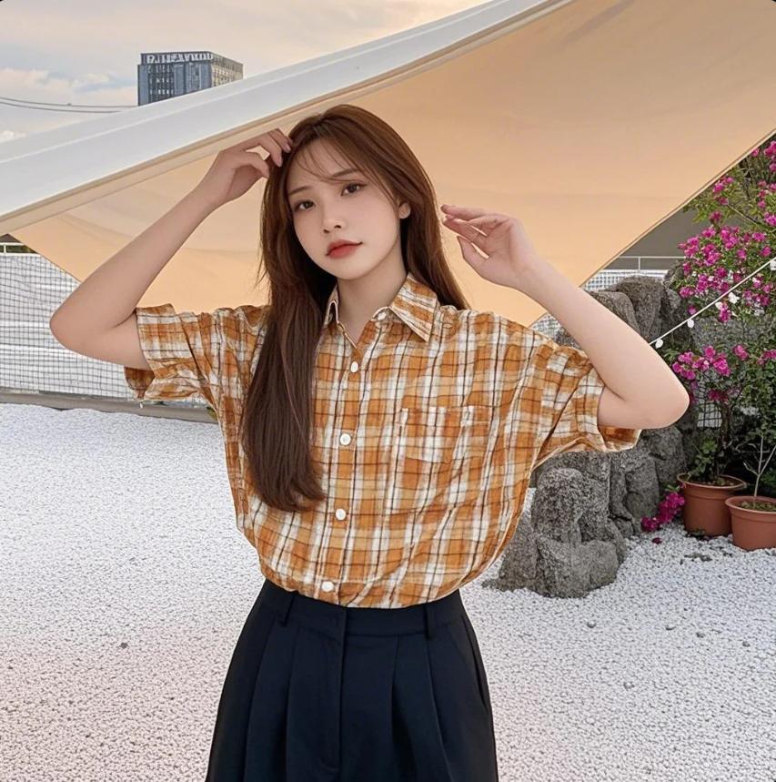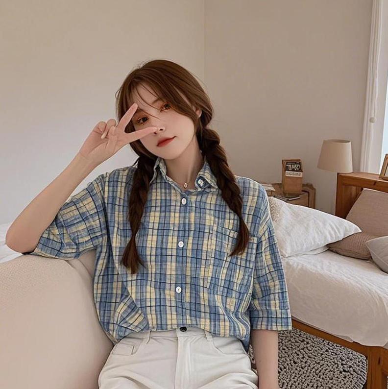 [Estilo Caliente Transfronterizo] Camisa de Cuadros Estilo Hong Kong para Mujer, Top de Diseño Nicho, Camisa Versátil de Manga Corta y Largo Medio