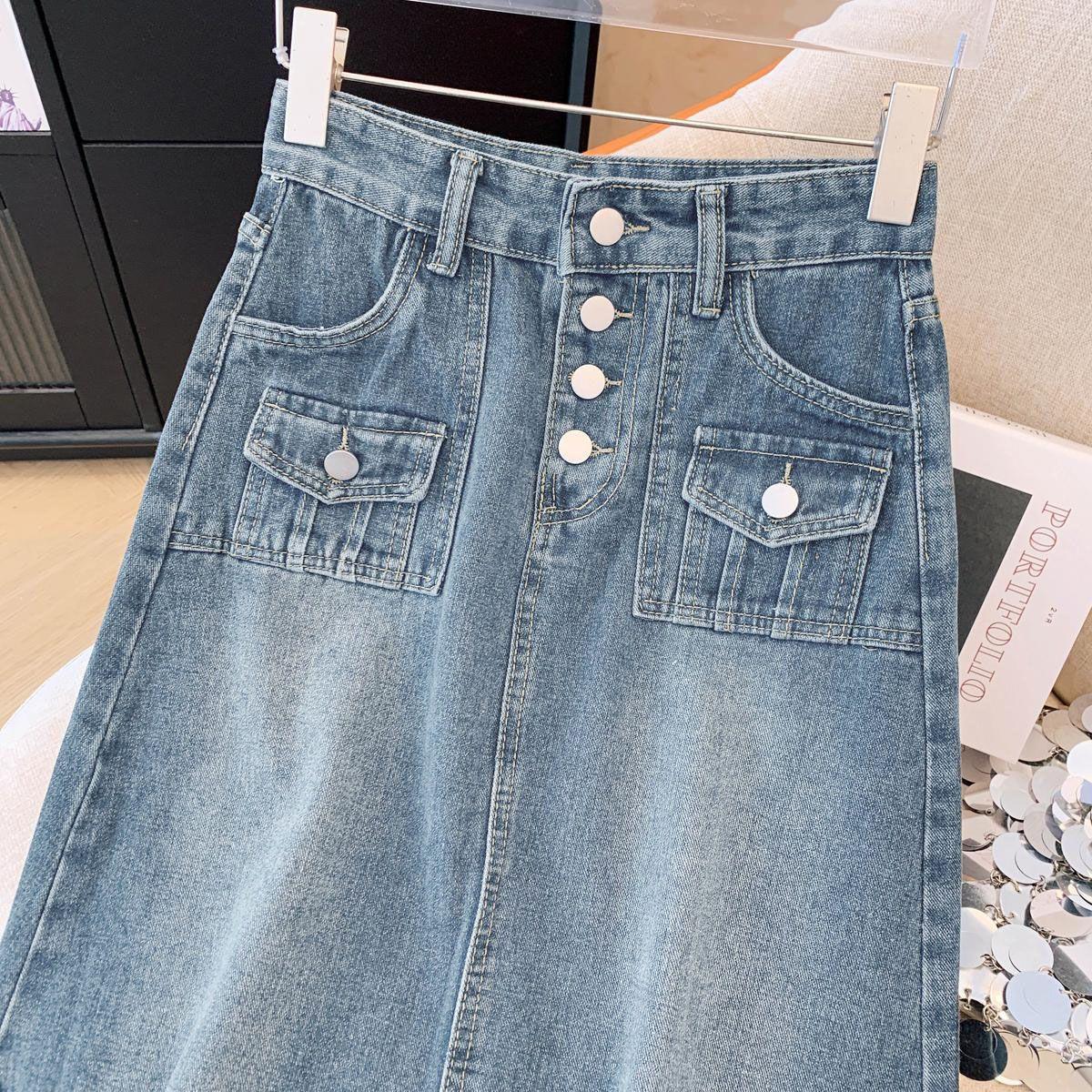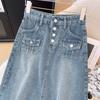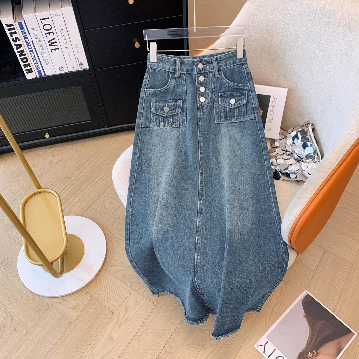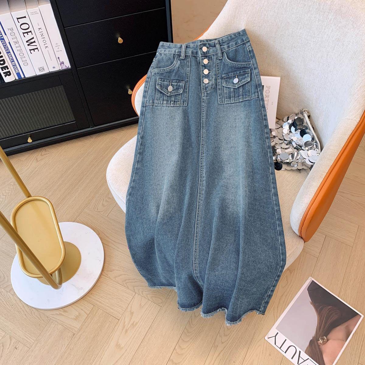 Falda de mezclilla de alta gama con flecos y borde crudo para mujer 2025 Estilo coreano Ropa exterior para mujer Look adelgazante Falda midi de talle alto