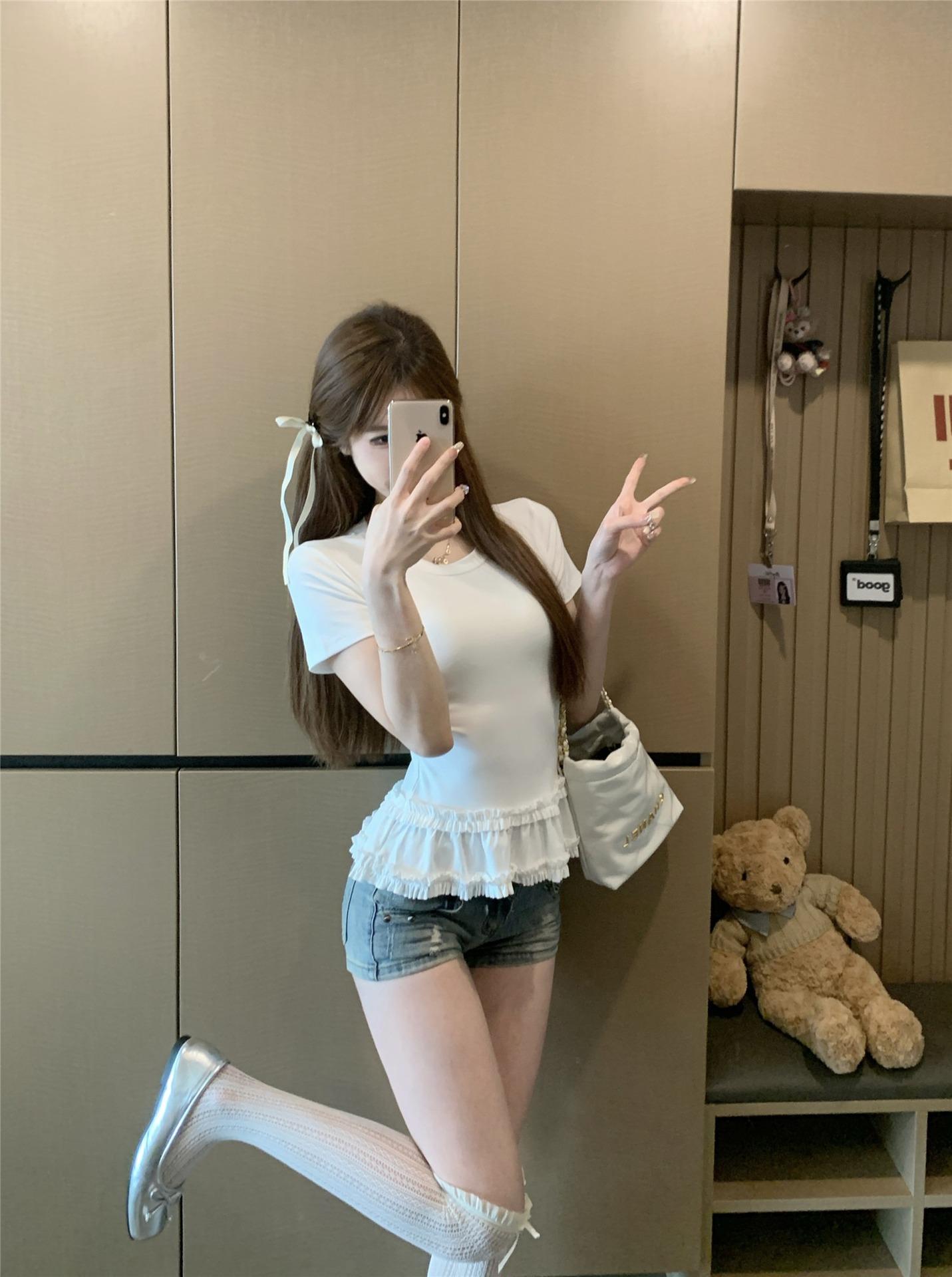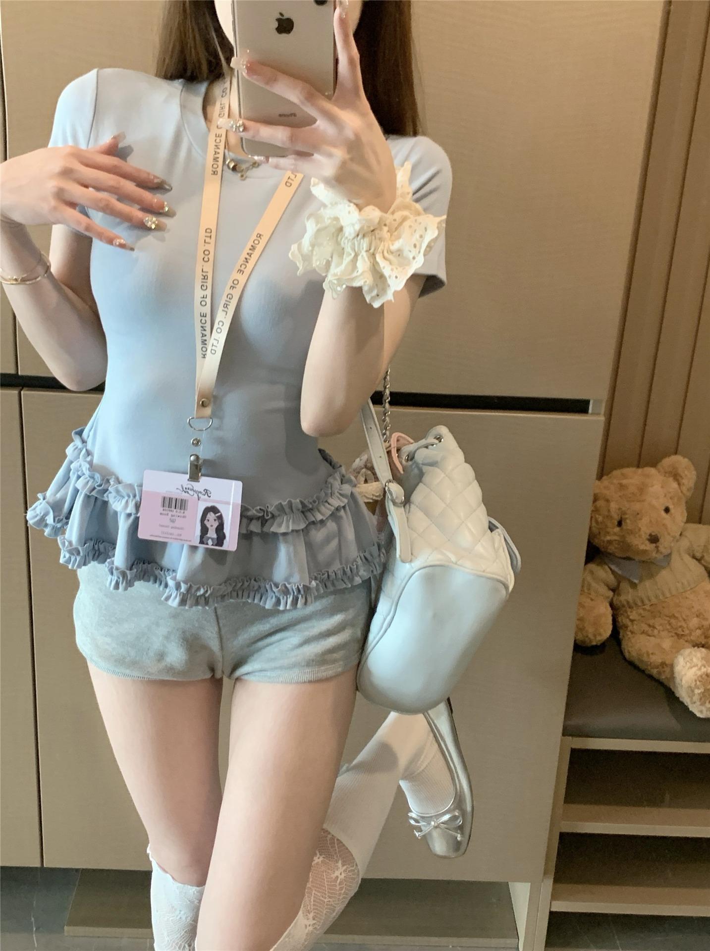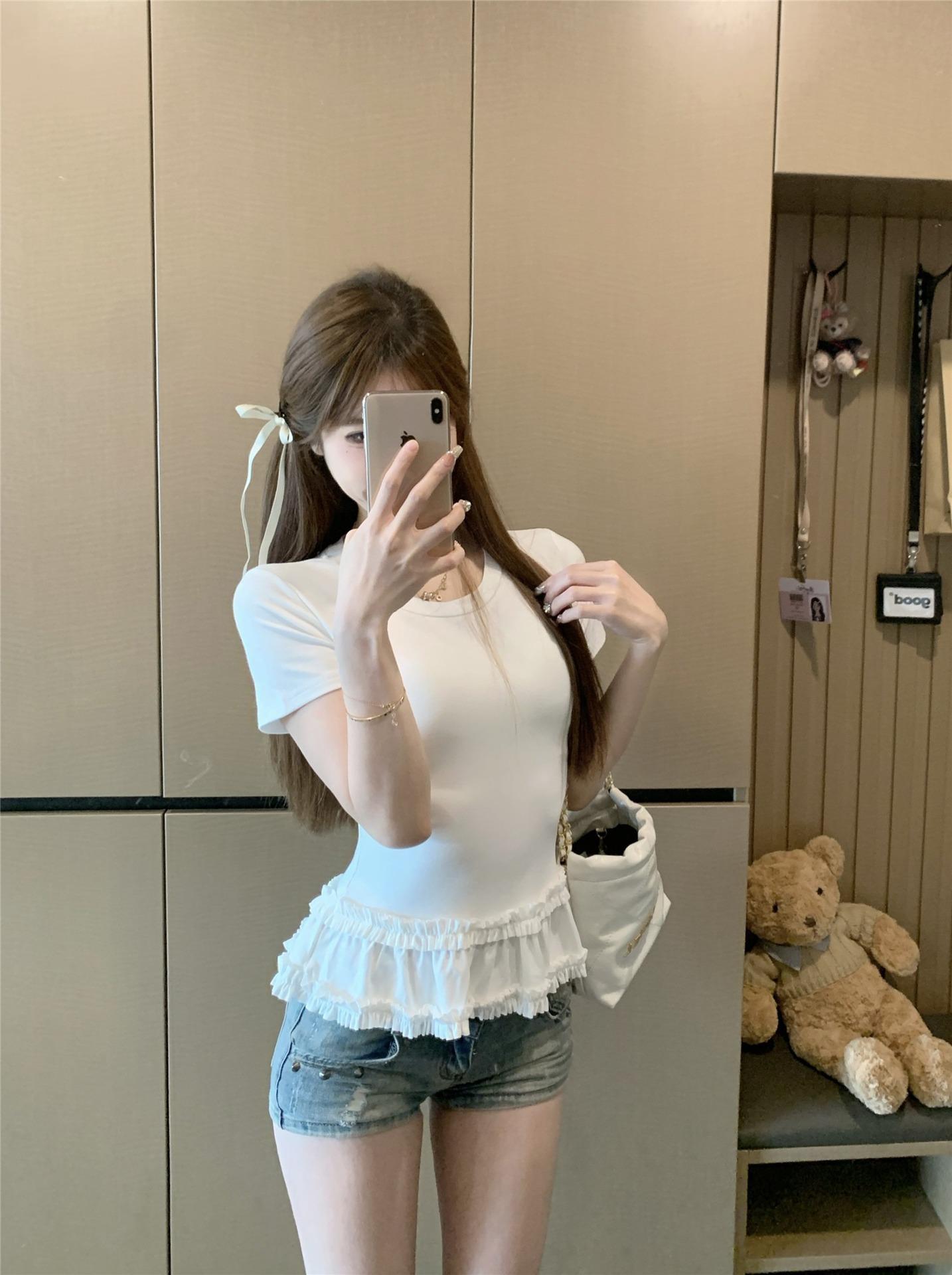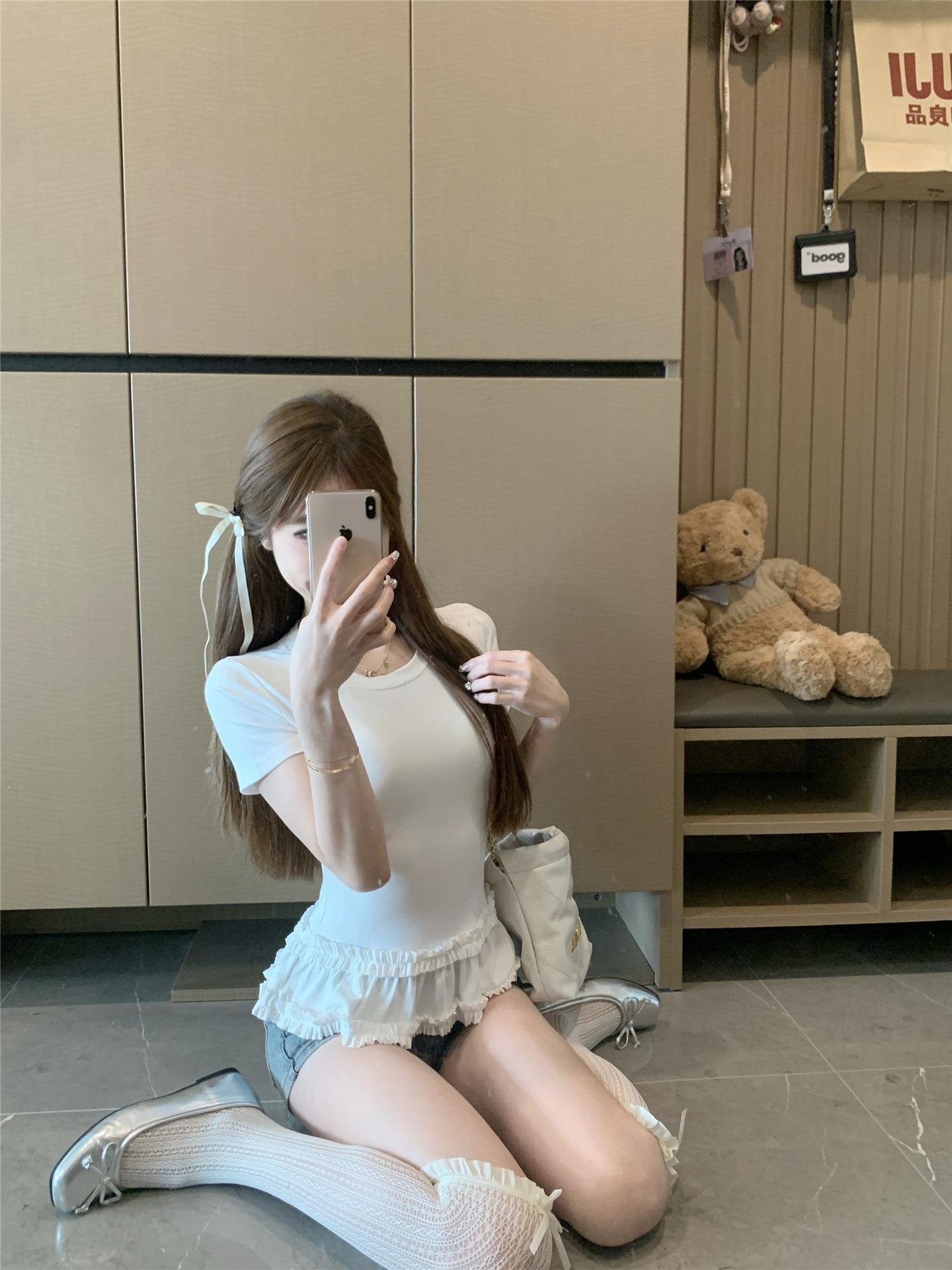 Estilo Dulce Estilo Coreano Verano Bajo con Volantes Combinable Cuello Redondo Manga Corta Diseño de Cintura Ceñida a la Moda Top Chic para Mujer