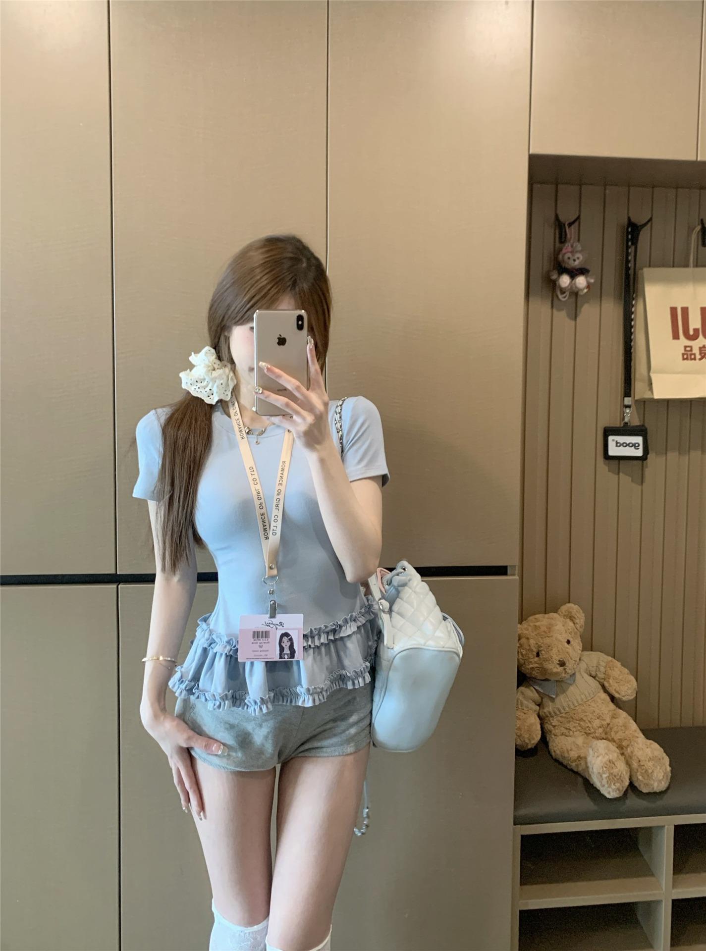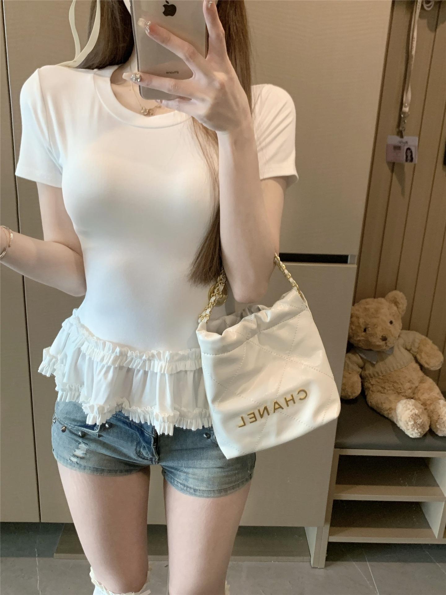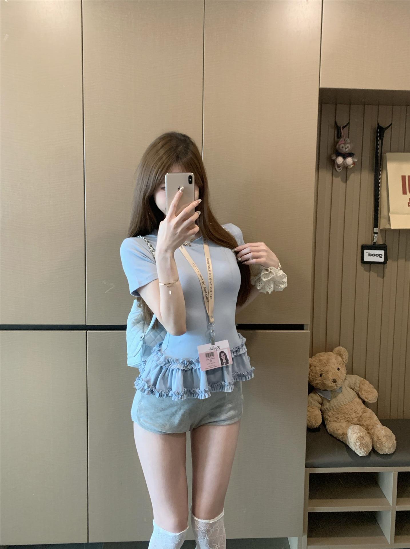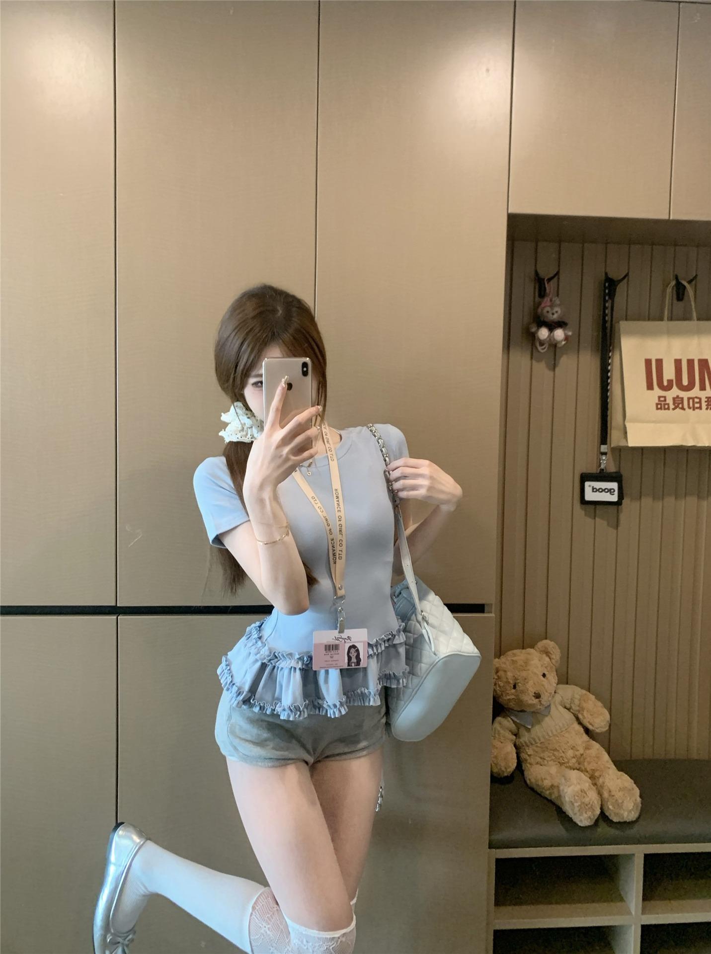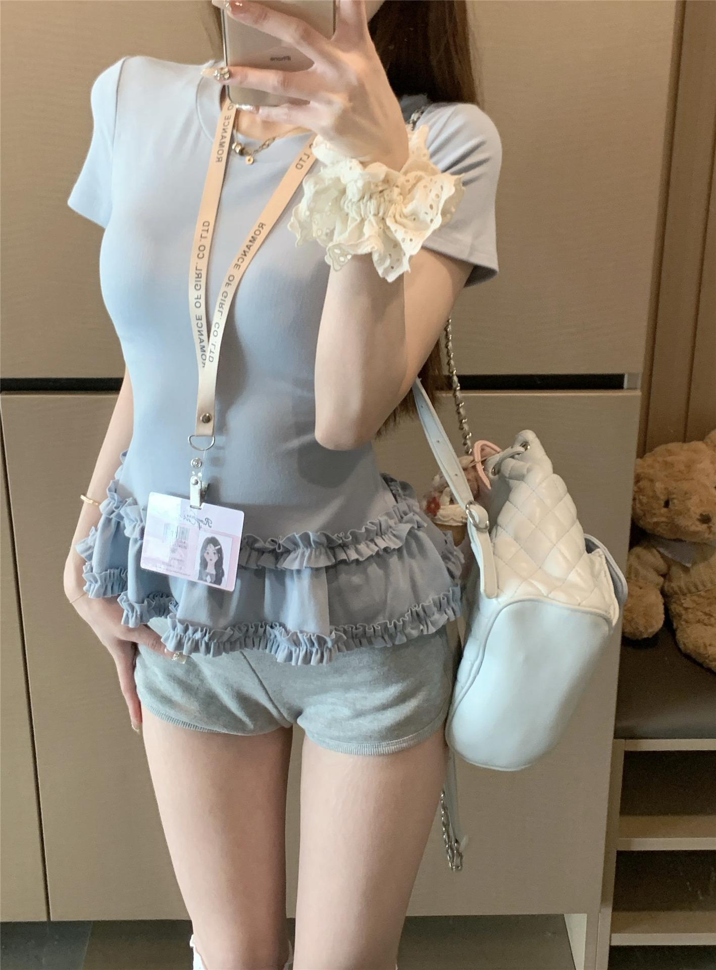 Estilo Dulce Estilo Coreano Verano Bajo con Volantes Combinable Cuello Redondo Manga Corta Diseño de Cintura Ceñida a la Moda Top Chic para Mujer