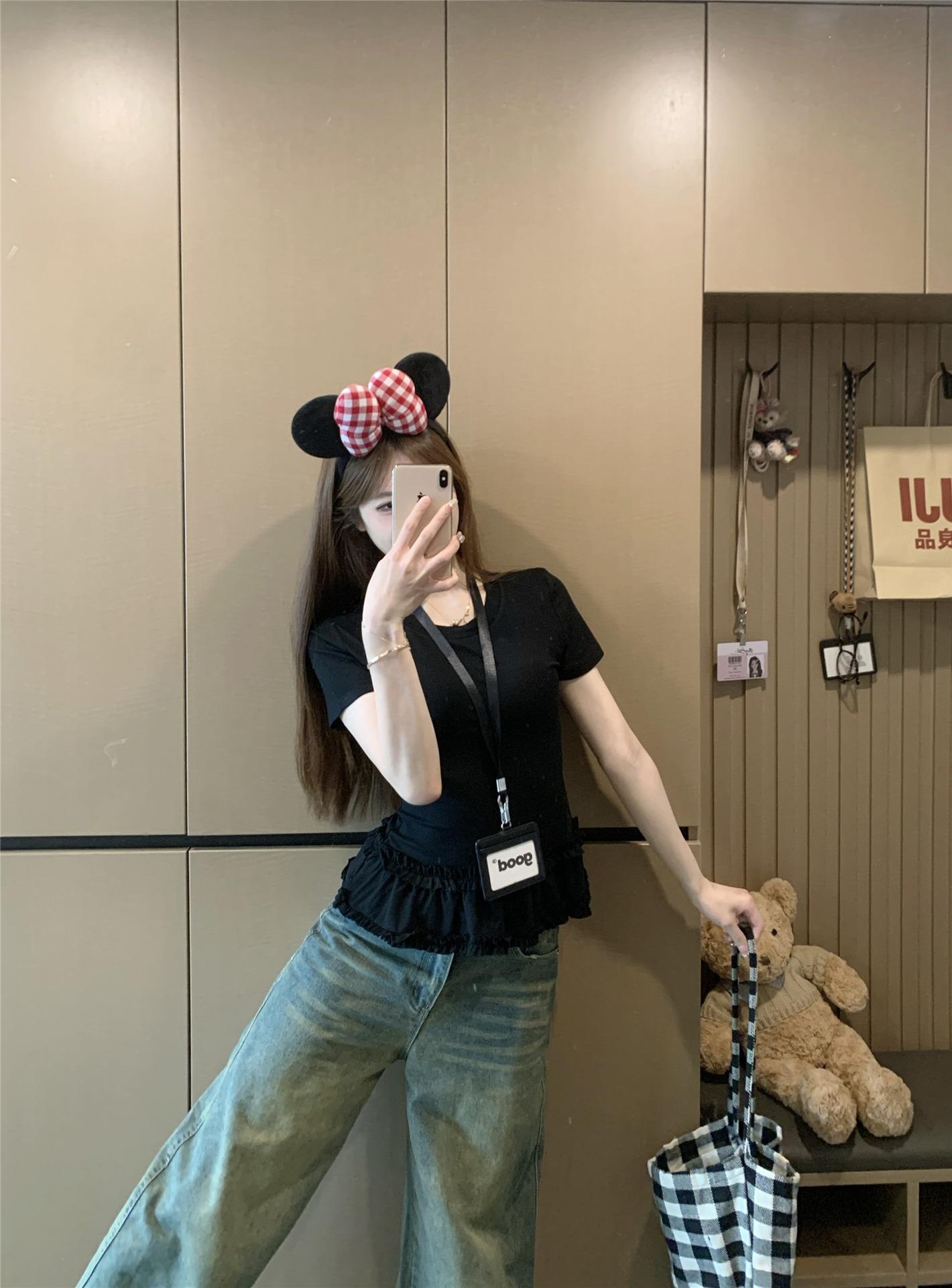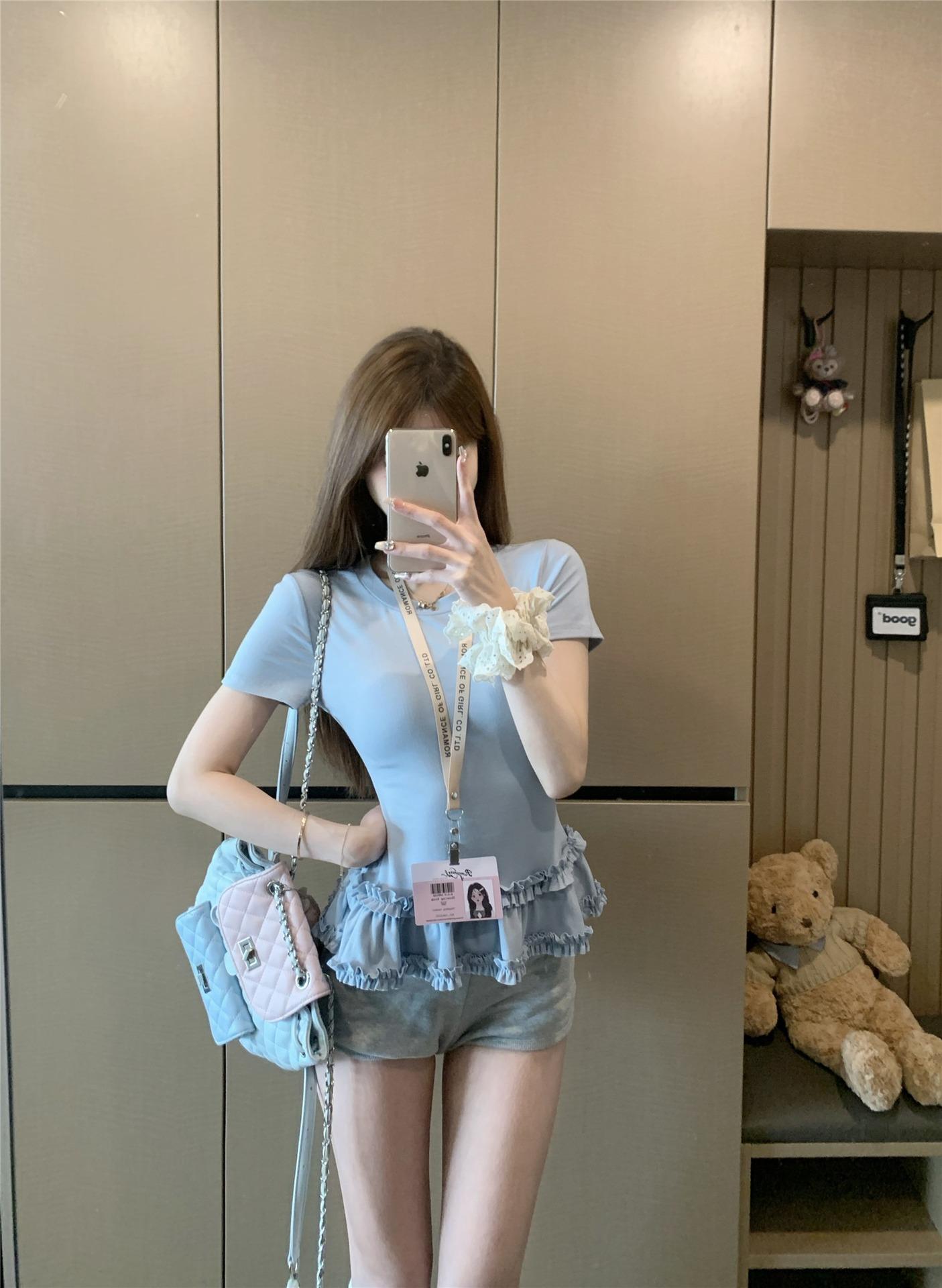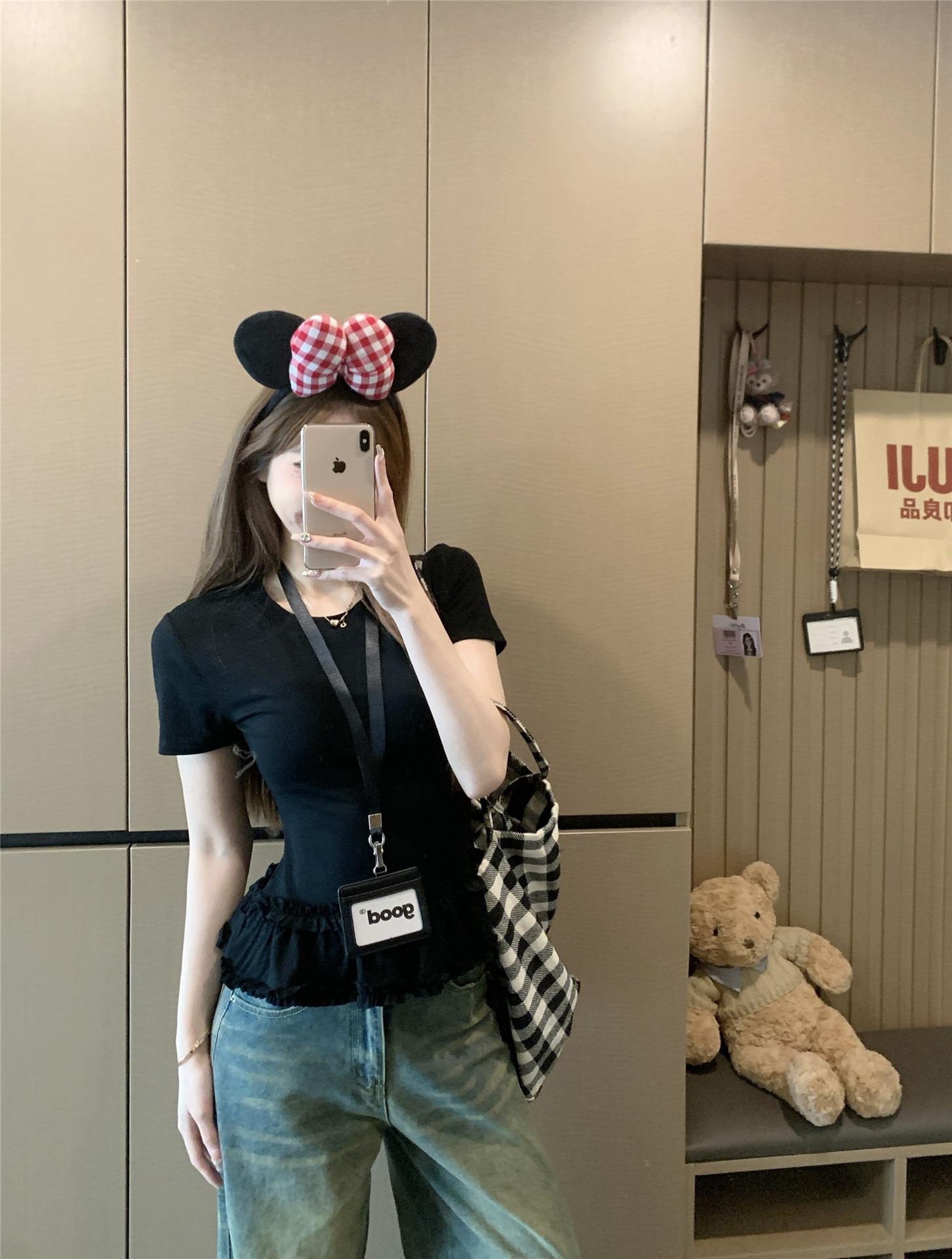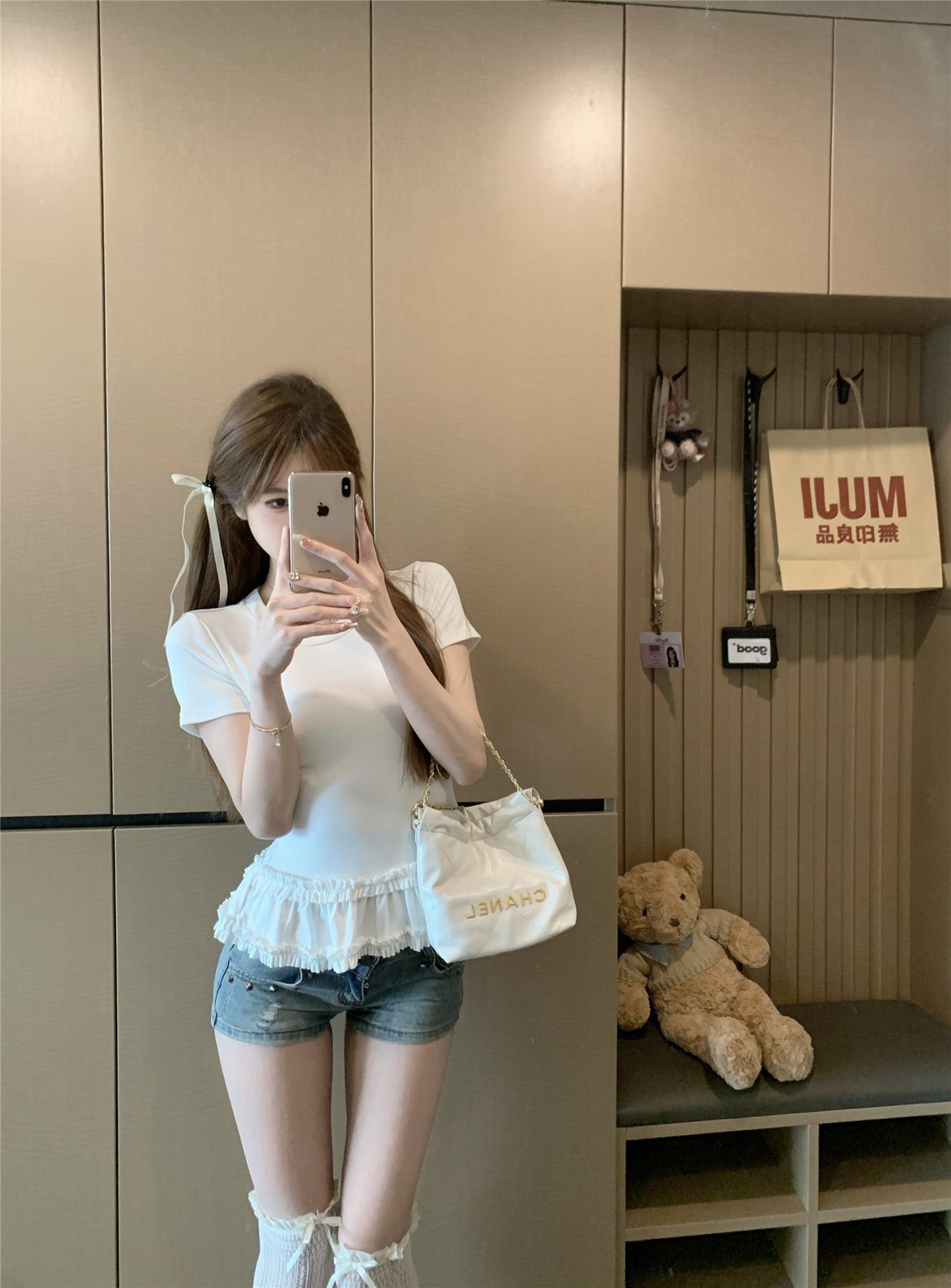 Estilo Dulce Estilo Coreano Verano Bajo con Volantes Combinable Cuello Redondo Manga Corta Diseño de Cintura Ceñida a la Moda Top Chic para Mujer