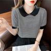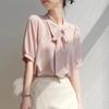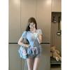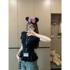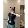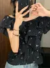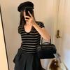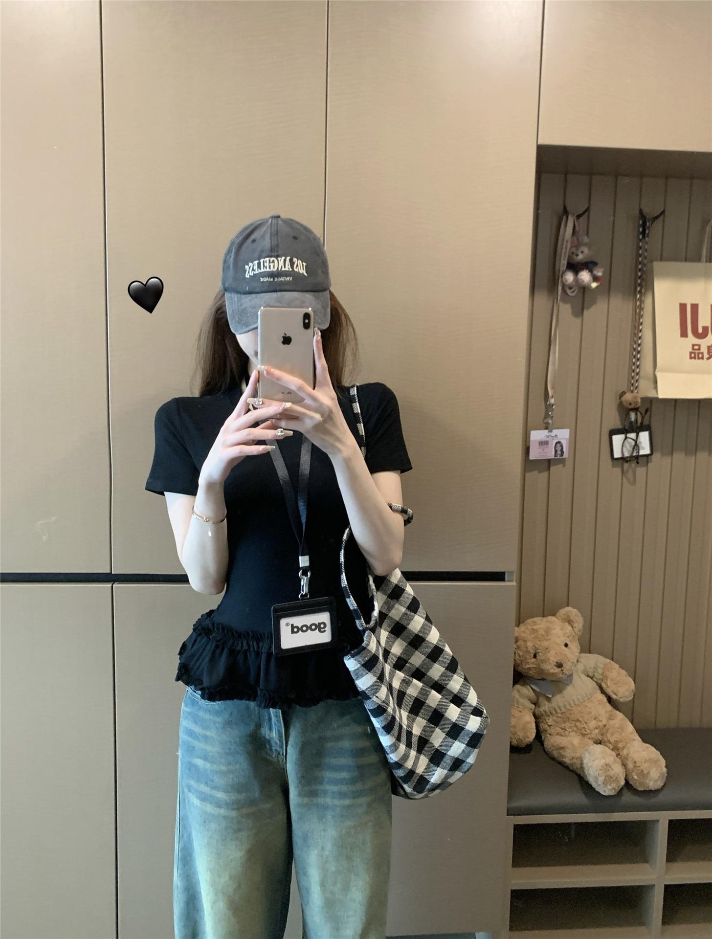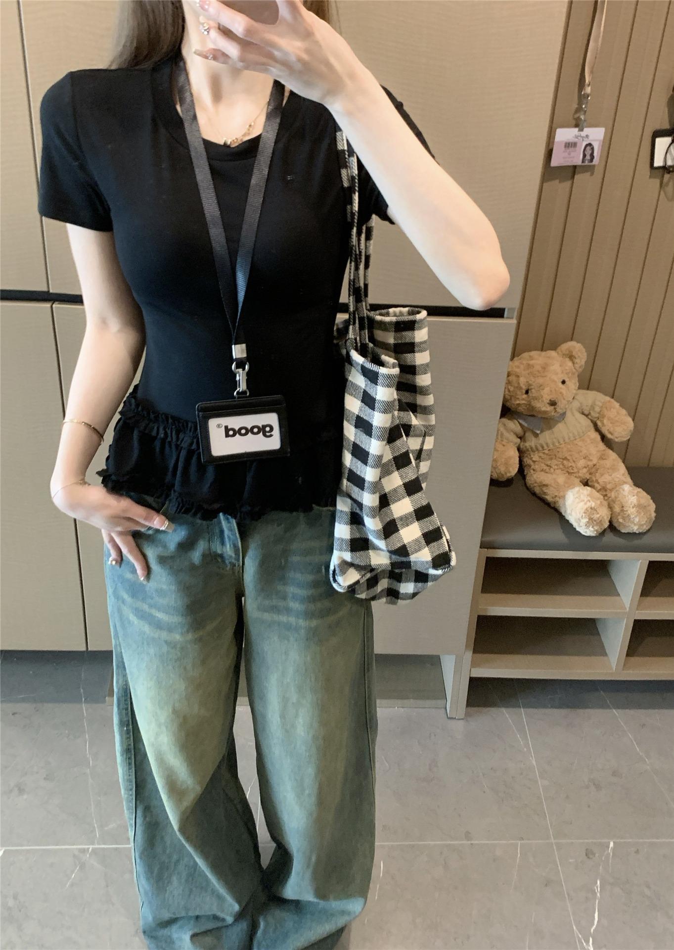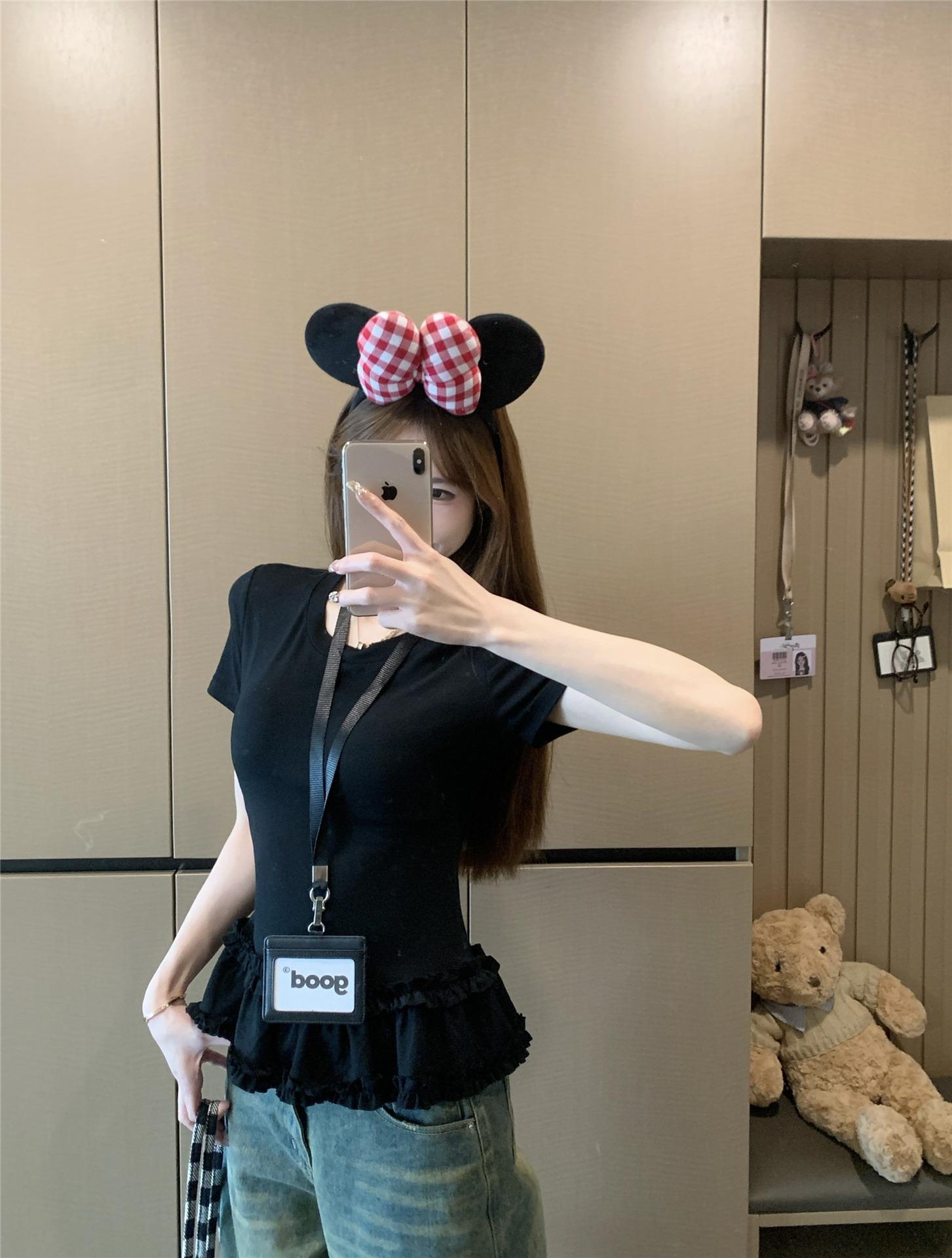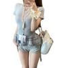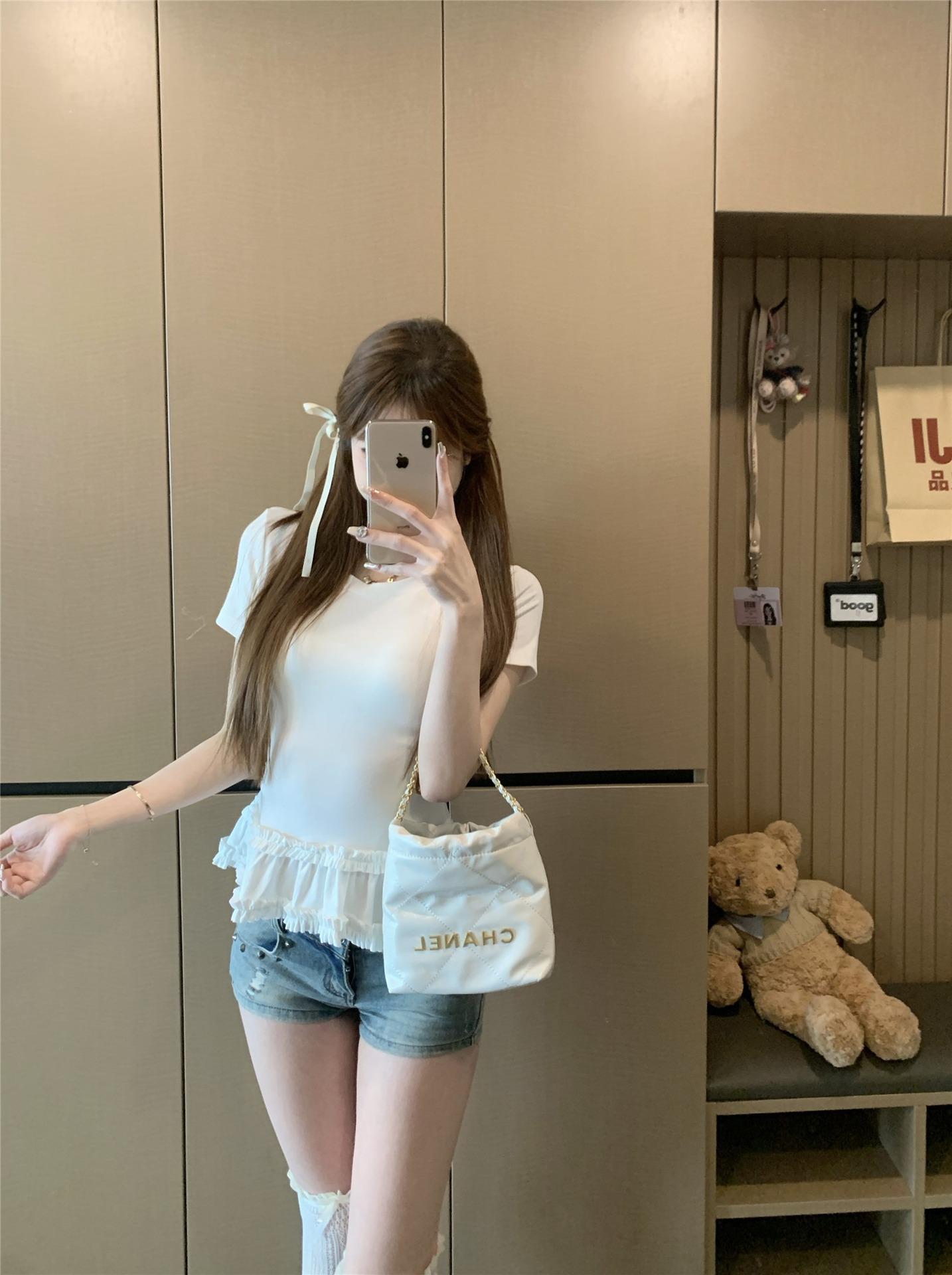 Estilo Dulce Estilo Coreano Verano Bajo con Volantes Combinable Cuello Redondo Manga Corta Diseño de Cintura Ceñida a la Moda Top Chic para Mujer