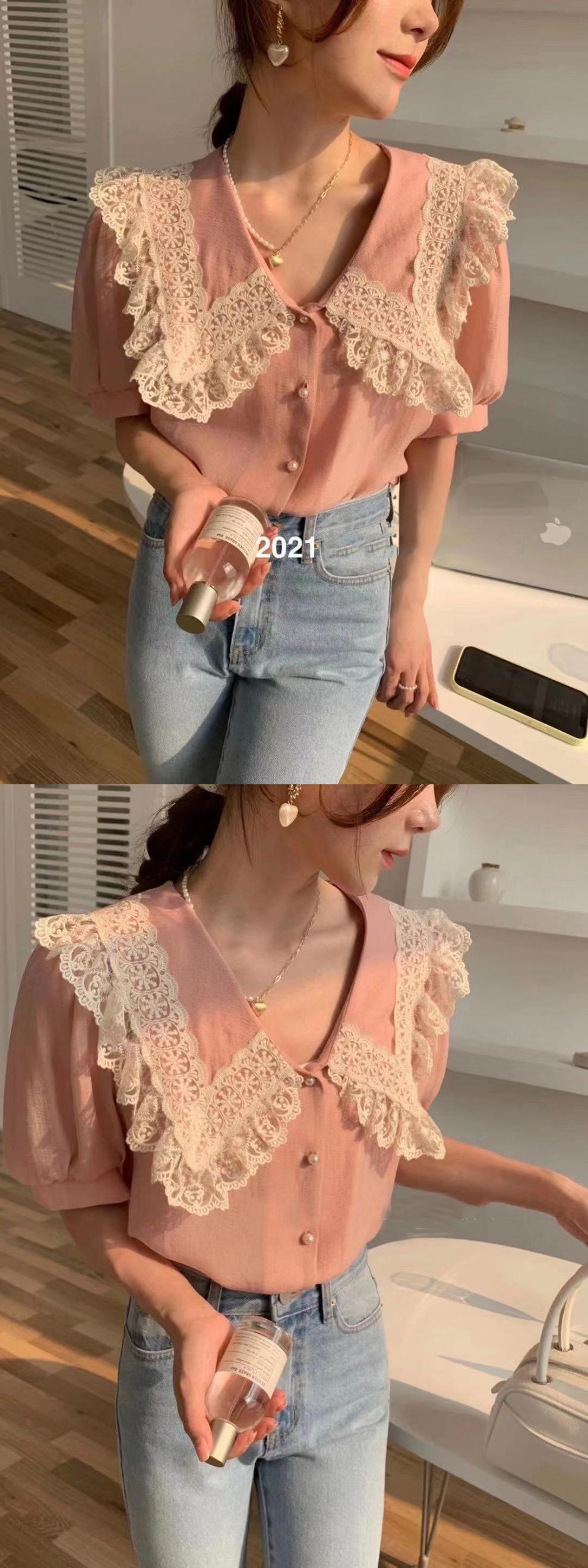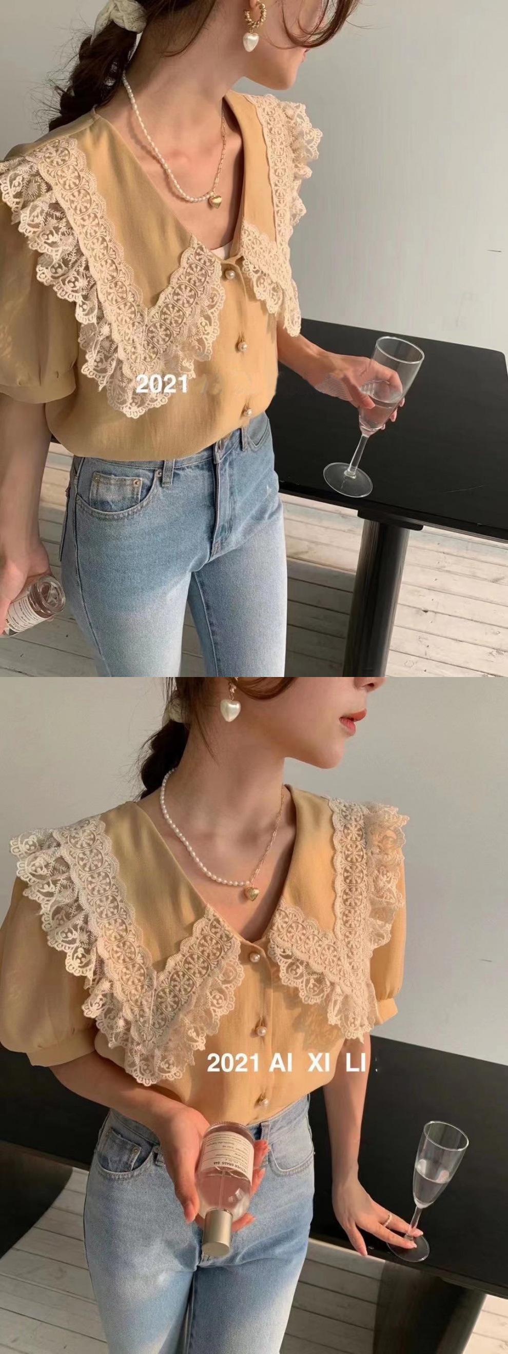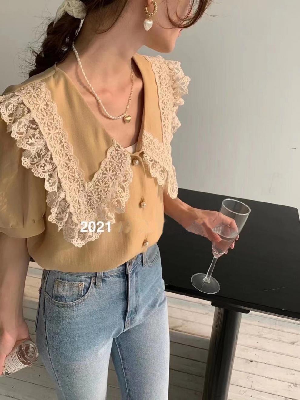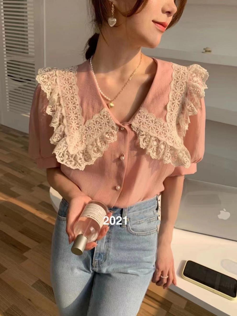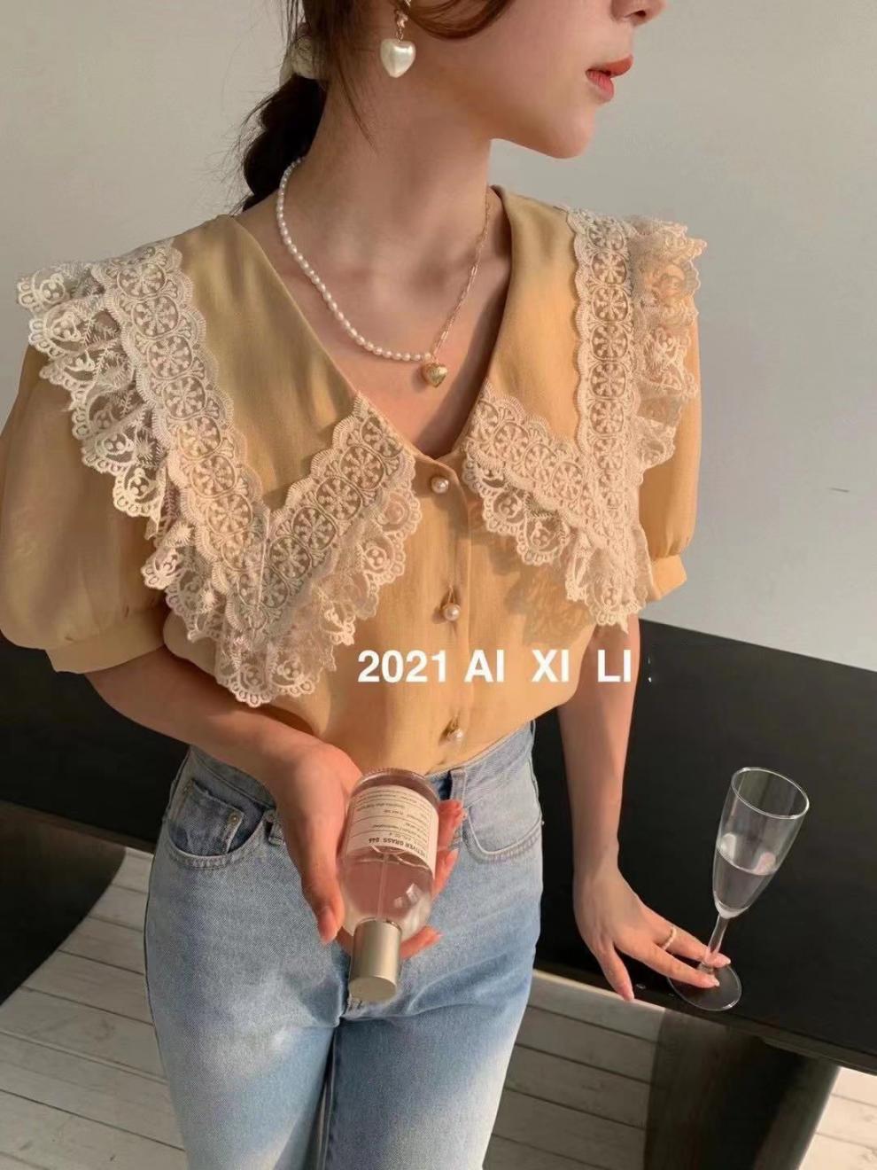 Compra Camisa de Gasa de Manga Corta con Cuello de Muñeca de Encaje Estilo Coreano Holgada Elegante Look Adelgazante 2021 Verano Nueva Tendencia Top al por mayor en Joom.pro
