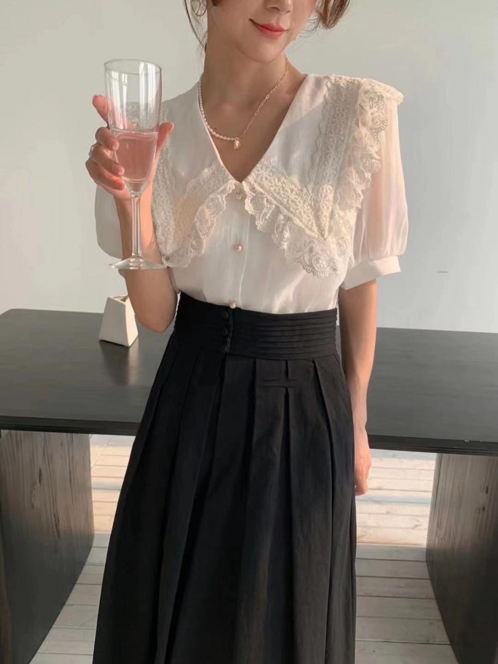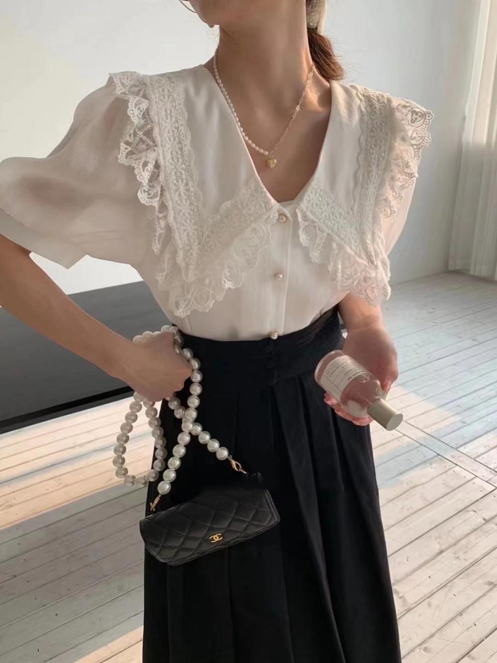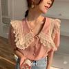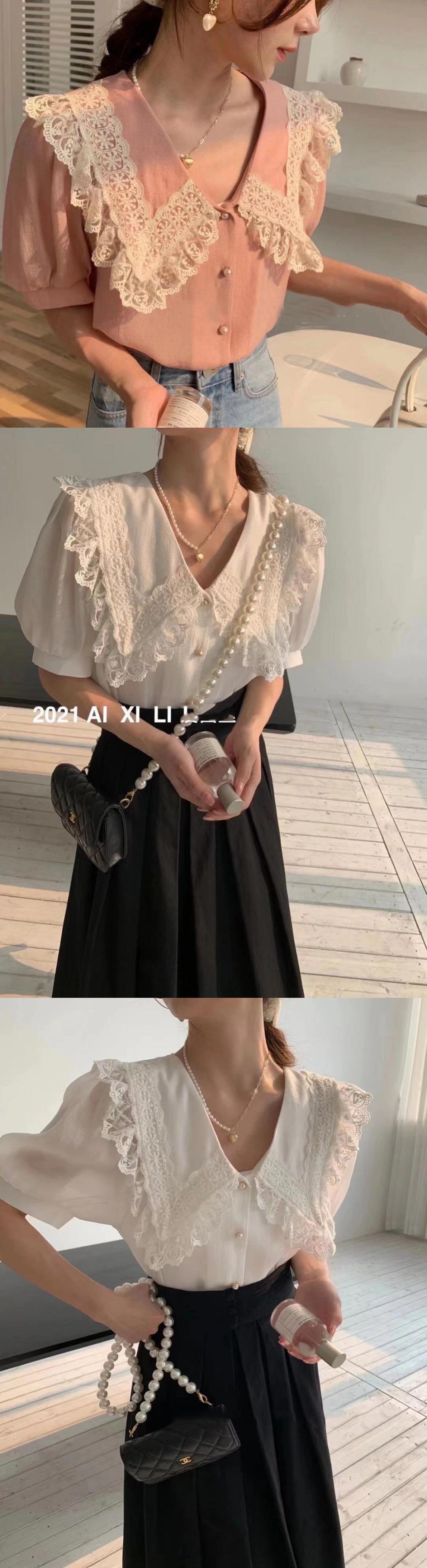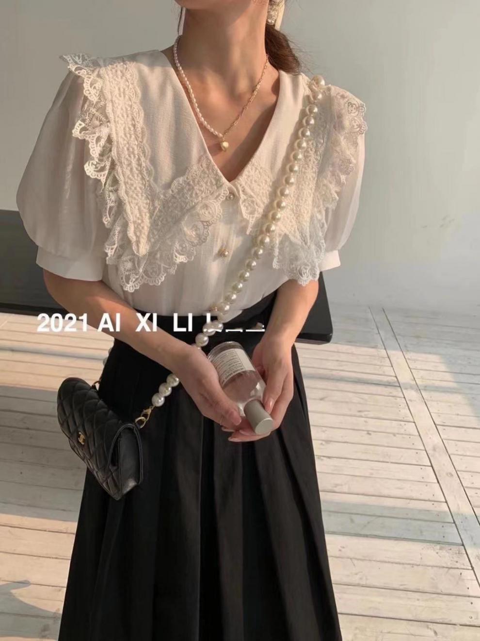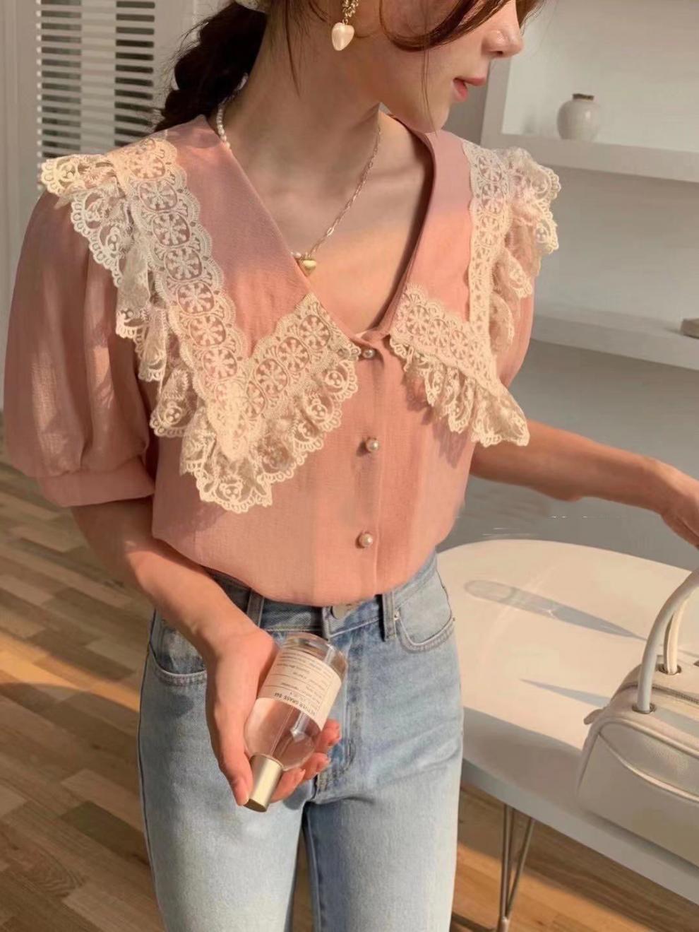 Compra Camisa de Gasa de Manga Corta con Cuello de Muñeca de Encaje Estilo Coreano Holgada Elegante Look Adelgazante 2021 Verano Nueva Tendencia Top al por mayor en Joom.pro