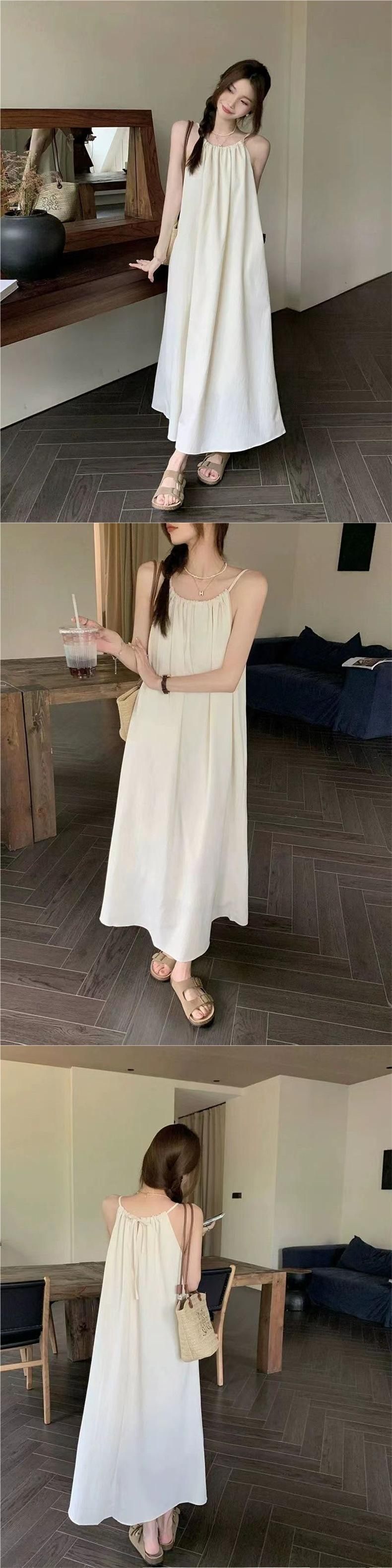 Nuevo Vestido Francés de Estilo Suave con Tirantes Halter Holgado Cubriendo Carne Adelgazante Minoritario Pequeño Estilo Perezoso Vestido Largo Versátil