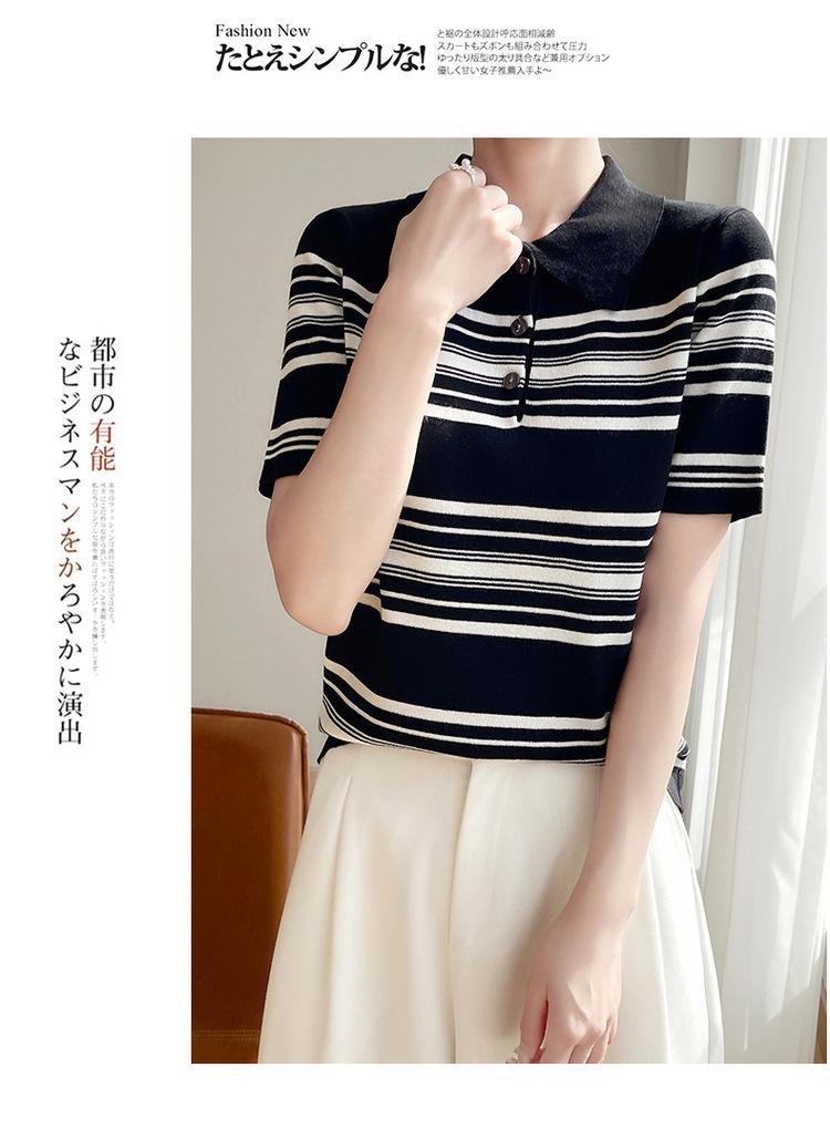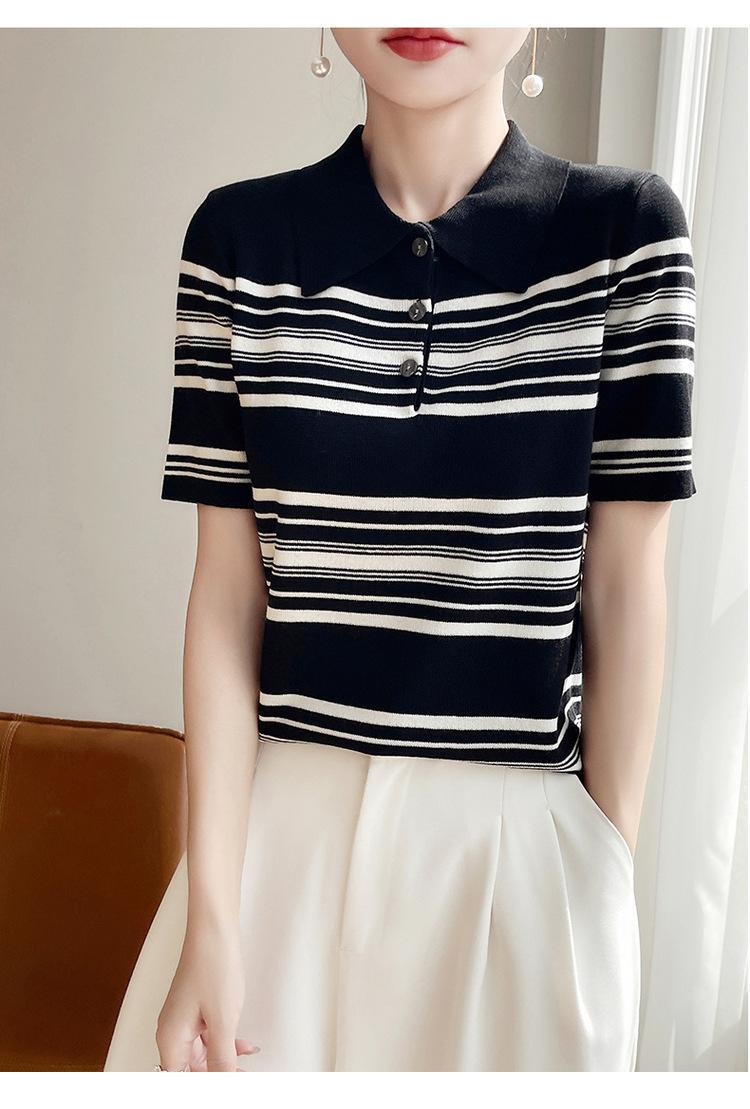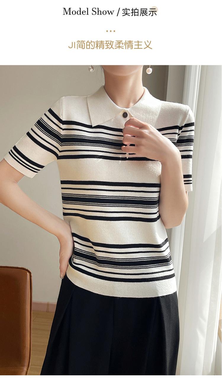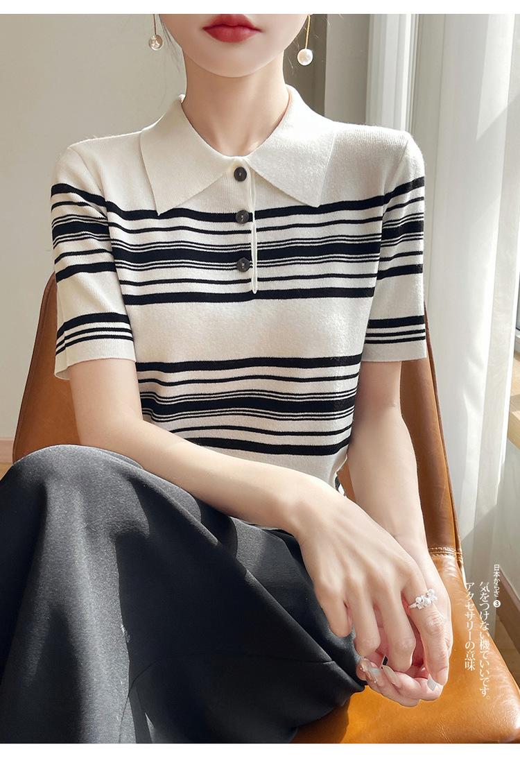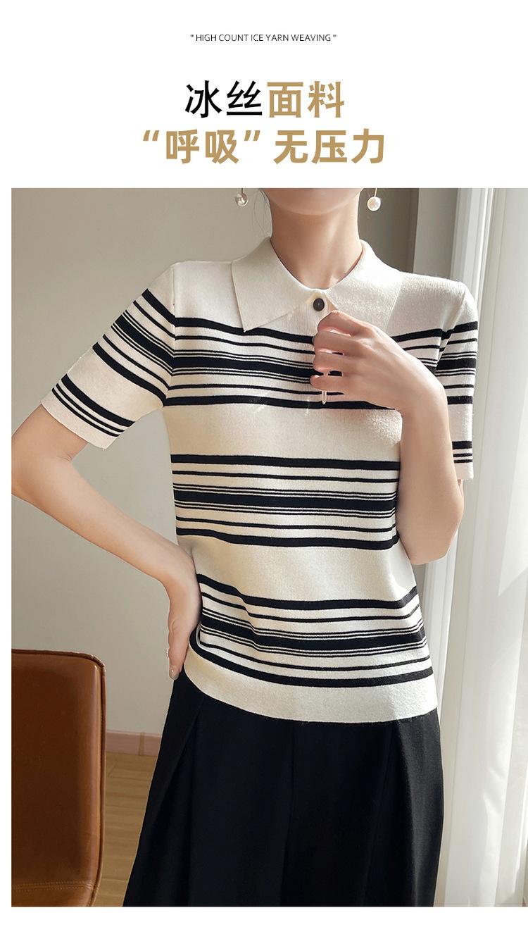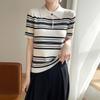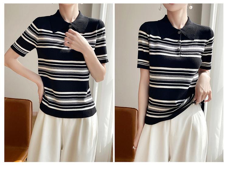 2025 Verano Nuevo Seda de Hielo Camisa Tejida con Cuello POLO Camiseta de Manga Corta para Mujer Rayada con Combinación de Colores Elegante Jersey Top