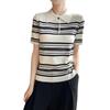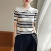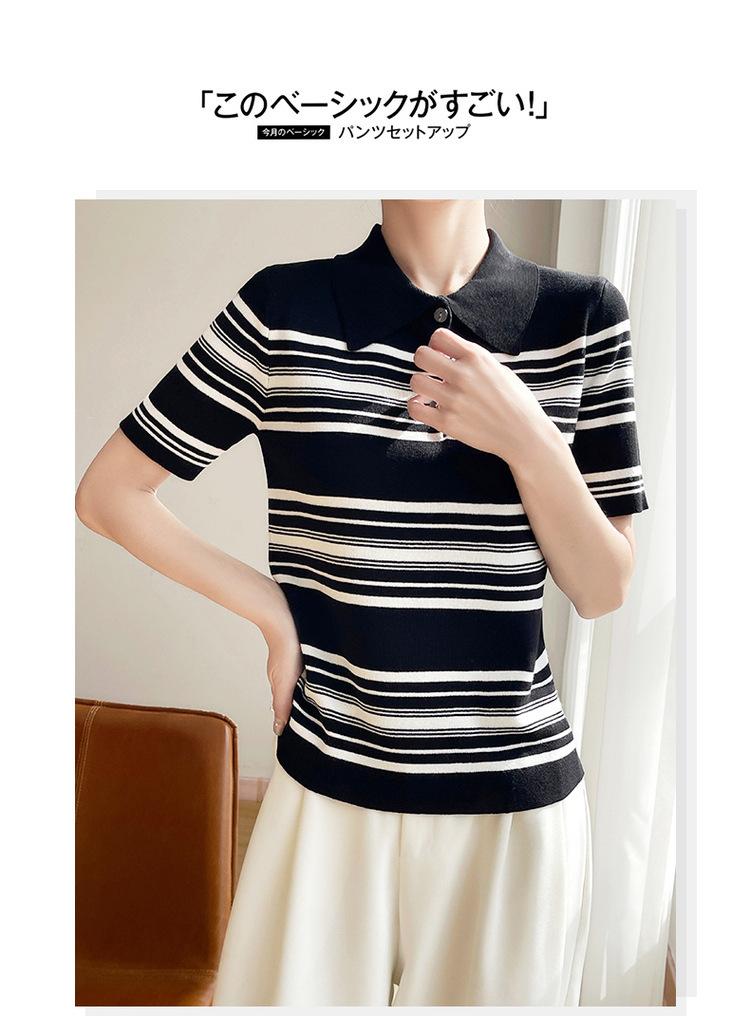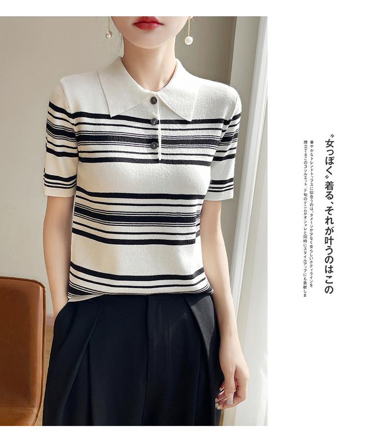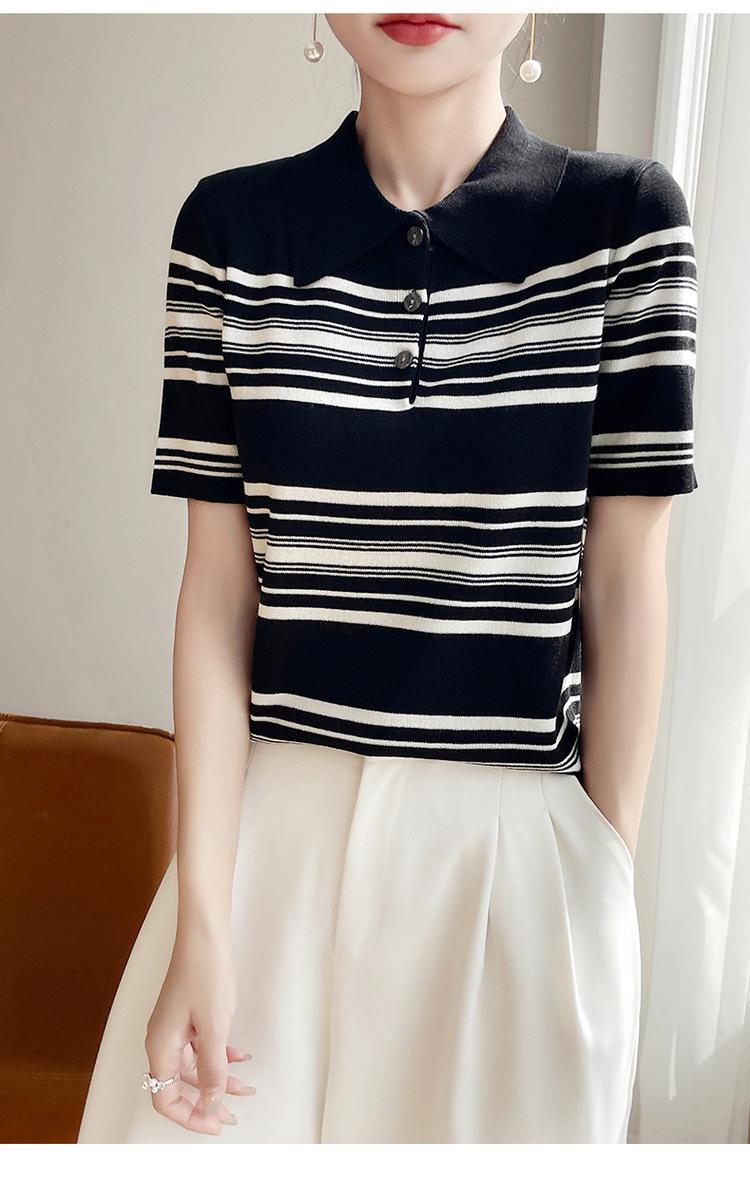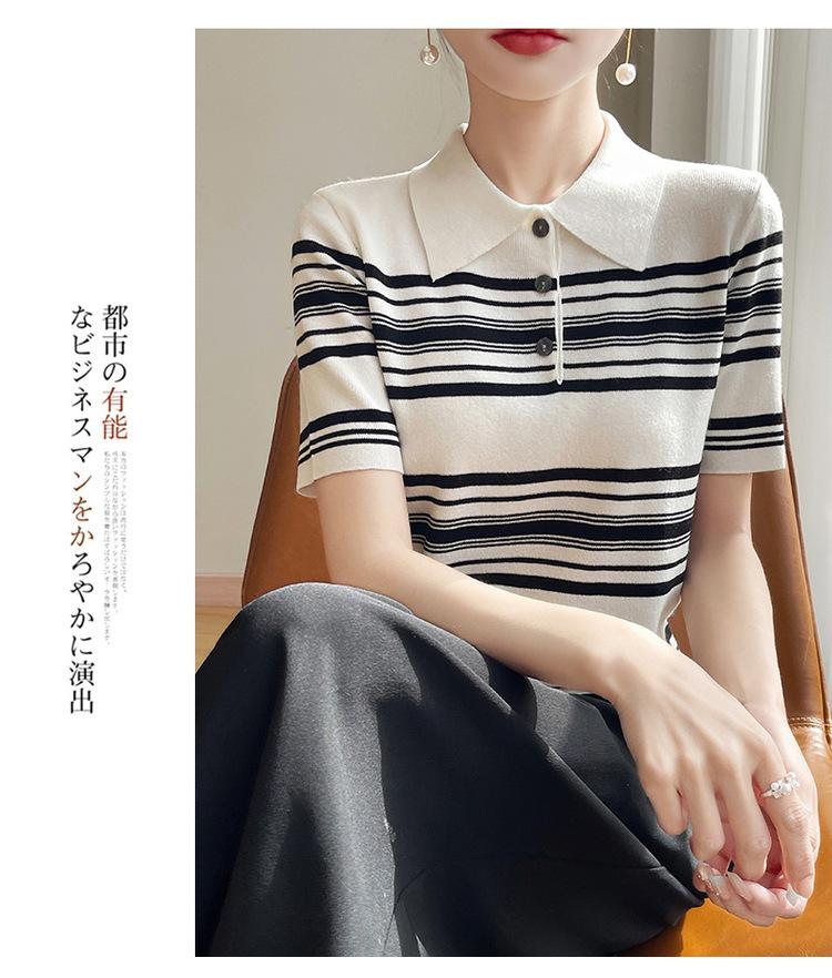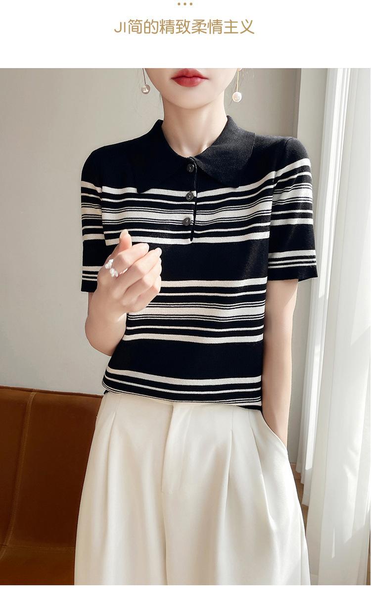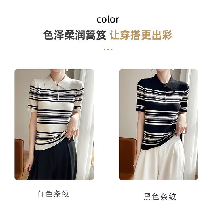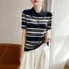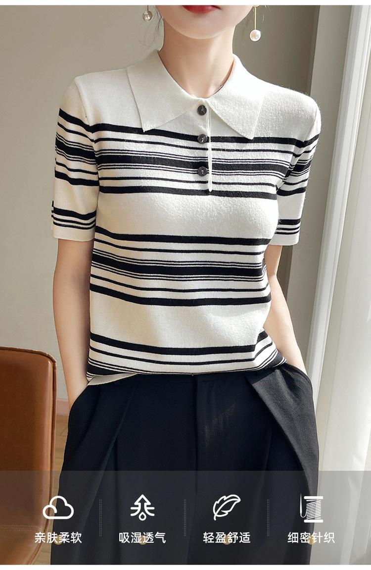 2025 Verano Nuevo Seda de Hielo Camisa Tejida con Cuello POLO Camiseta de Manga Corta para Mujer Rayada con Combinación de Colores Elegante Jersey Top