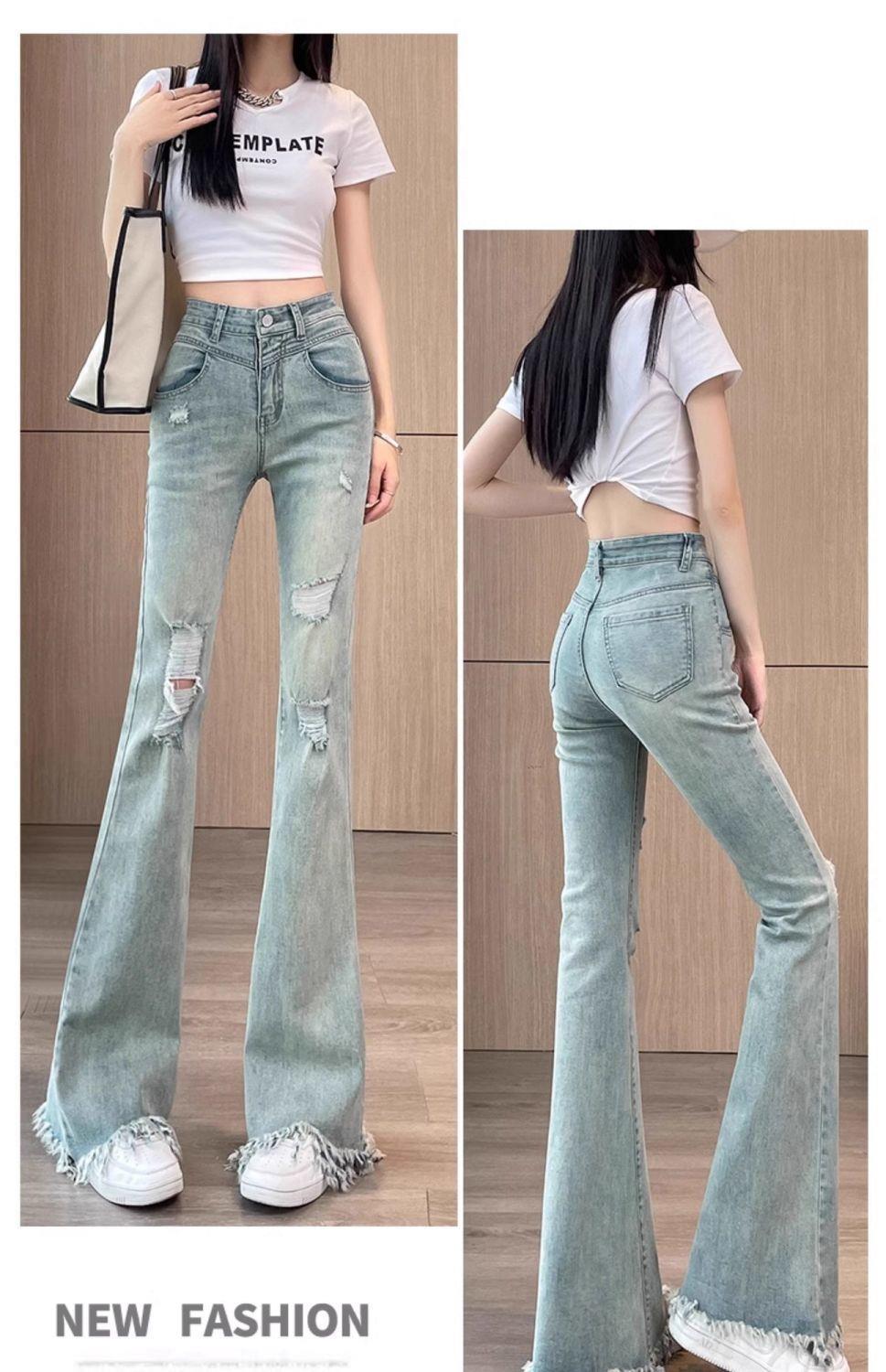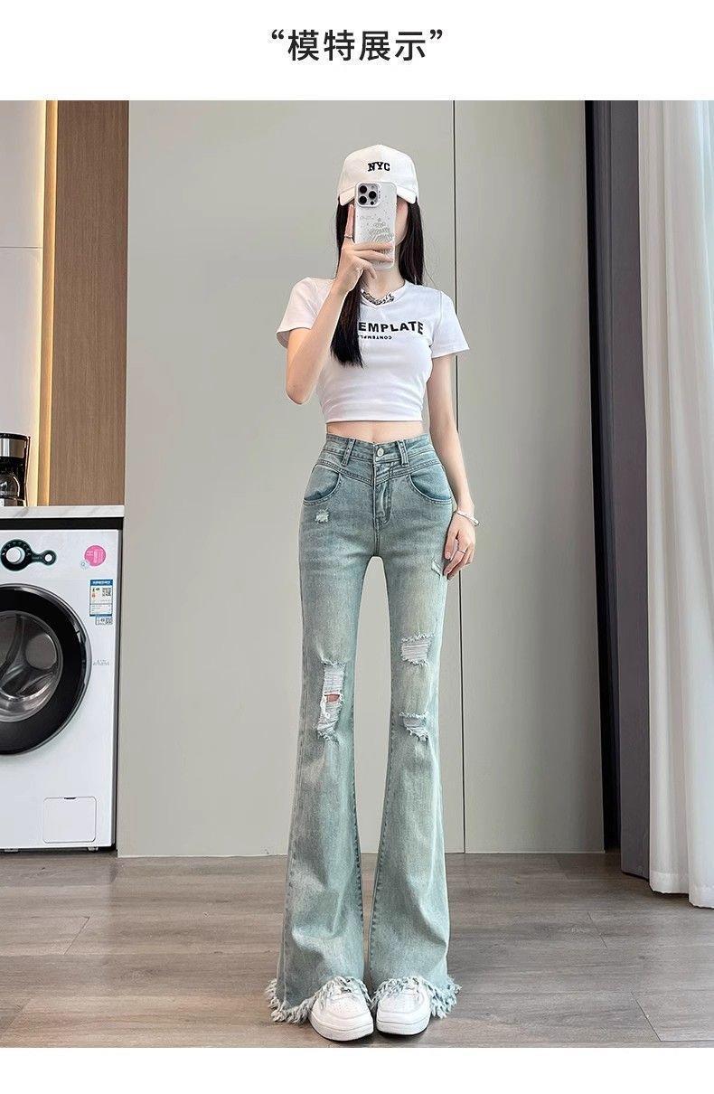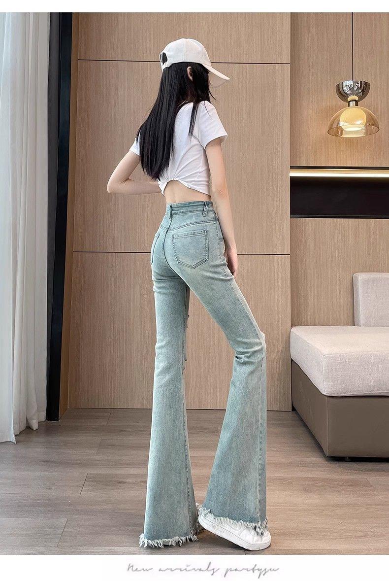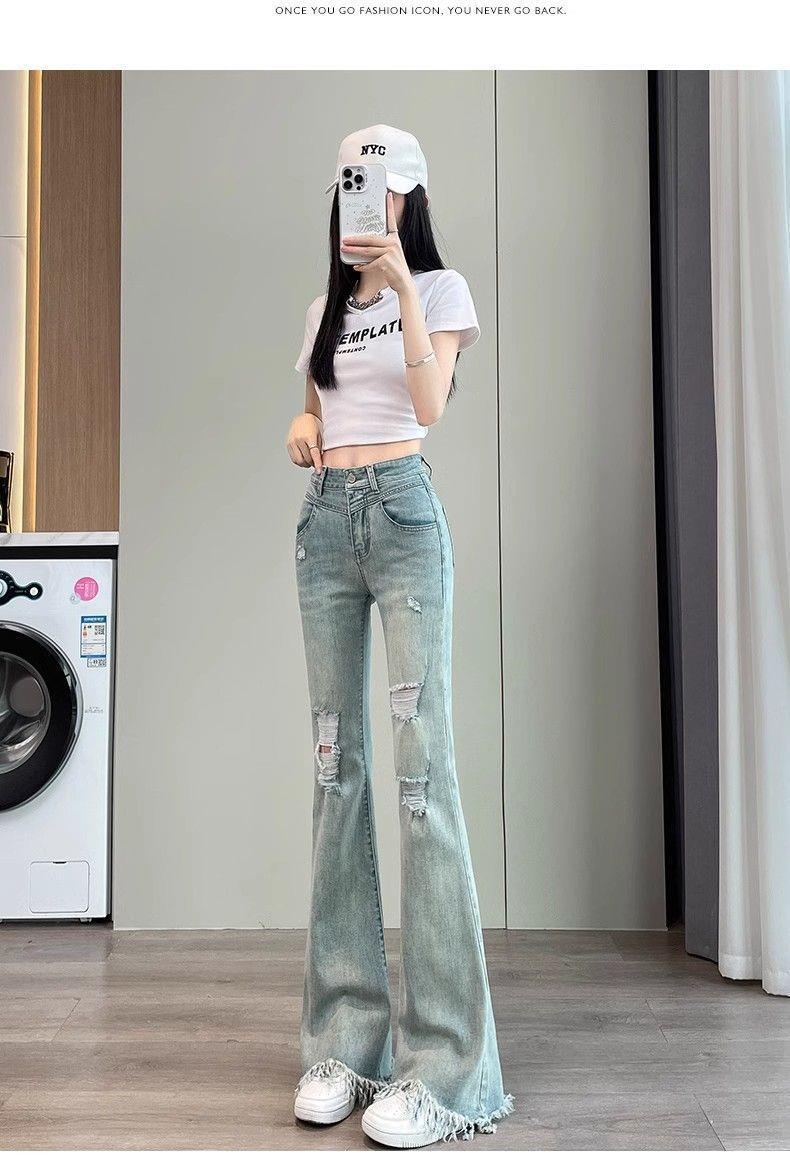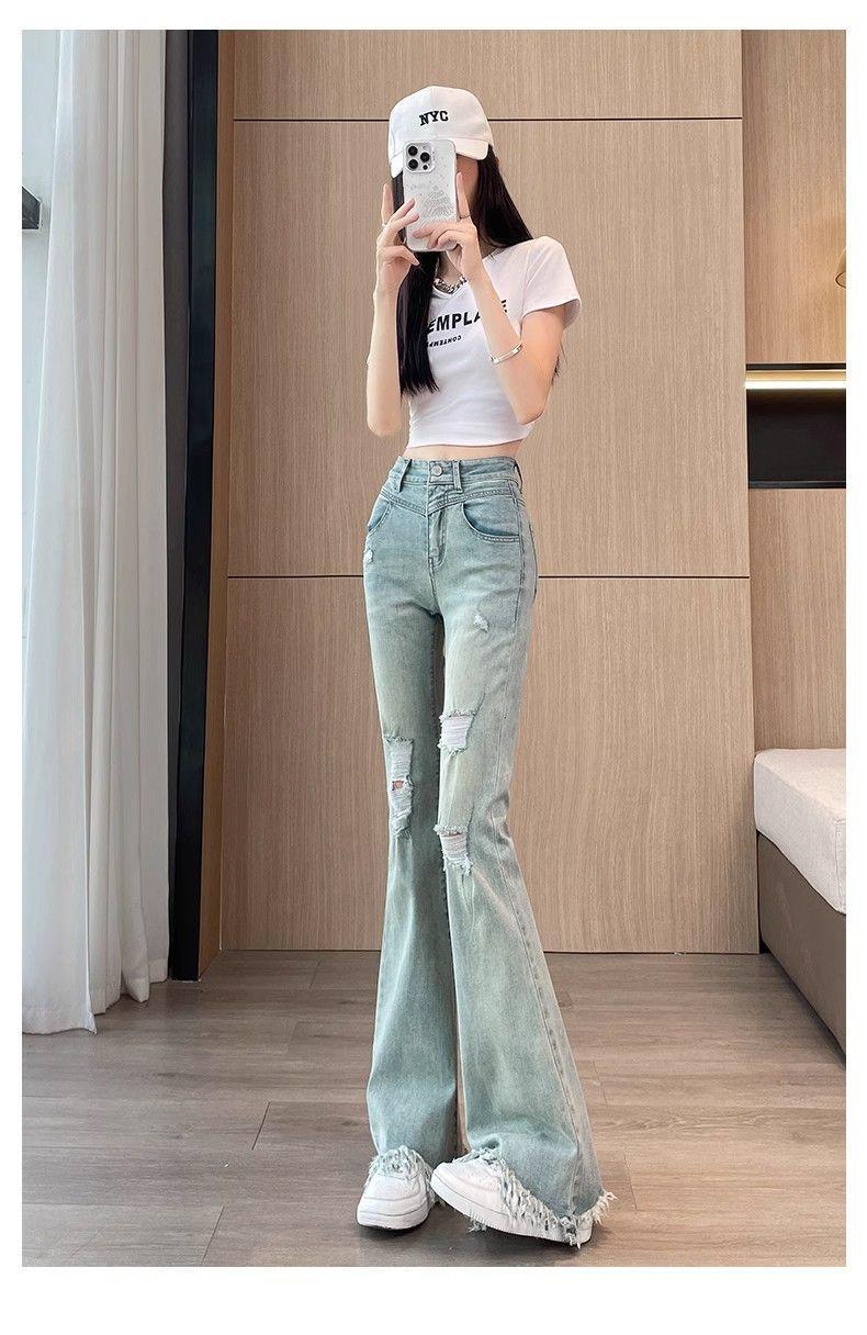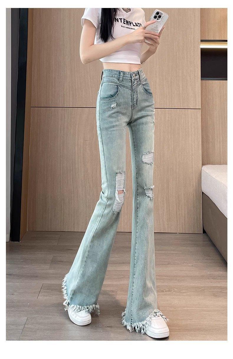 Jeans Rotos de Cintura Alta en Color Claro para Mujer Primavera y Verano 2025 Nuevo Pantalón Acampanado Delgado de Orilla Cruda