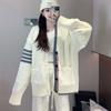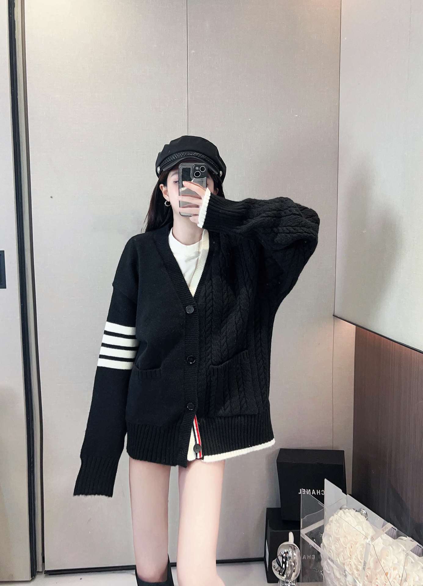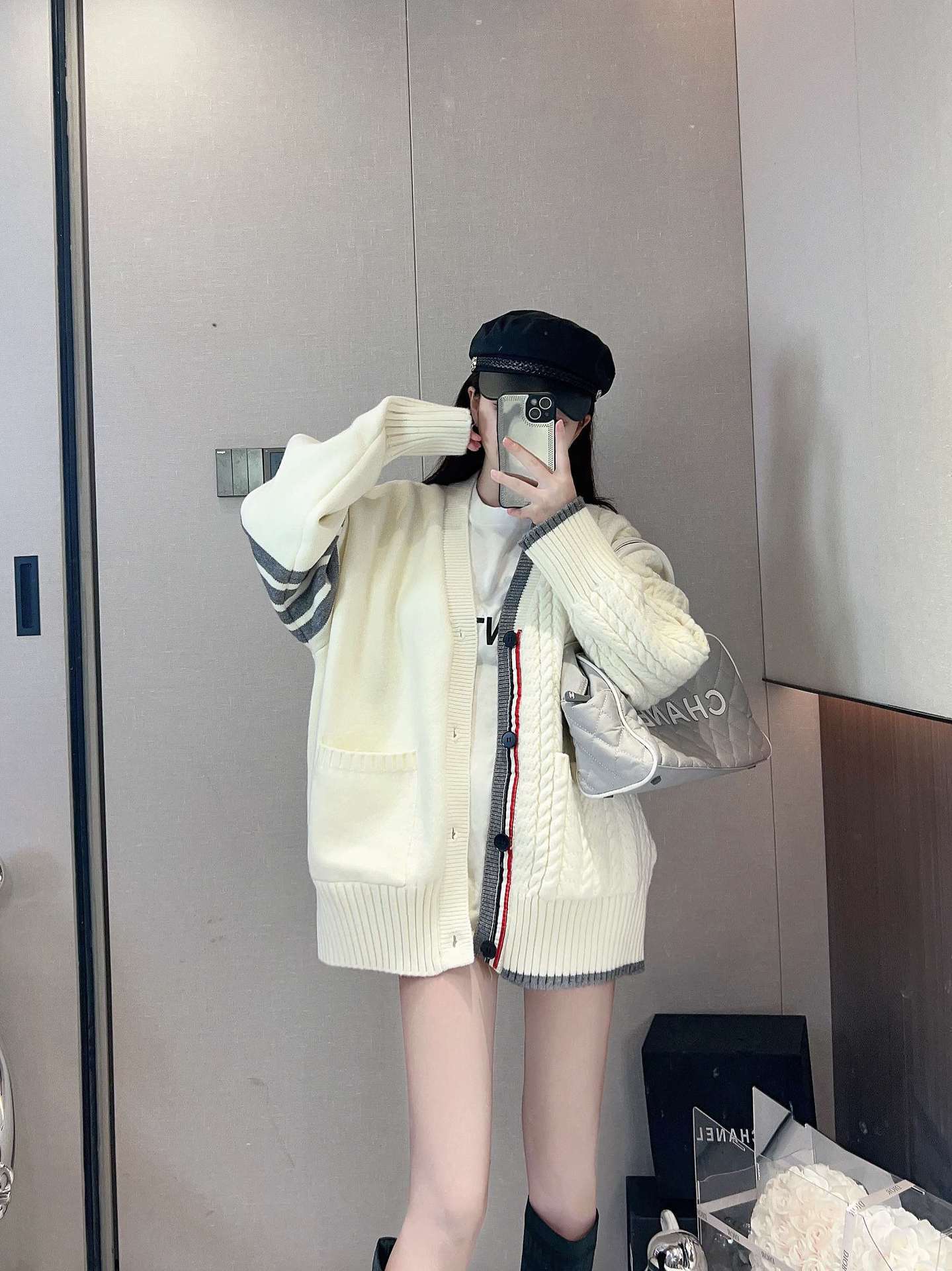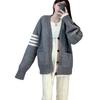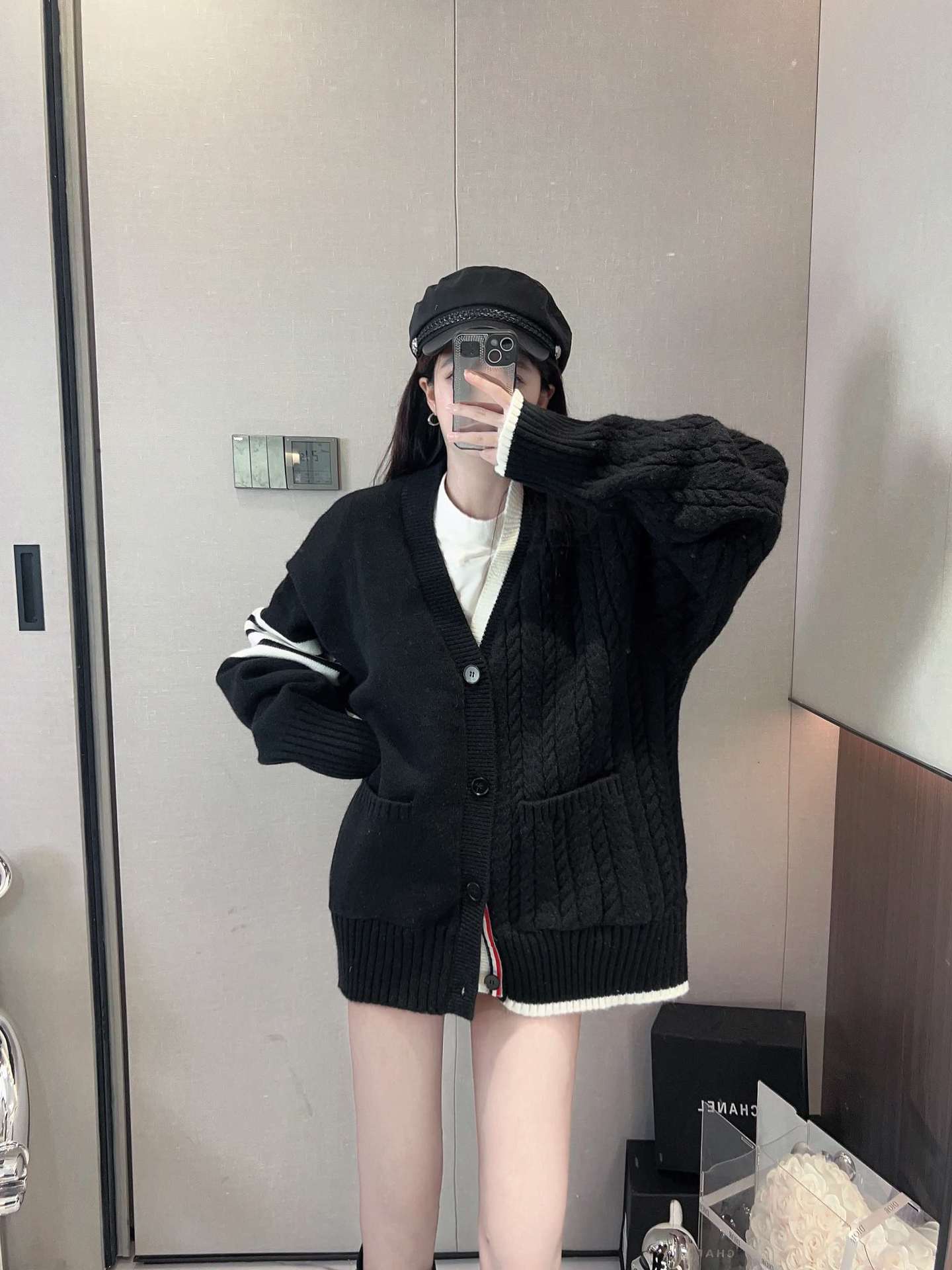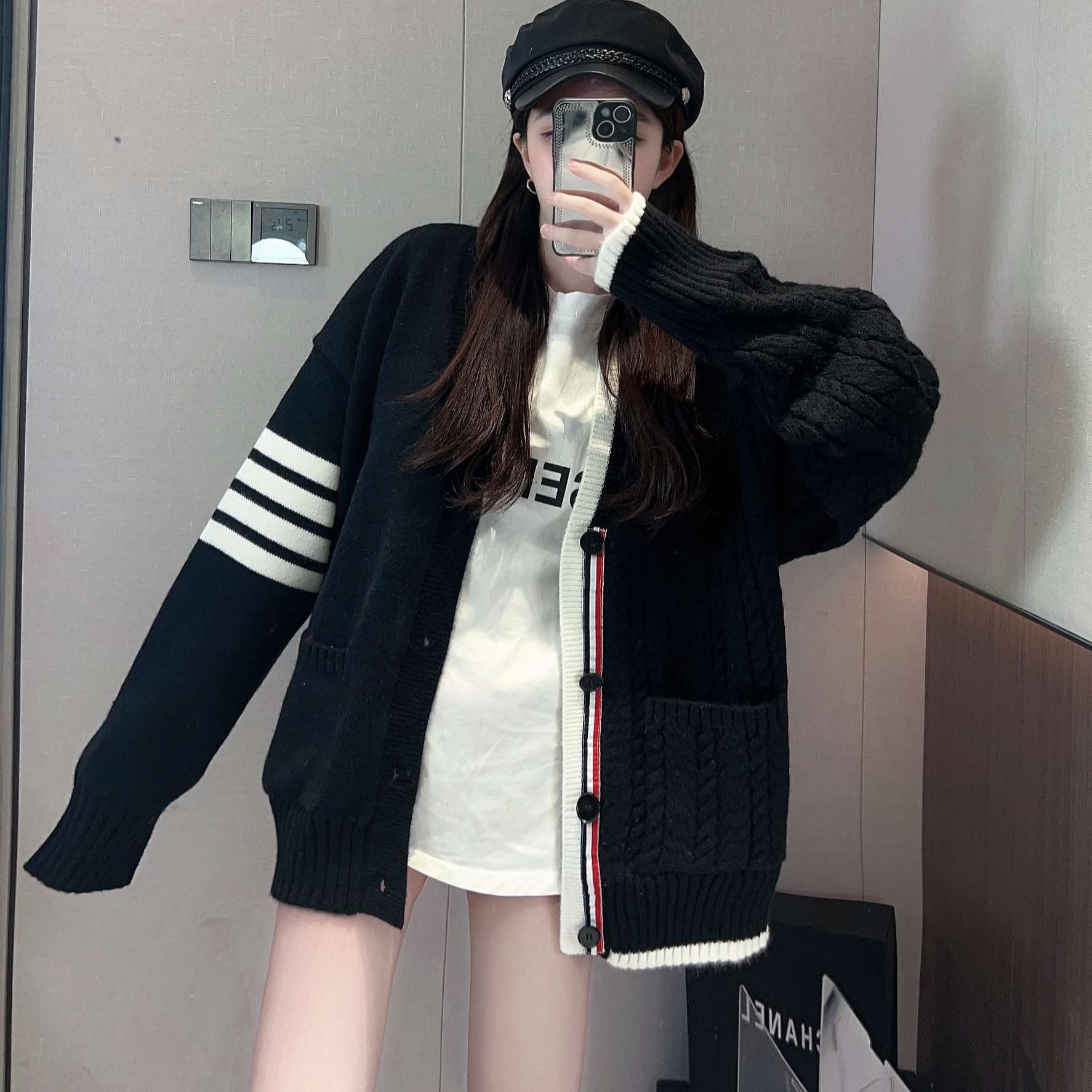 Cárdigan de Punto con Cuello en V de Color Contrastante para Mujer 2025 Principios de Otoño Nuevo Estilo Holgado y Relajado Chaqueta Suéter de Manga Larga