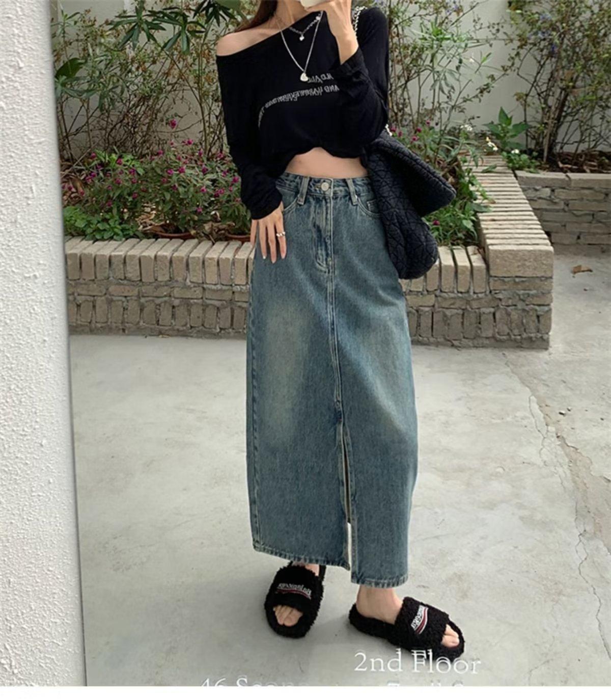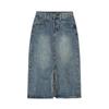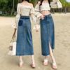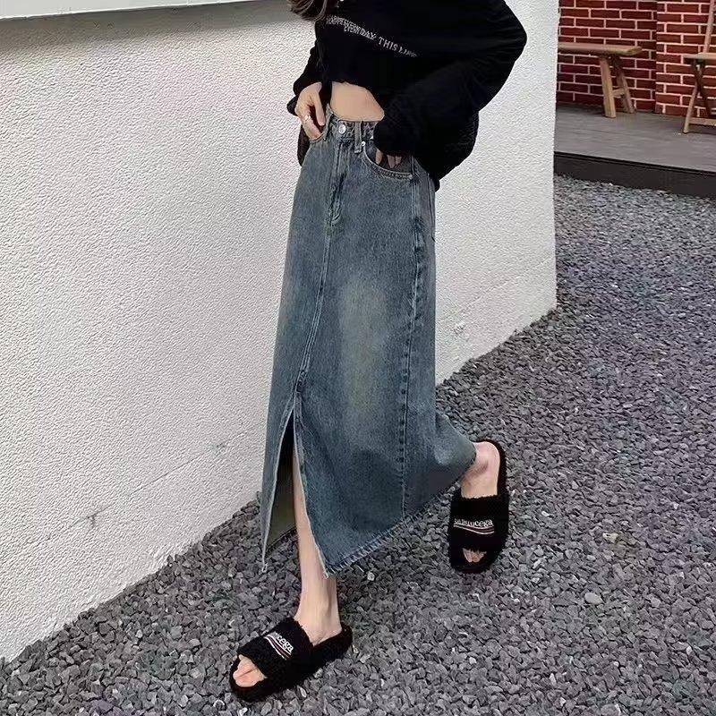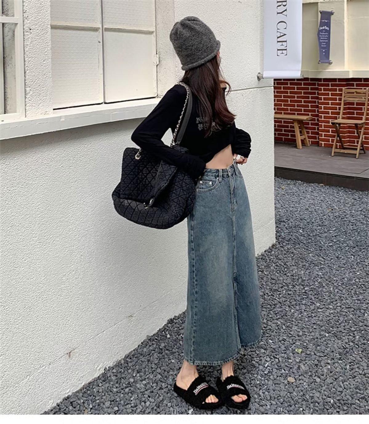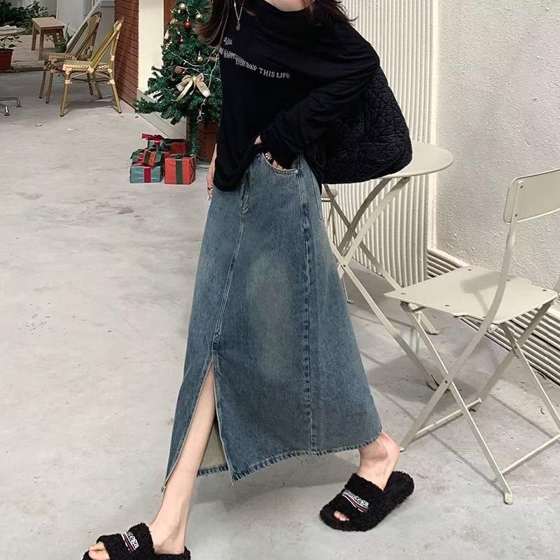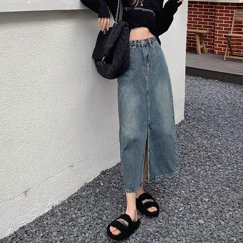 Falda de mezclilla retro para mujer Primavera y Otoño 2025 Nueva Falda larga A-line ajustada de largo medio de verano Falda con abertura