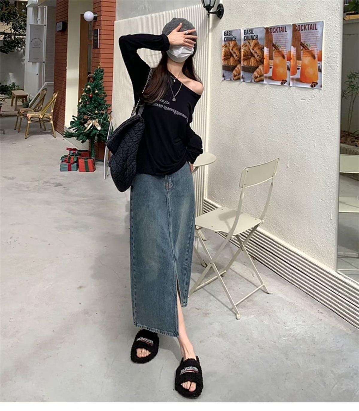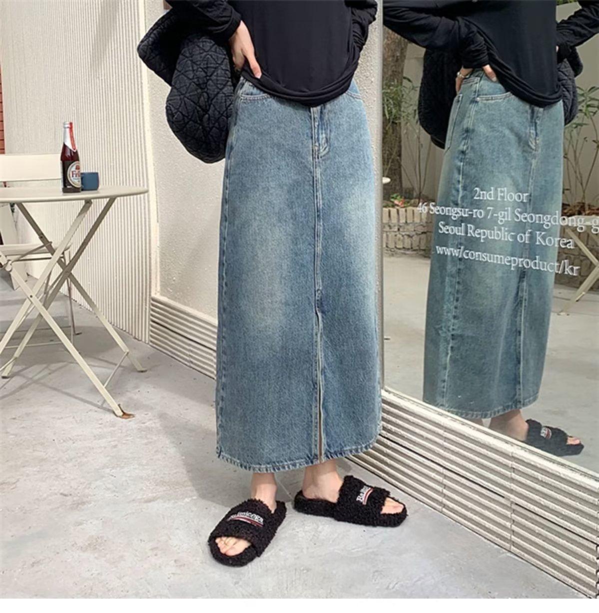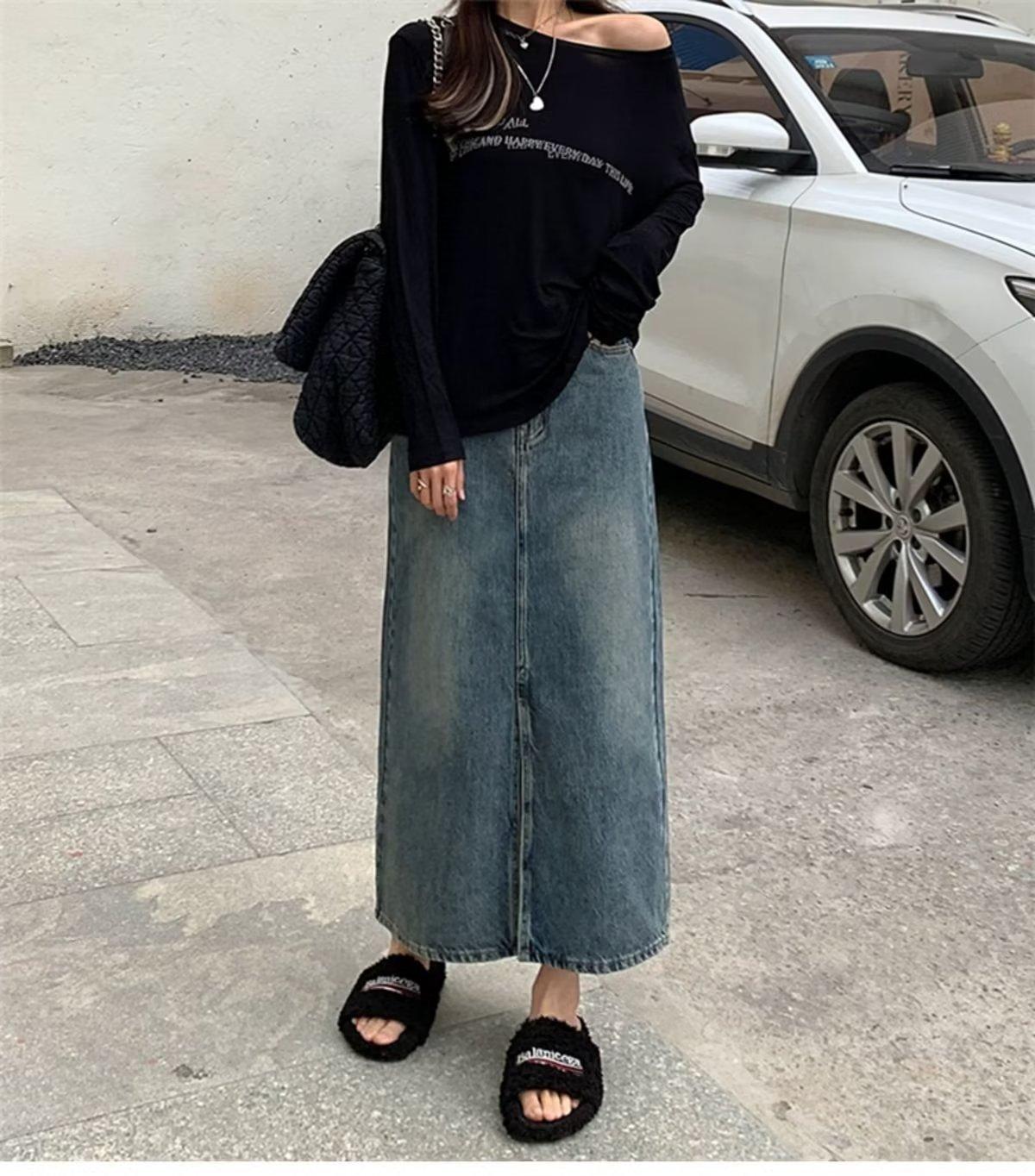 Falda de mezclilla retro para mujer Primavera y Otoño 2025 Nueva Falda larga A-line ajustada de largo medio de verano Falda con abertura