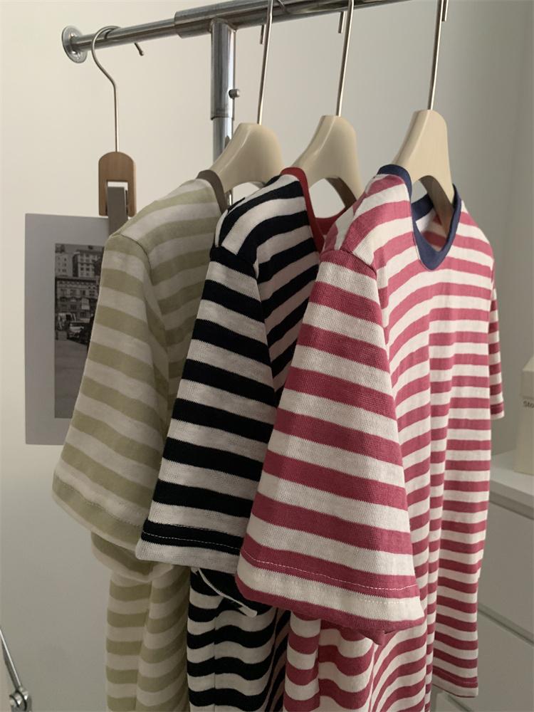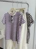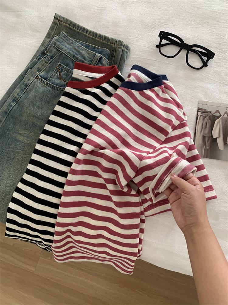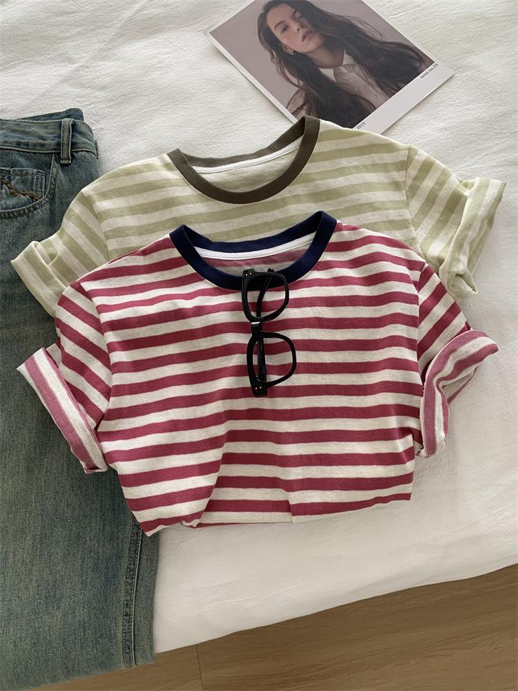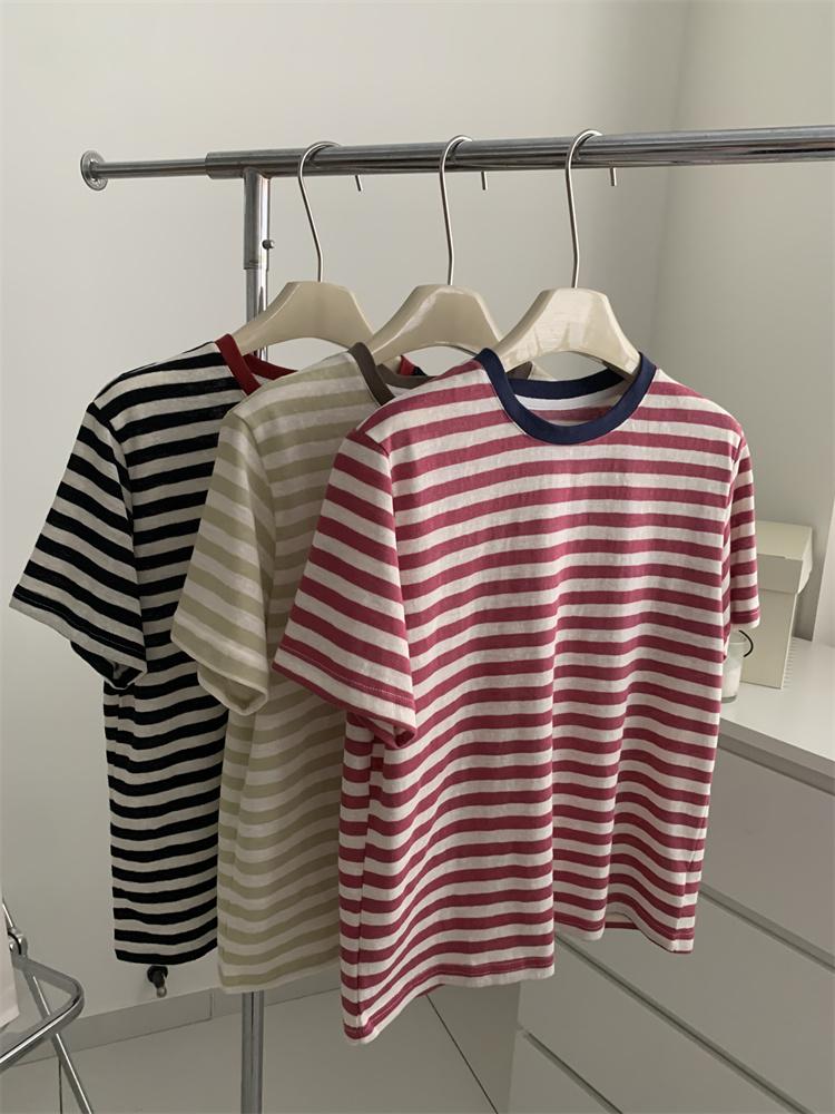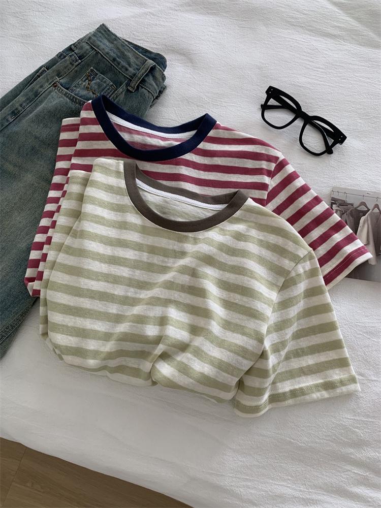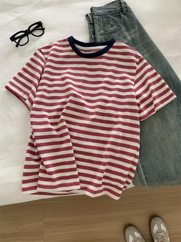 Camiseta Corta de Verano para Mujer de Algodón Copo de Nieve Fino Estilo Coreano con Cuello Redondo a Rayas Rosa Frambuesa Blanco Manga Corta Hombro Derecho