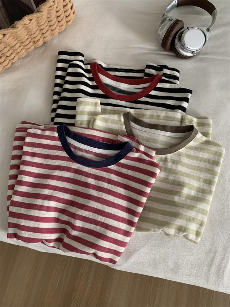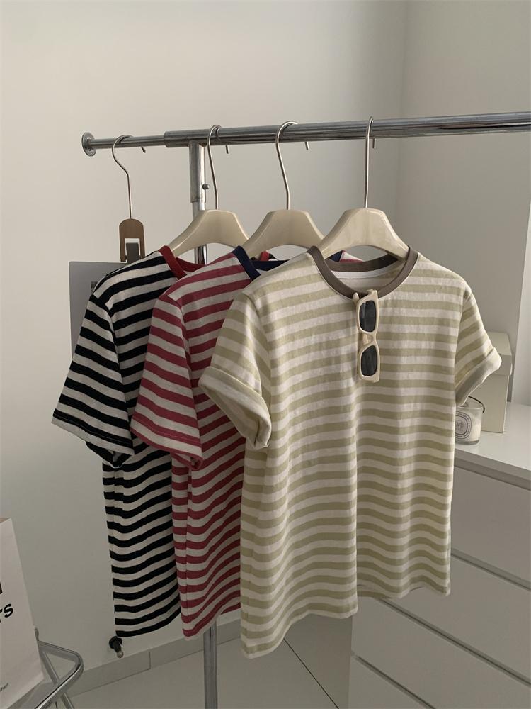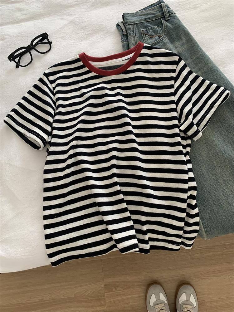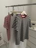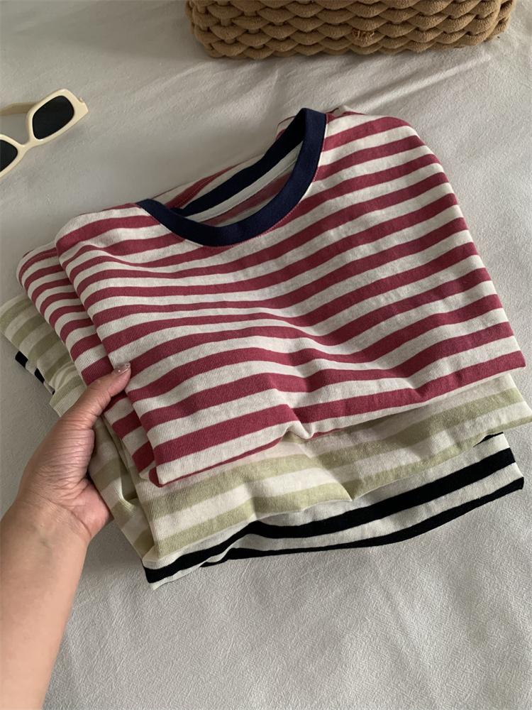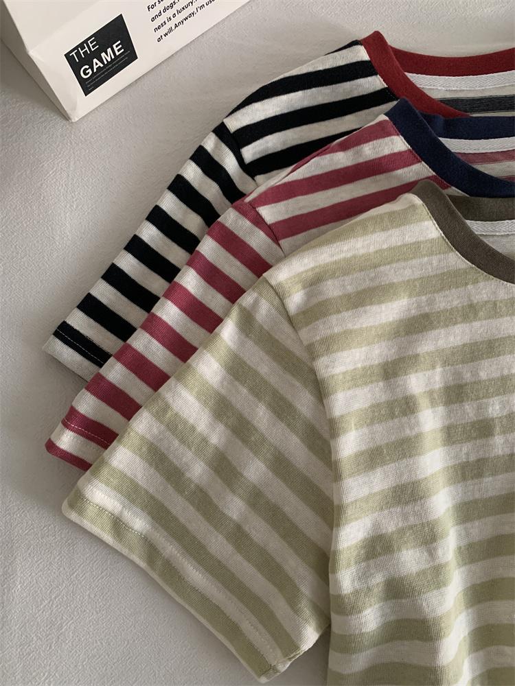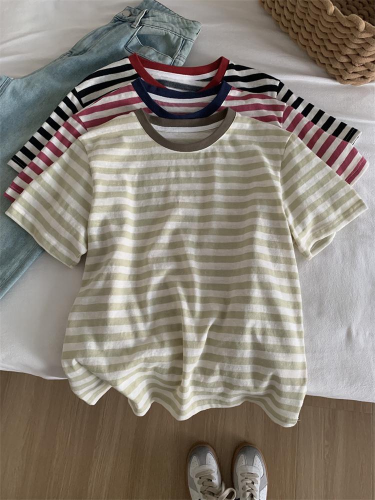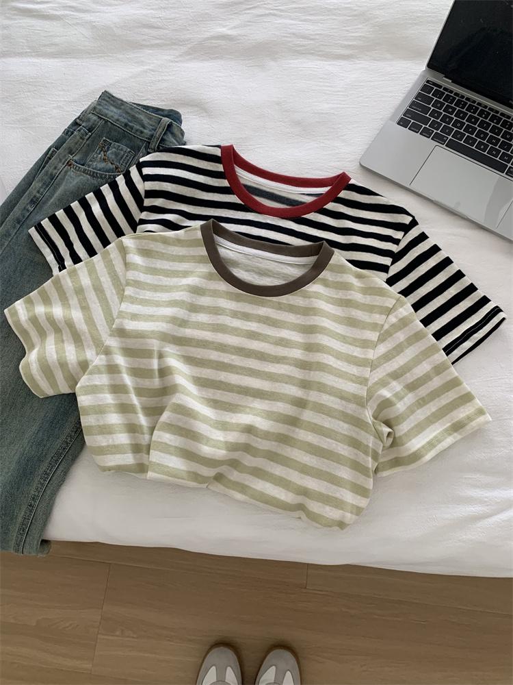 Camiseta Corta de Verano para Mujer de Algodón Copo de Nieve Fino Estilo Coreano con Cuello Redondo a Rayas Rosa Frambuesa Blanco Manga Corta Hombro Derecho