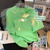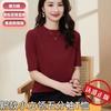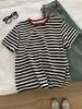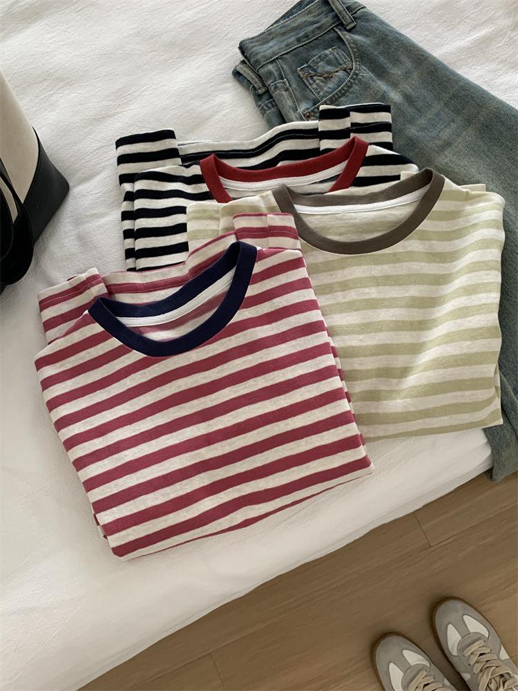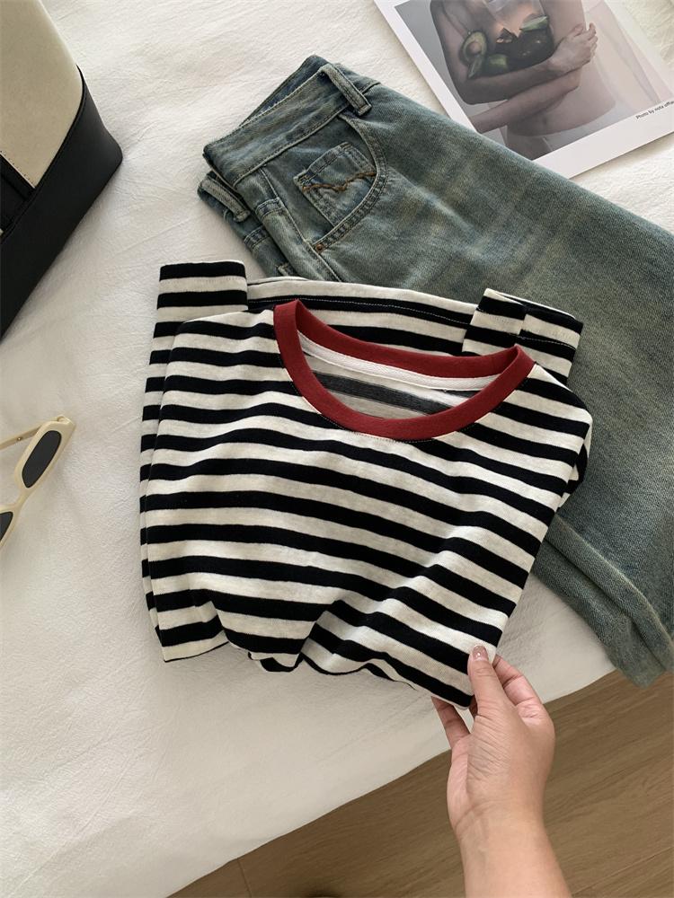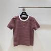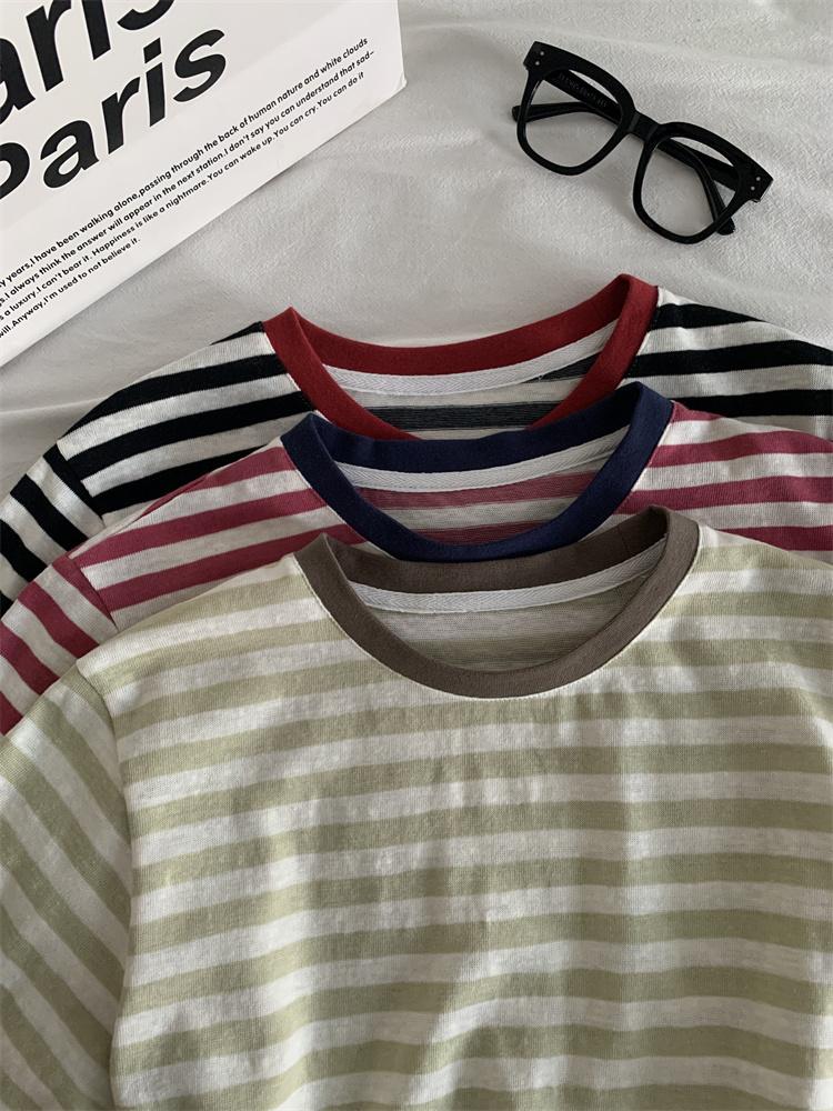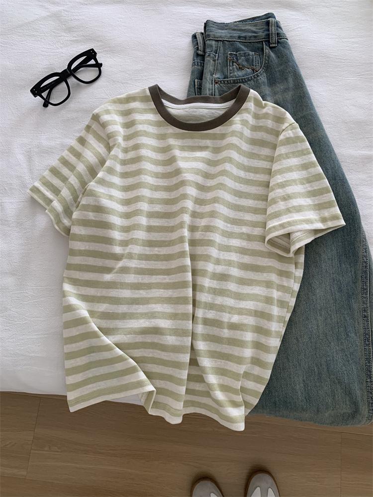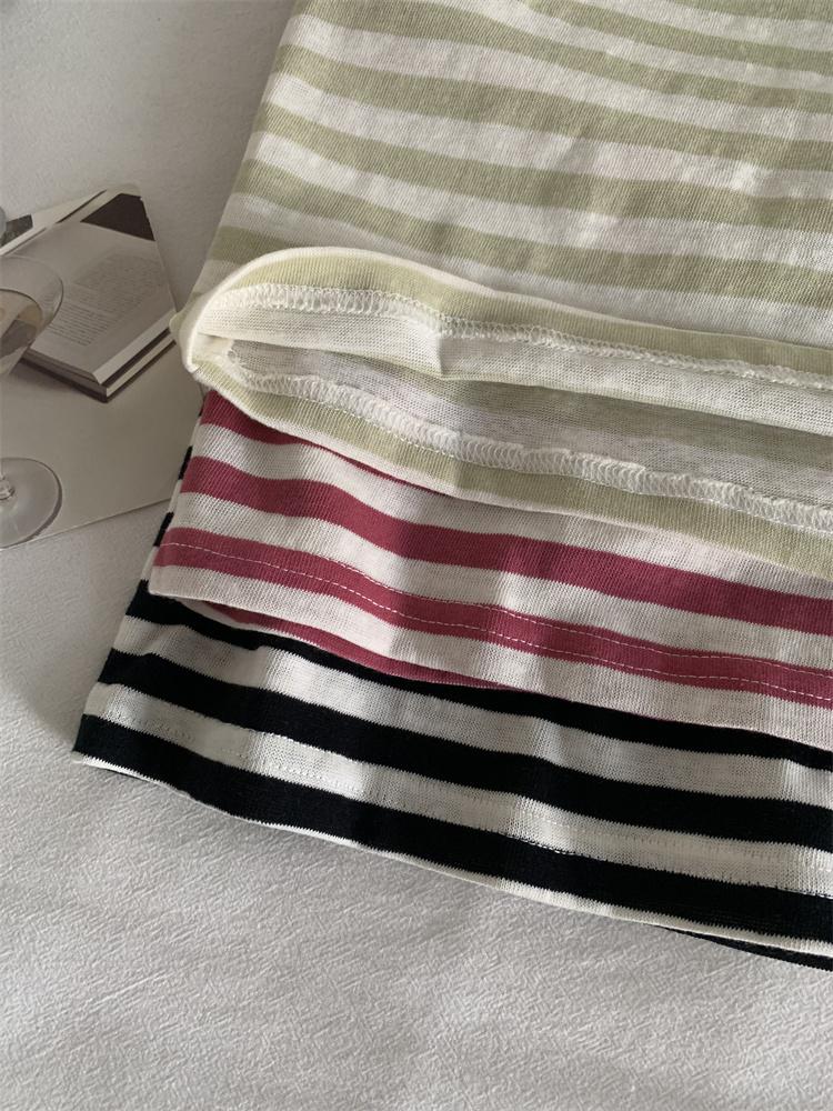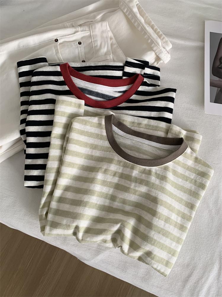Camiseta Corta de Verano para Mujer de Algodón Copo de Nieve Fino Estilo Coreano con Cuello Redondo a Rayas Rosa Frambuesa Blanco Manga Corta Hombro Derecho