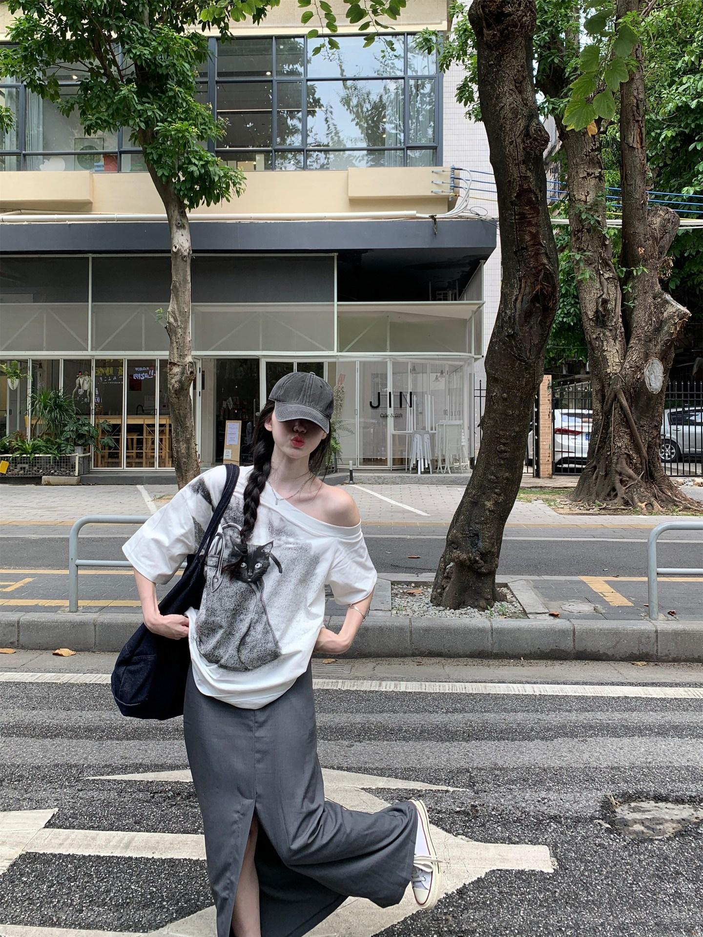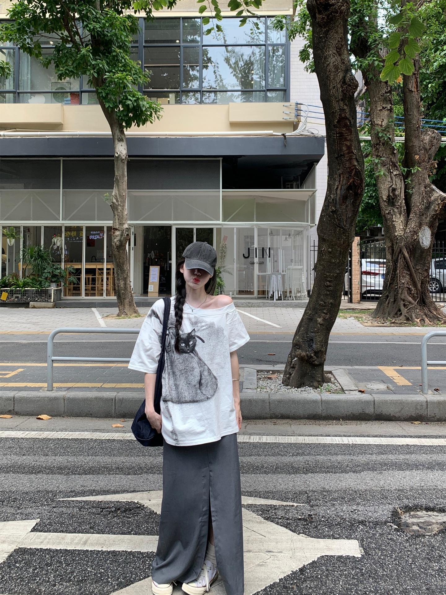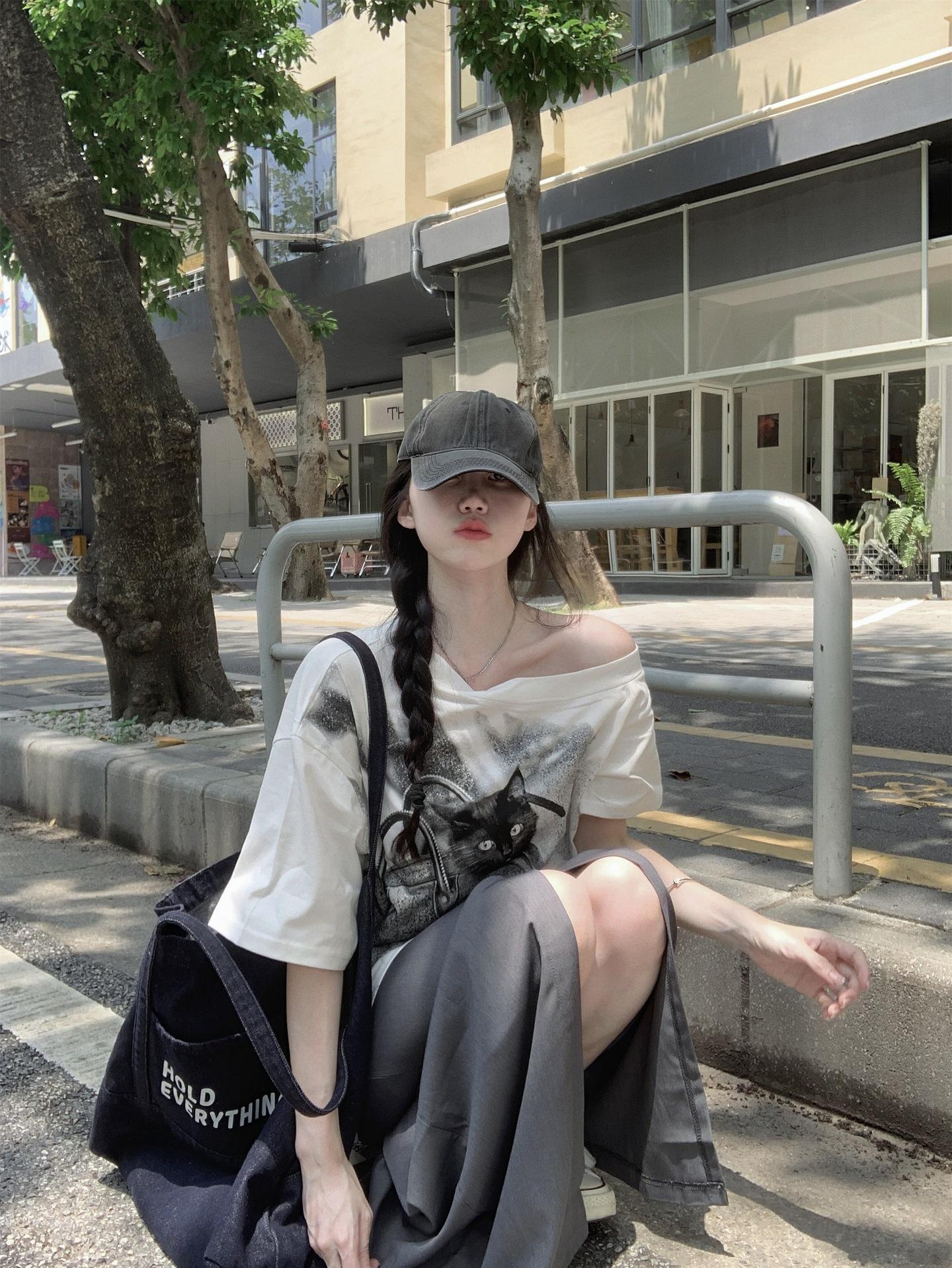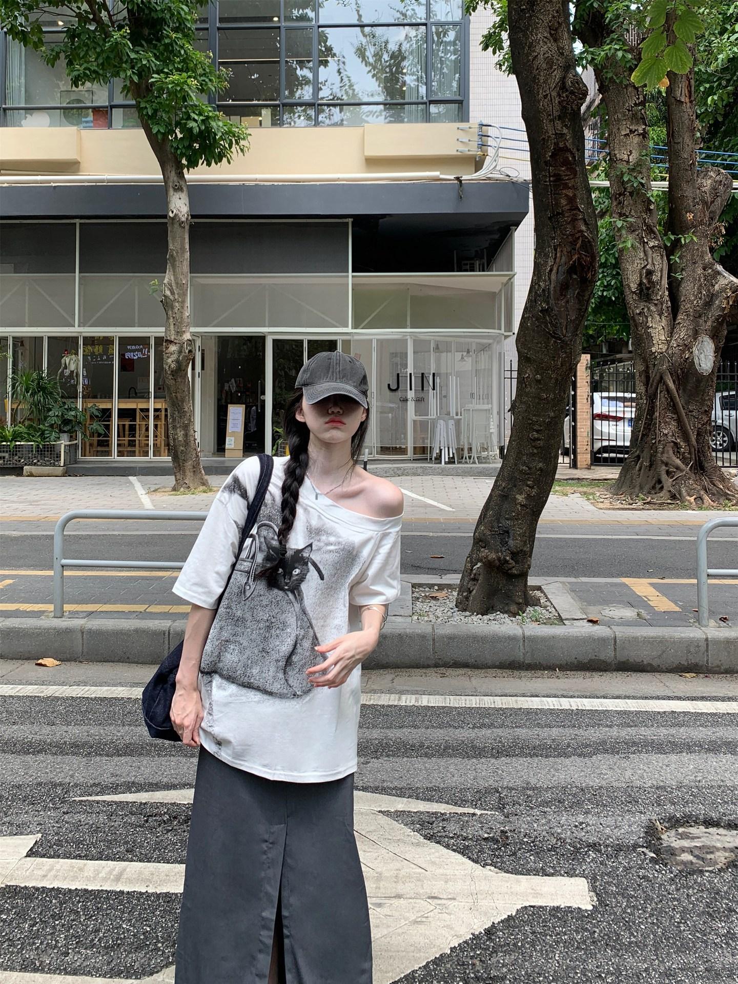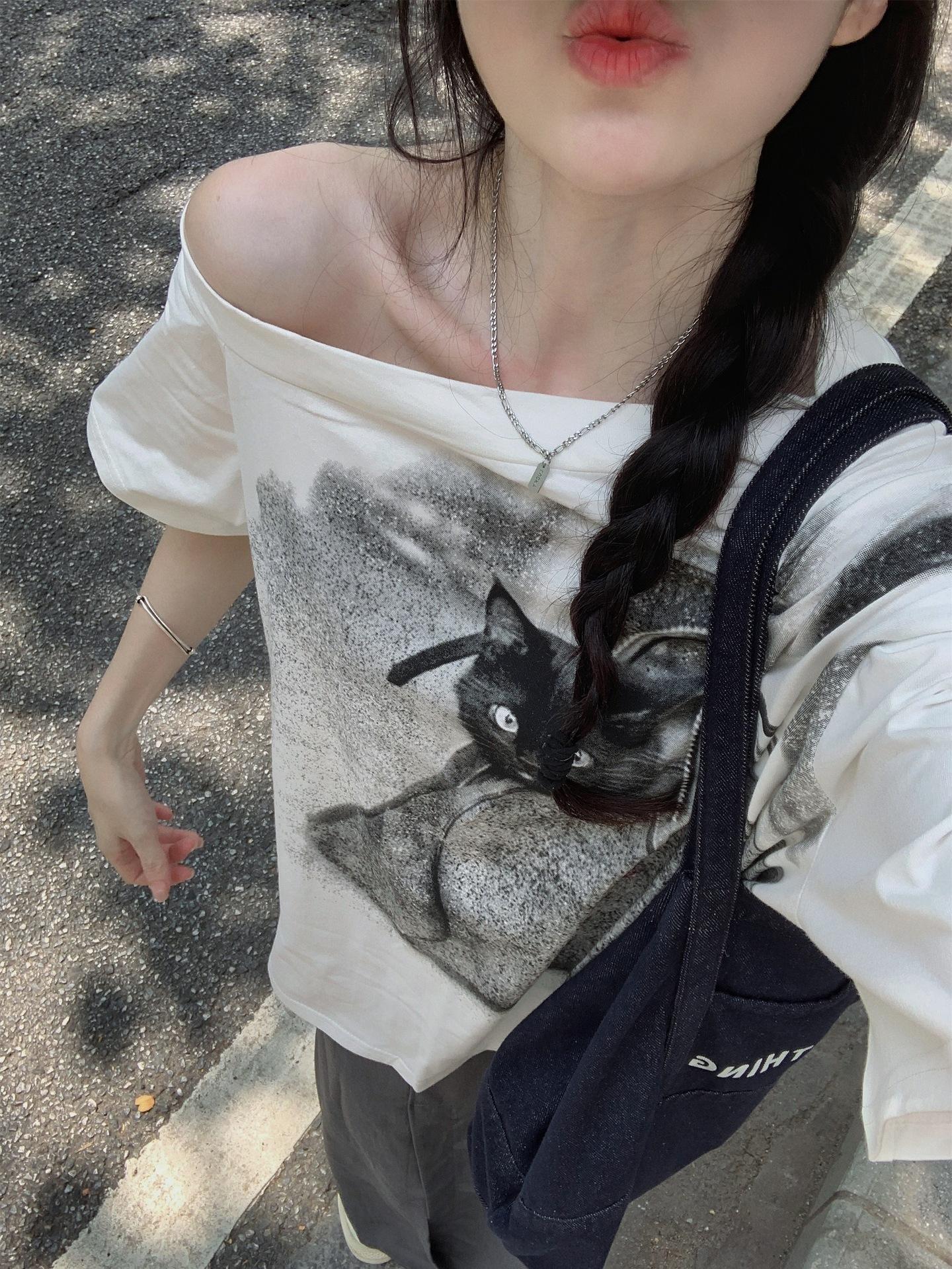Camiseta de Manga Corta con Hombro Inclinado y Estampado de Gatito Blanco para Mujer Verano Estilo Coreano Holgada Dulce Estilo Lazy Nicho Versátil Top