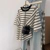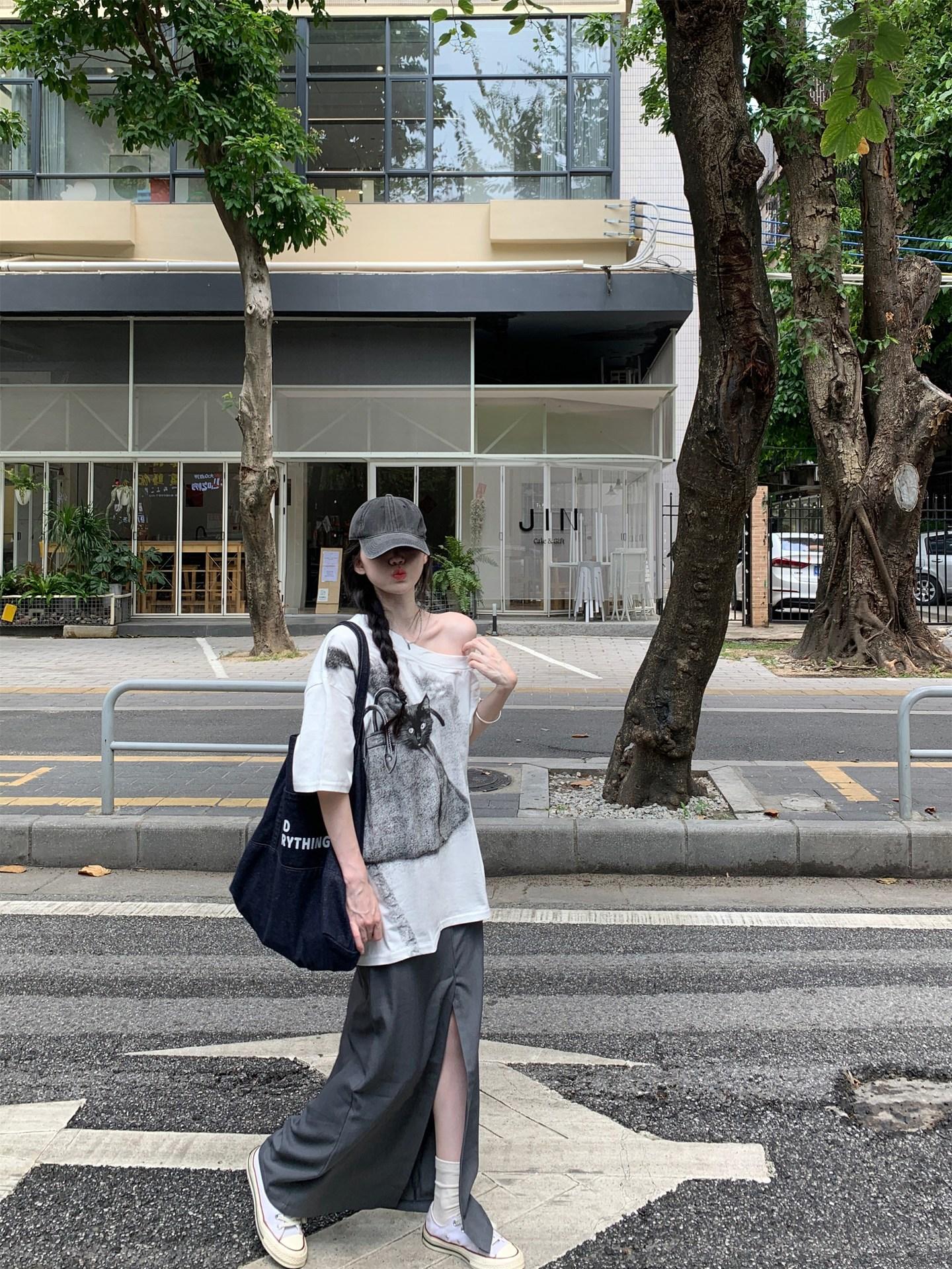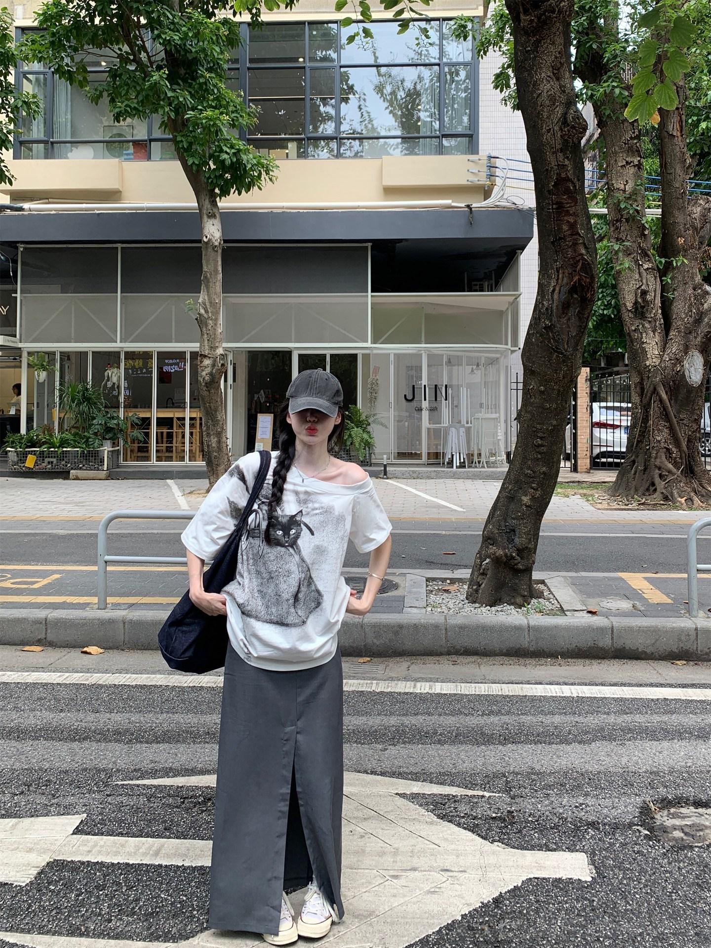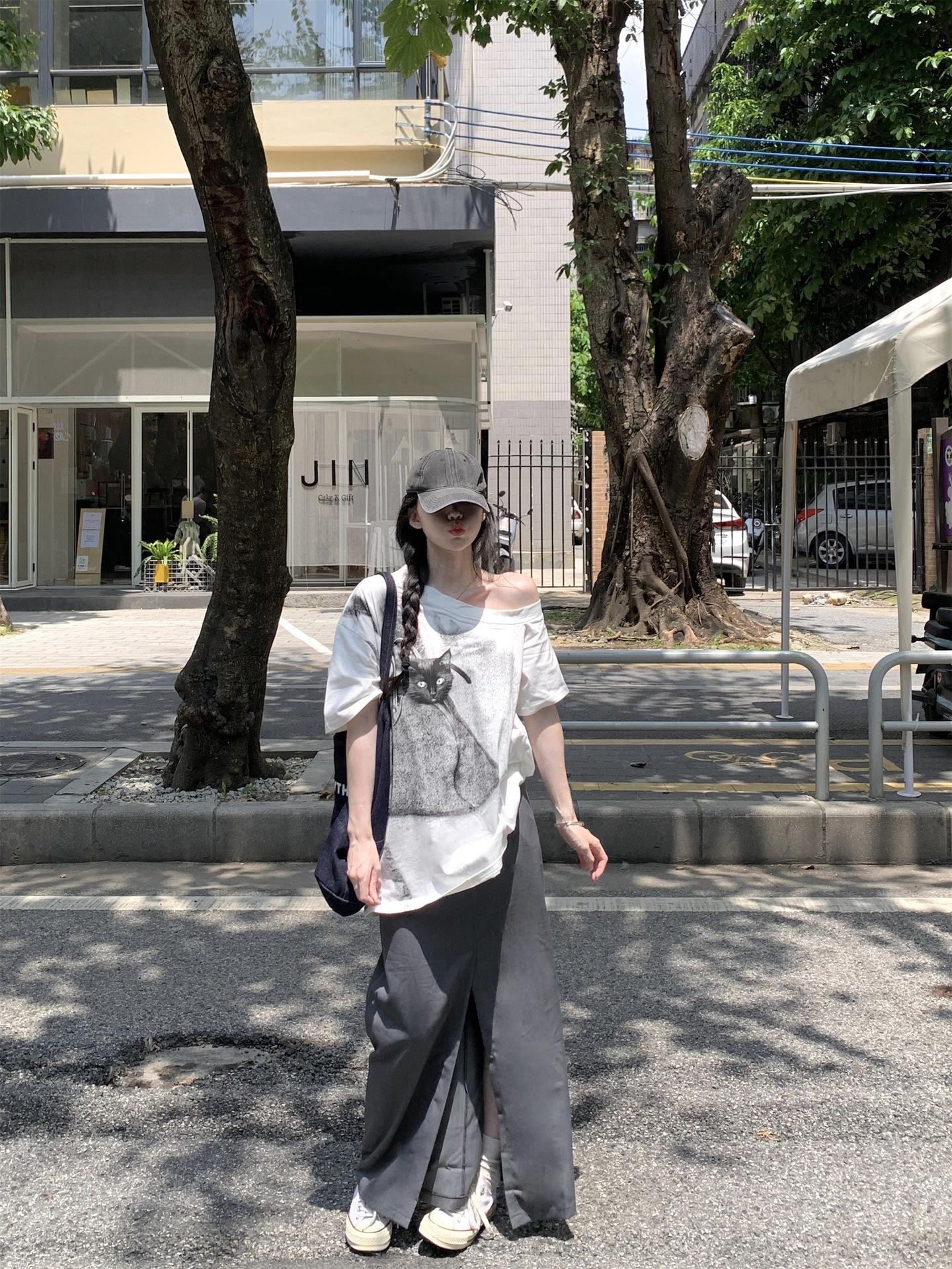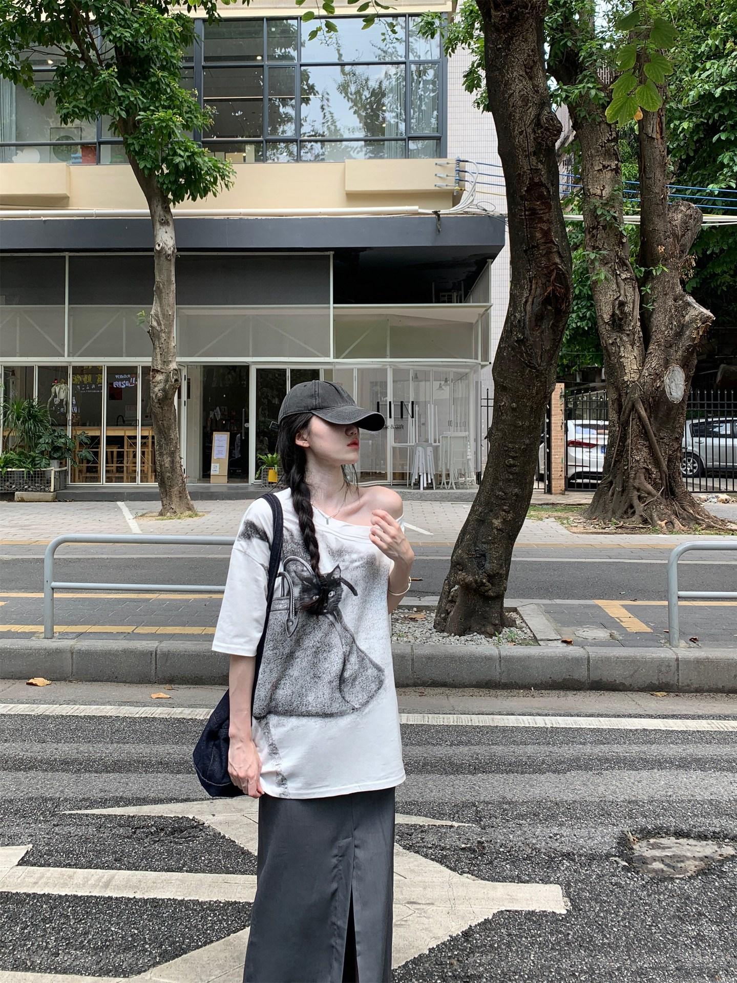 Camiseta de Manga Corta con Hombro Inclinado y Estampado de Gatito Blanco para Mujer Verano Estilo Coreano Holgada Dulce Estilo Lazy Nicho Versátil Top