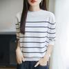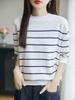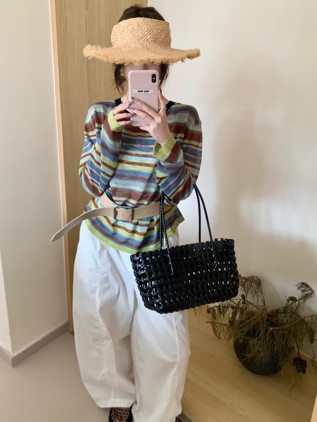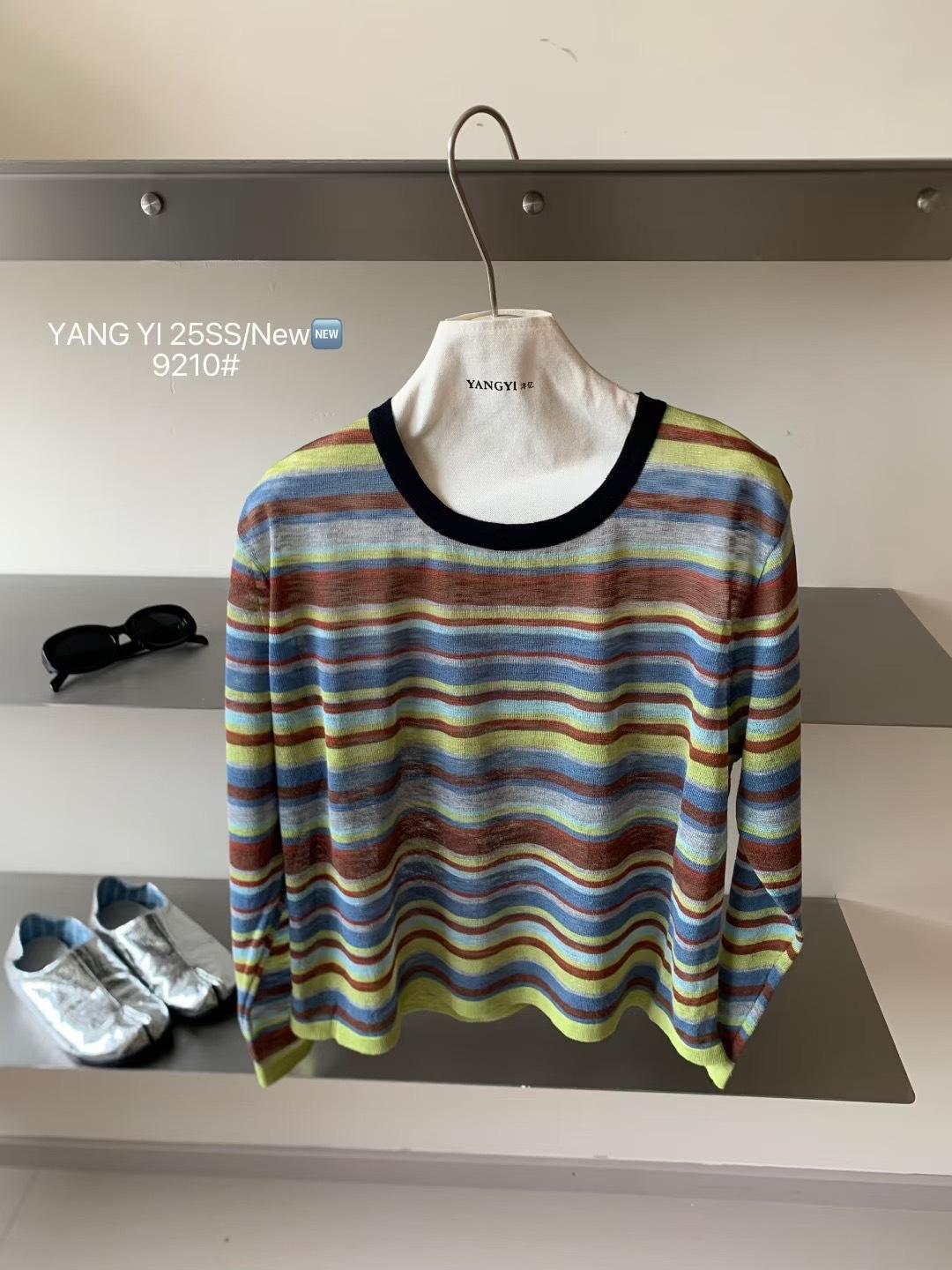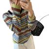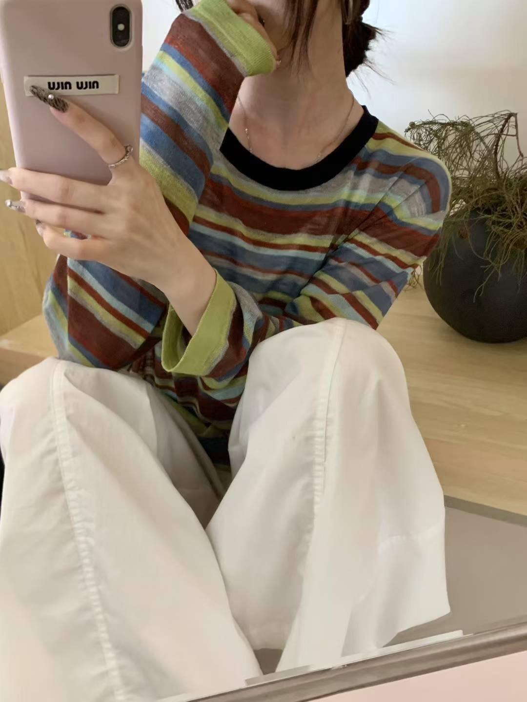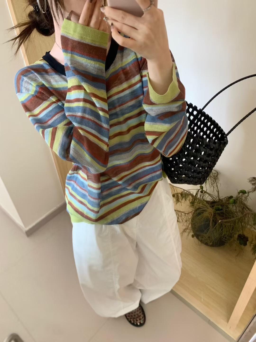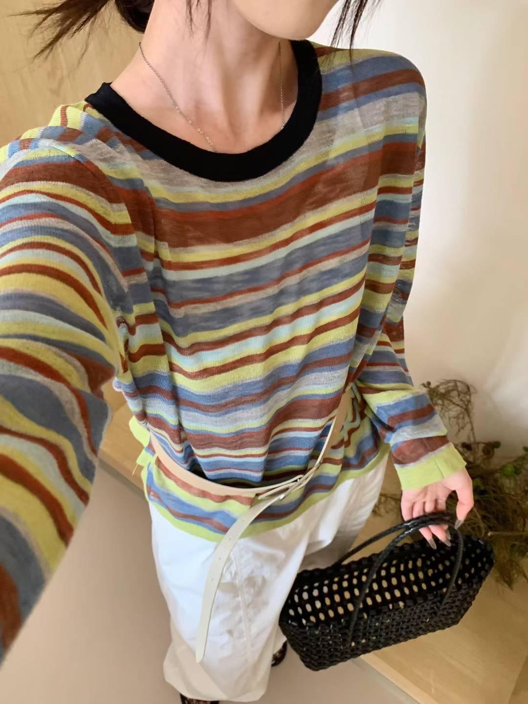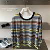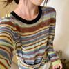 Suéter de punto de manga larga holgado fino a rayas con bloques de color de moda de estilo europeo 2025 verano nueva top de cuello redondo para mujer