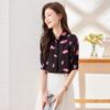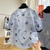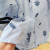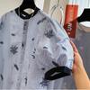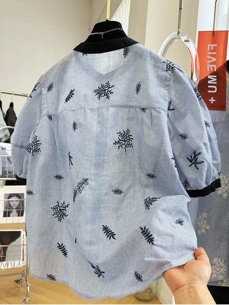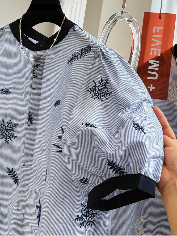 Camiseta de Manga Corta con Cuello Redondo y Rayas Contrastantes Estampadas de Alta Gama para Mujer Verano Delgada Temperamento Camisa Top de Manga Abullonada