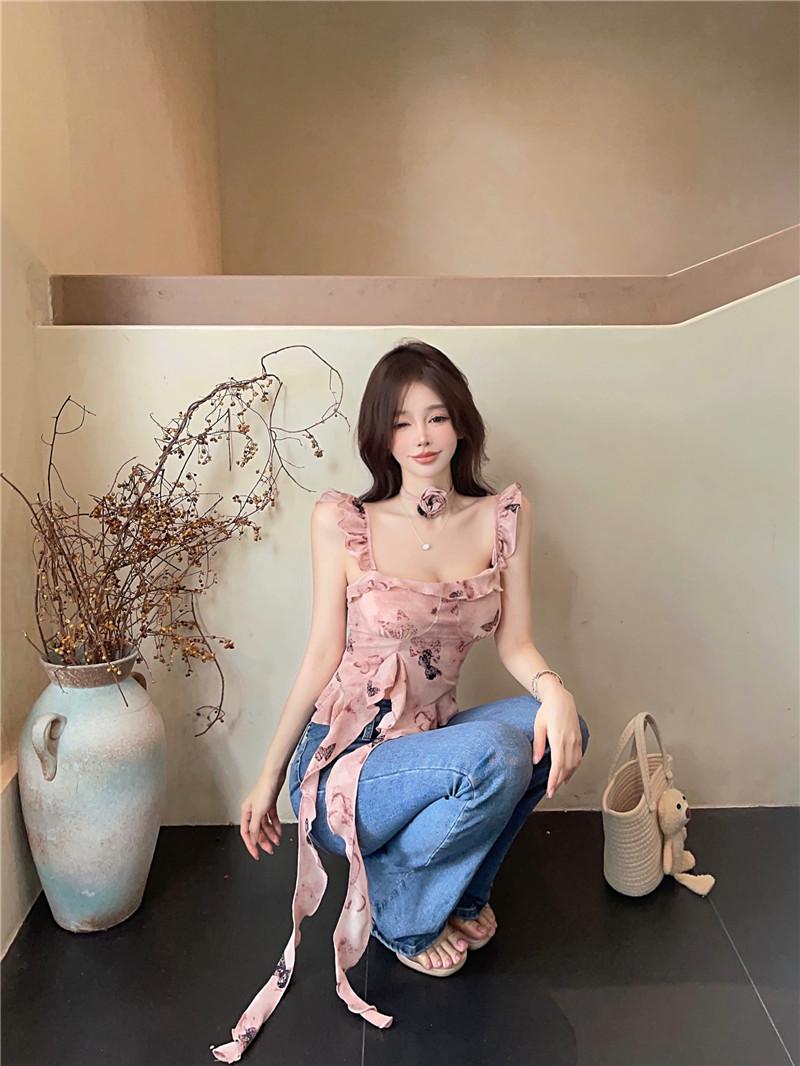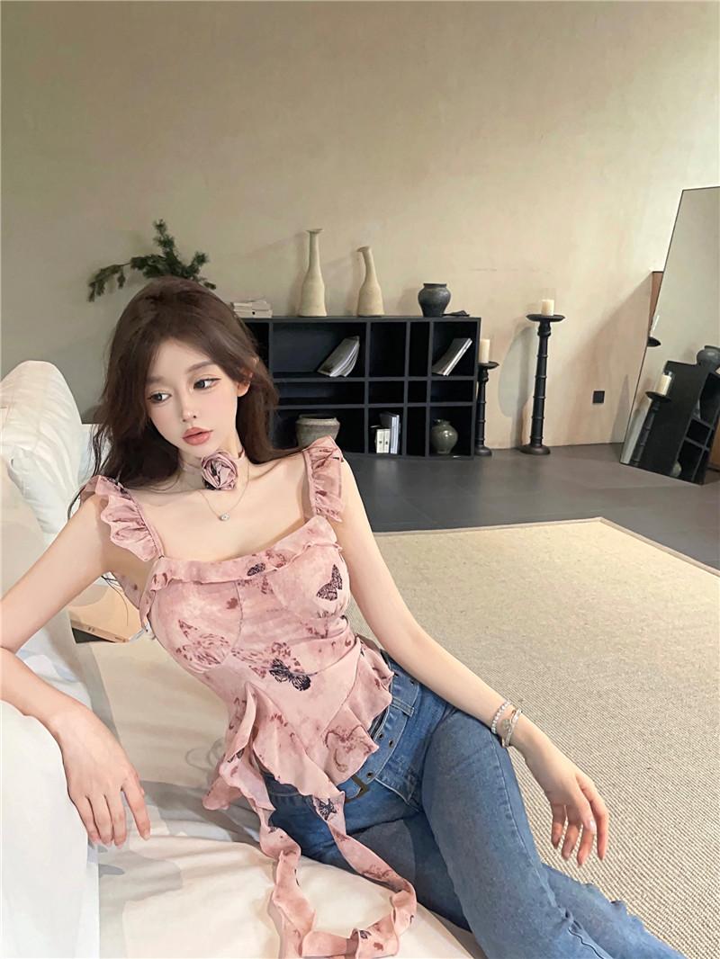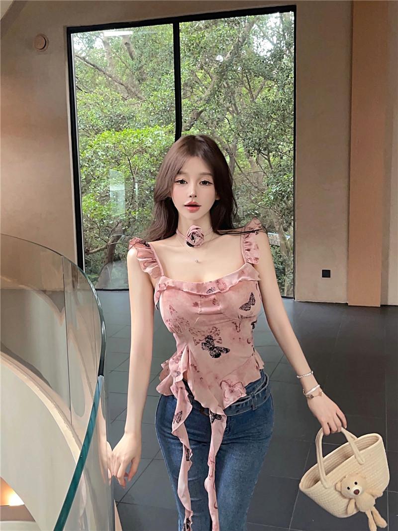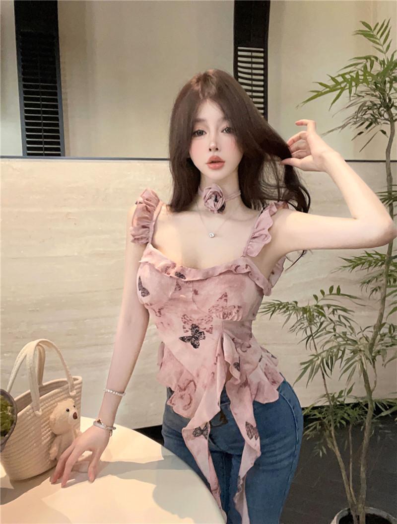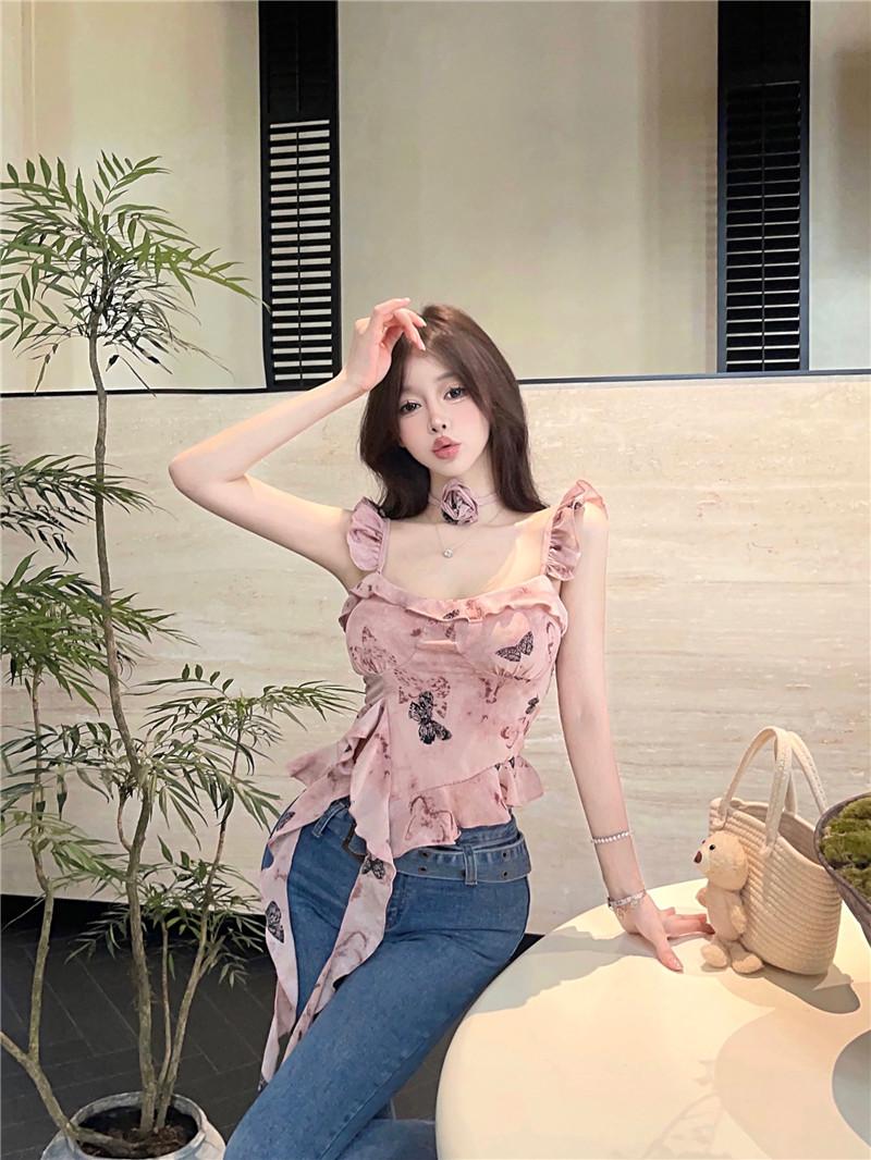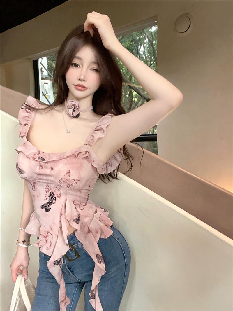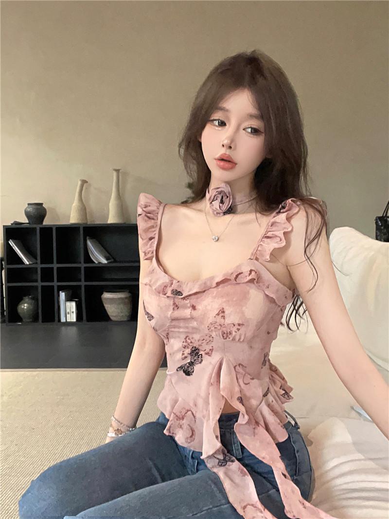 Camisola Corta Rosa con Cuello en V Pequeña para Mujer Verano Asimétrica con Volantes Sexy Elegante sin Mangas