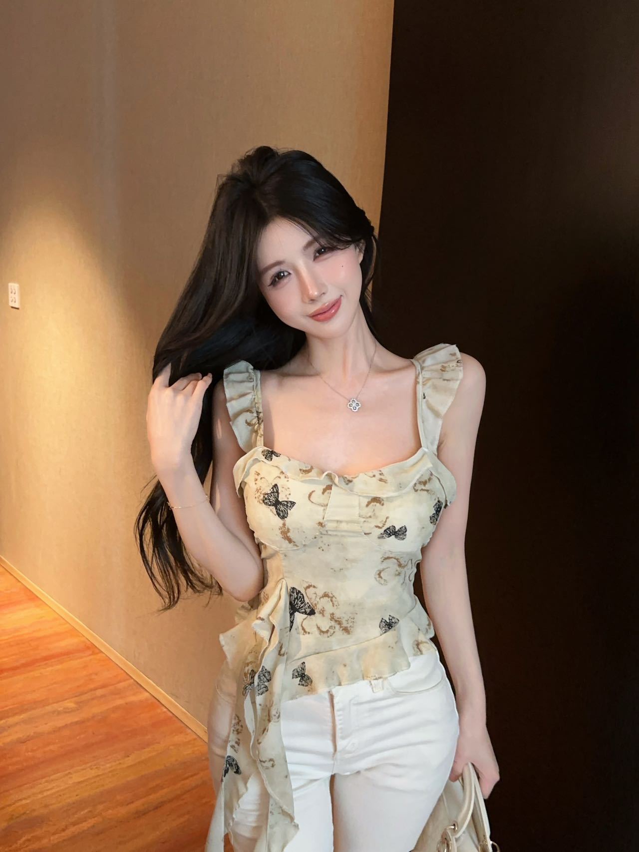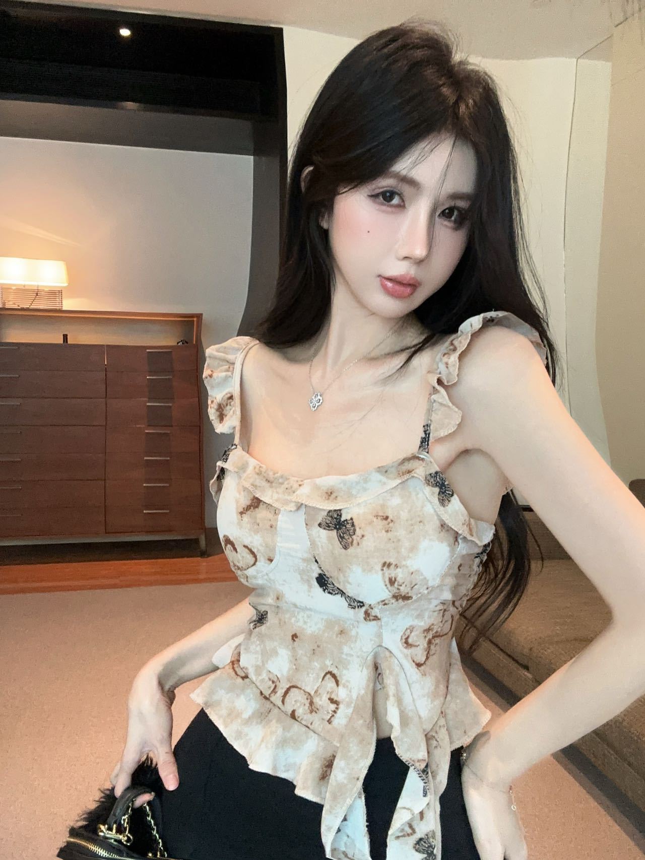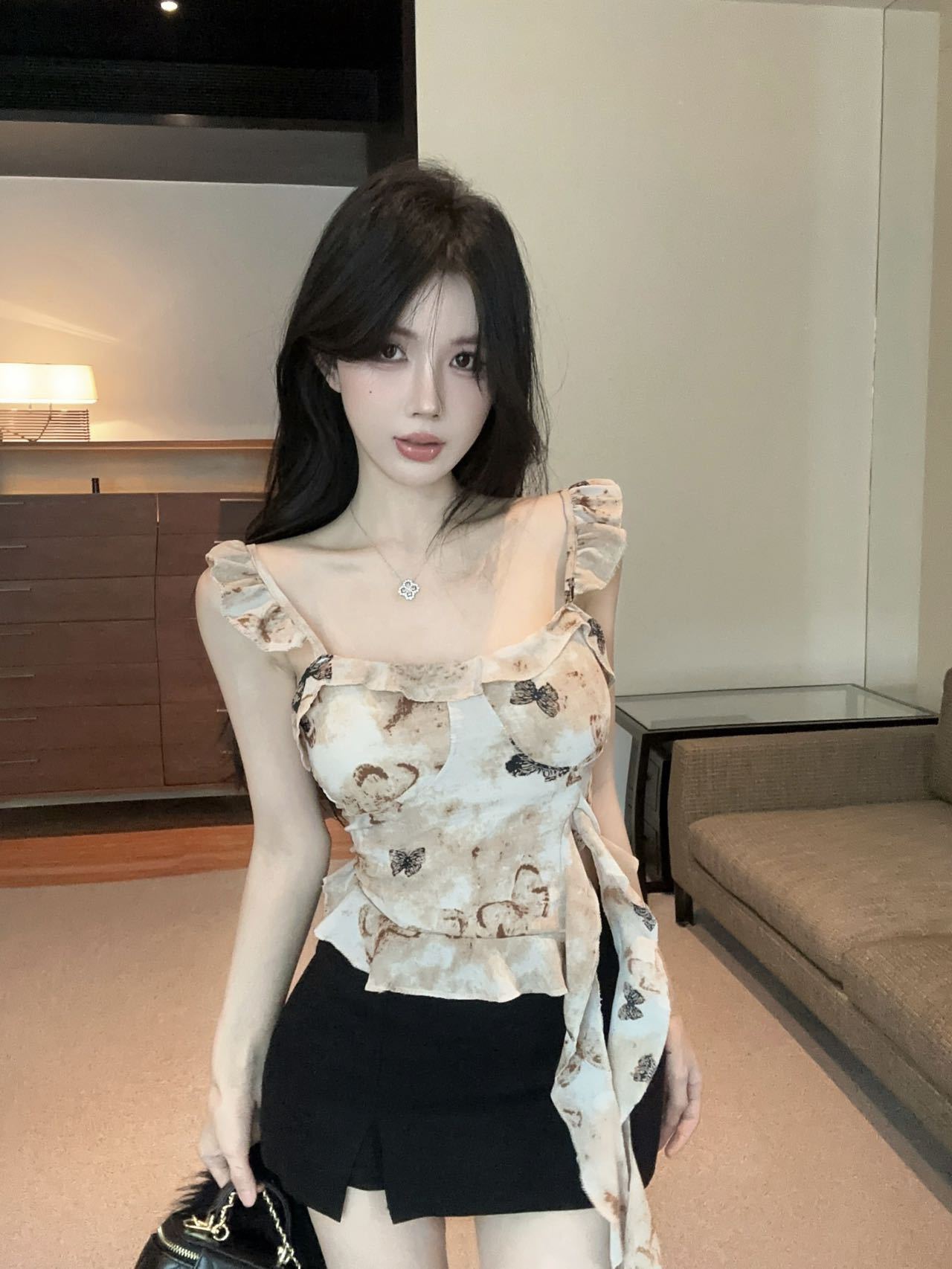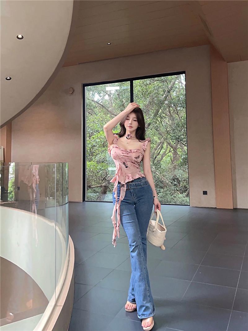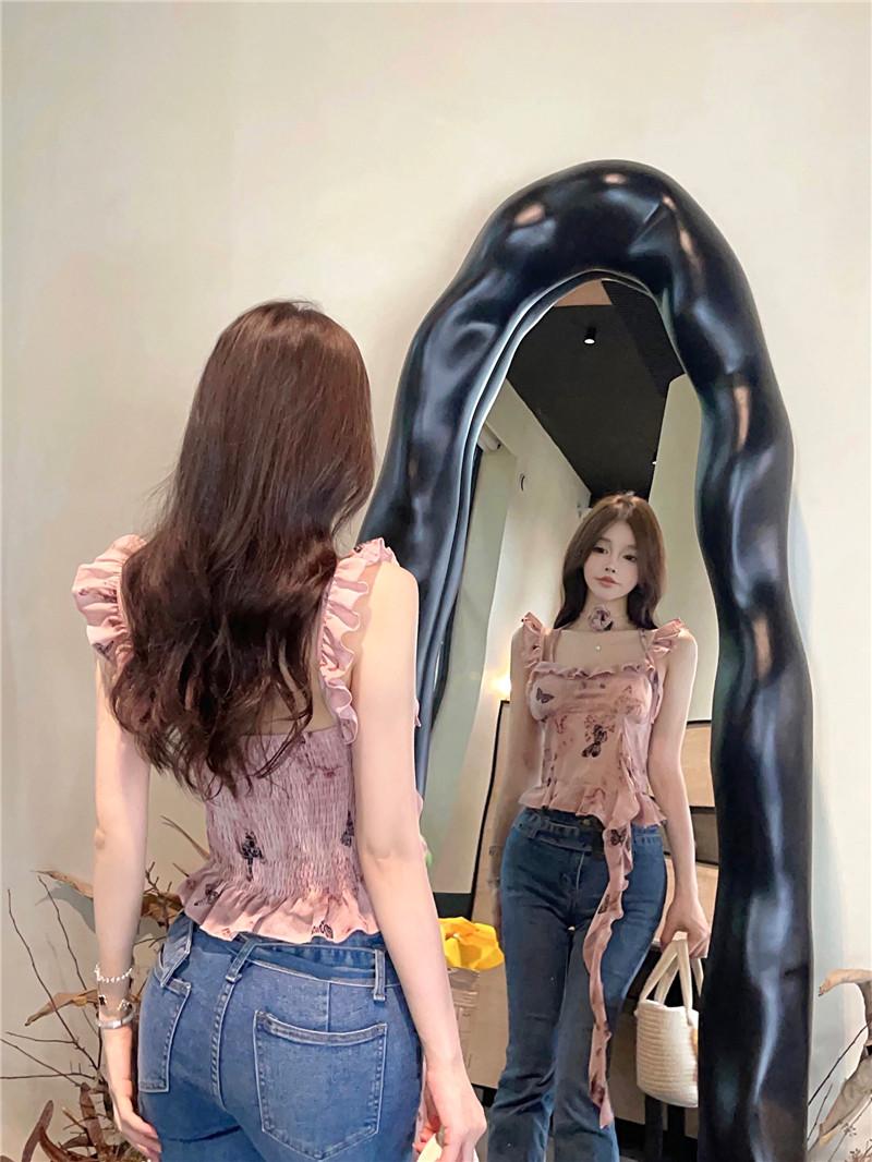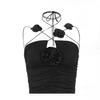 Camisola Corta Rosa con Cuello en V Pequeña para Mujer Verano Asimétrica con Volantes Sexy Elegante sin Mangas