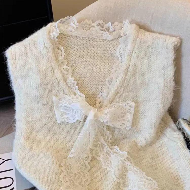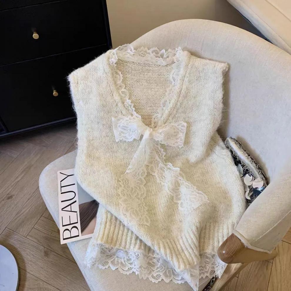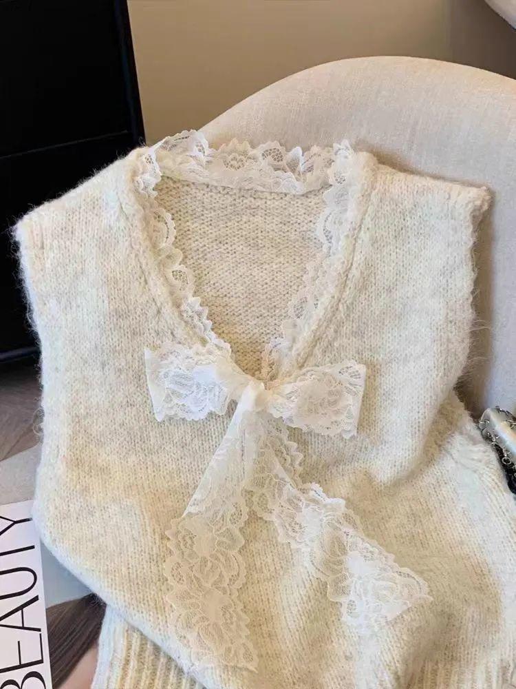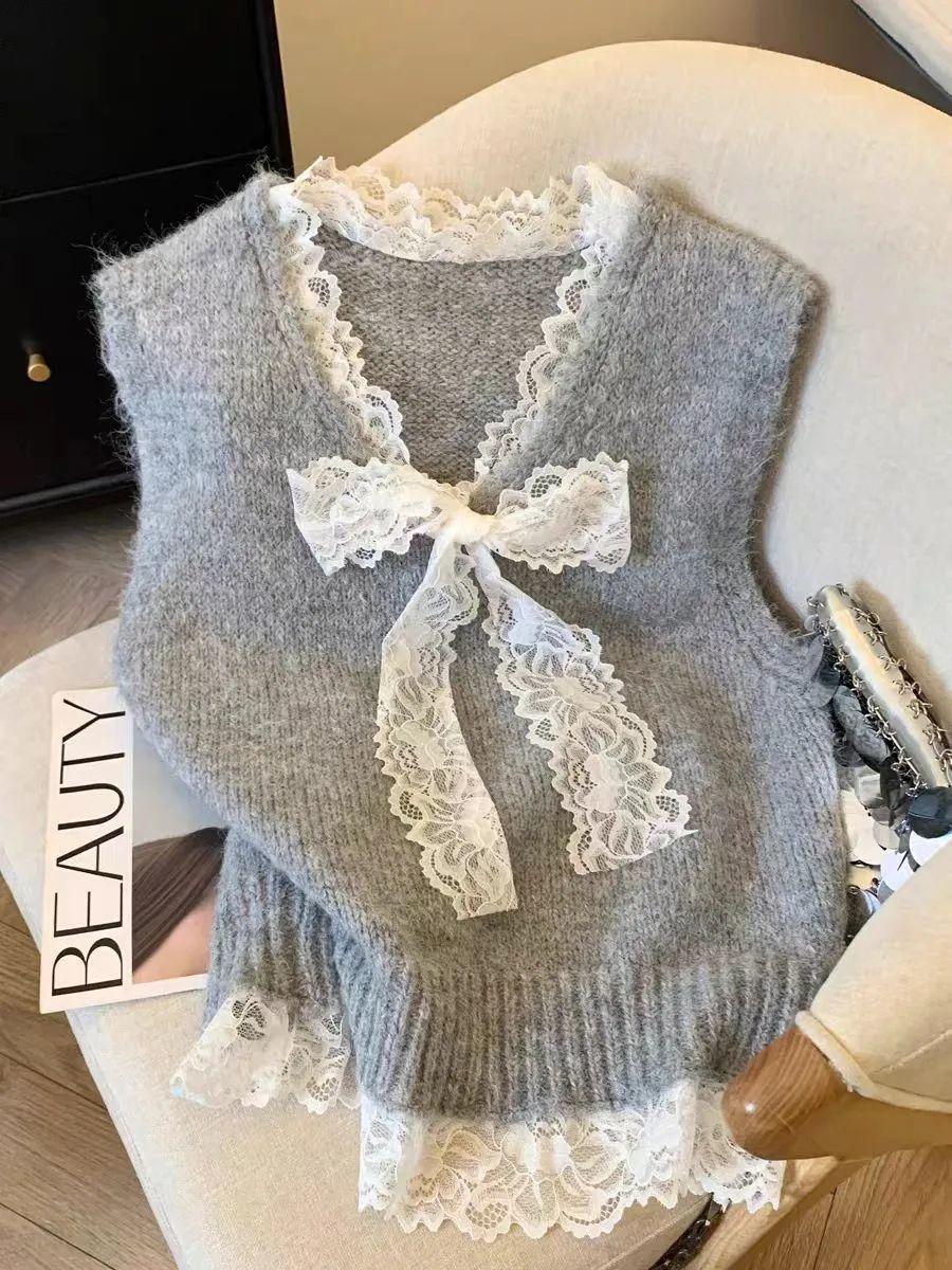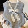 Shanli Dadi Chaleco de Punto con Cuello en V y Lazo Estilo Chanel para Mujer, Nuevo Estilo de Primavera, Chaleco de Suéter Apilado para Hombres Pequeños