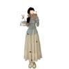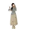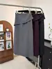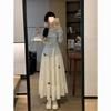 Estilo Francés Suave Diseño de Lazo Otoño Azul Abertura Top de Manga Larga Traje de Falda Slim de Cintura Alta