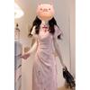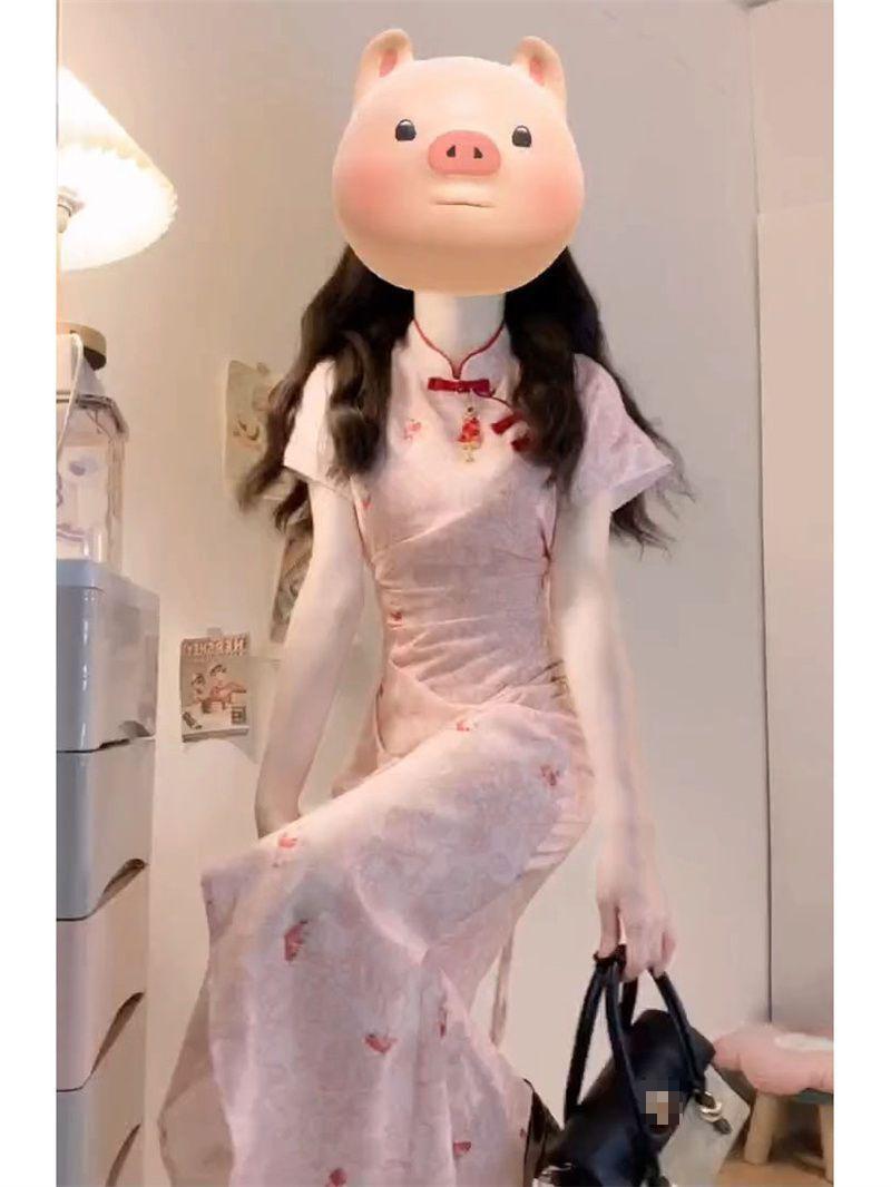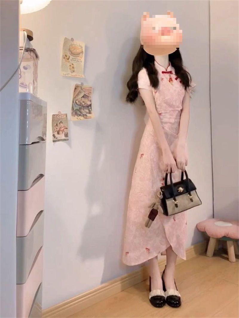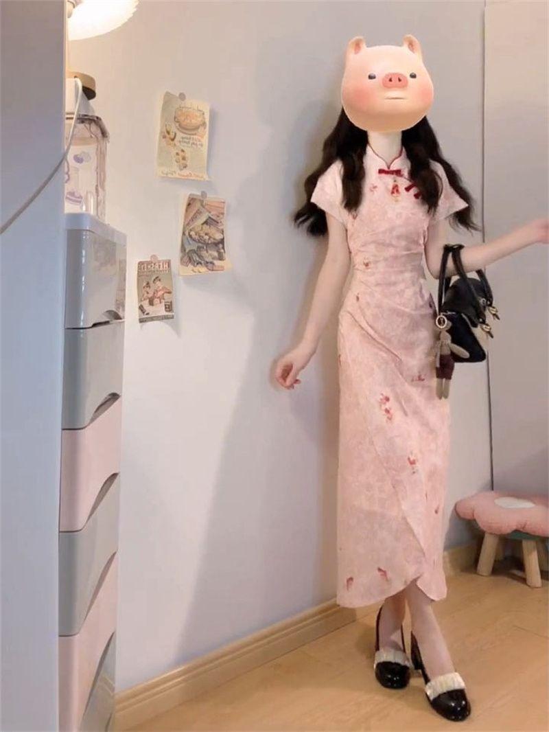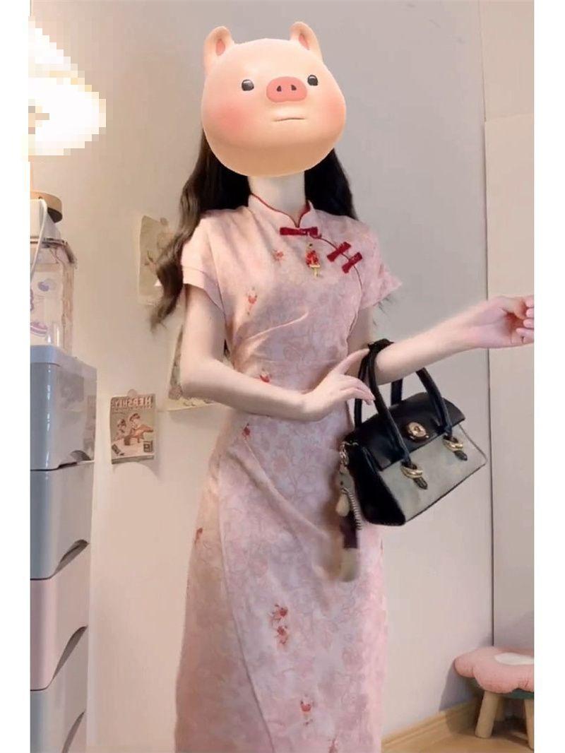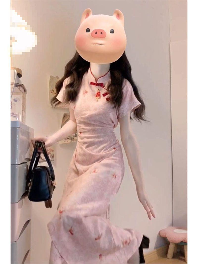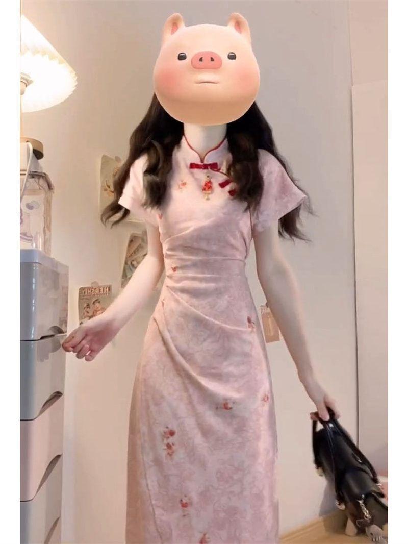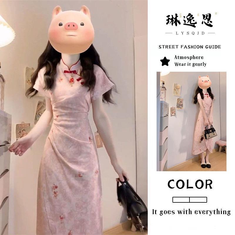 Verano Nuevo Estilo Chino Vestido Rosa Plisado Rosa con Cintura Adelgazante y Elegante Falda Cheongsam Mejorada para Mujer