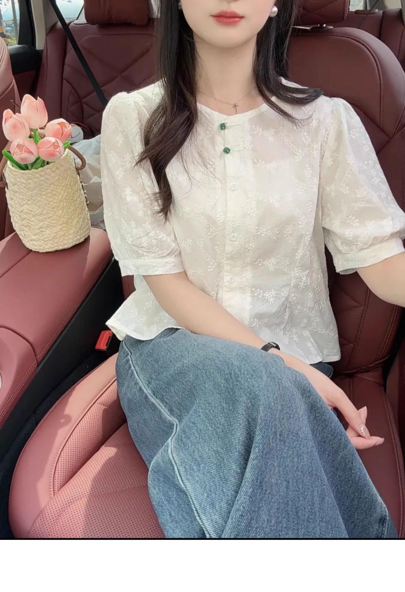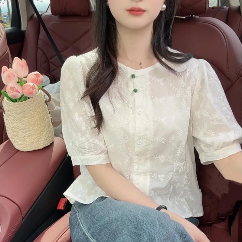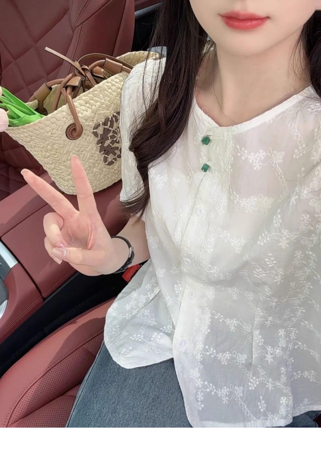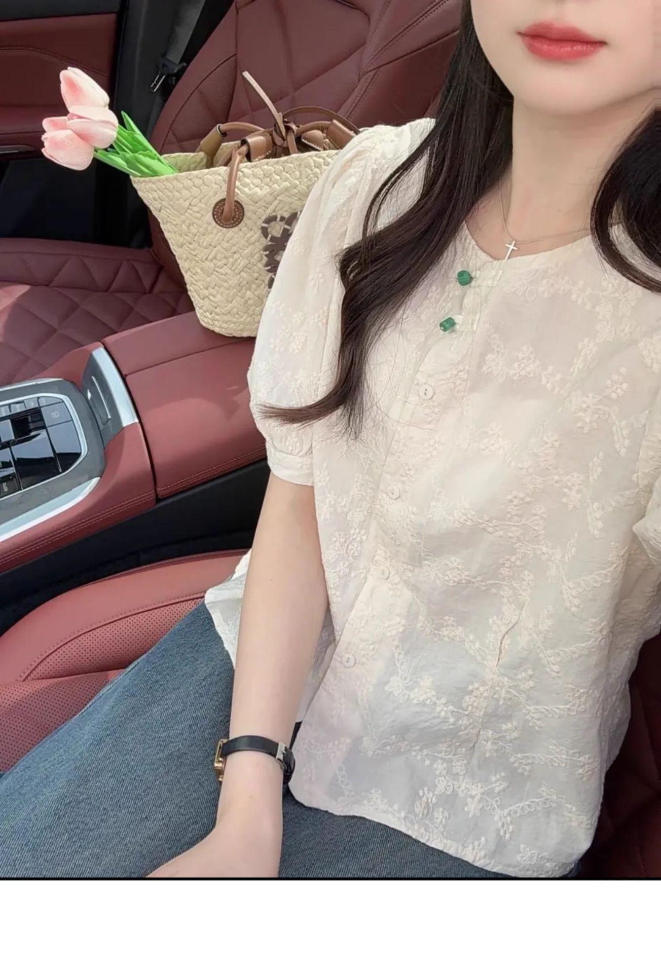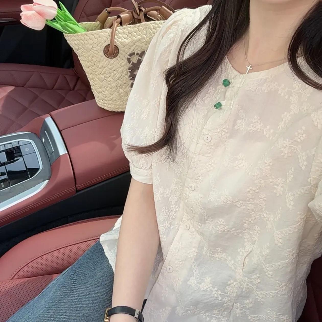 Camisa Refinada de Manga Corta con Jacquard Bordado y Tapeta Doble con Botones Verdes para Mujer Verano 2025 Nuevo Top Corto Hermoso y a la Moda