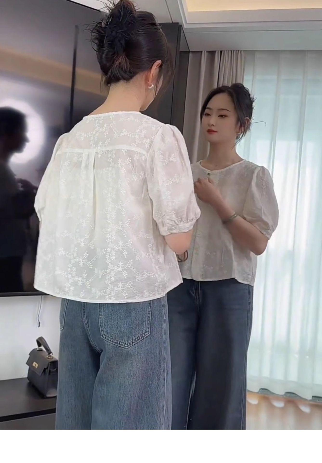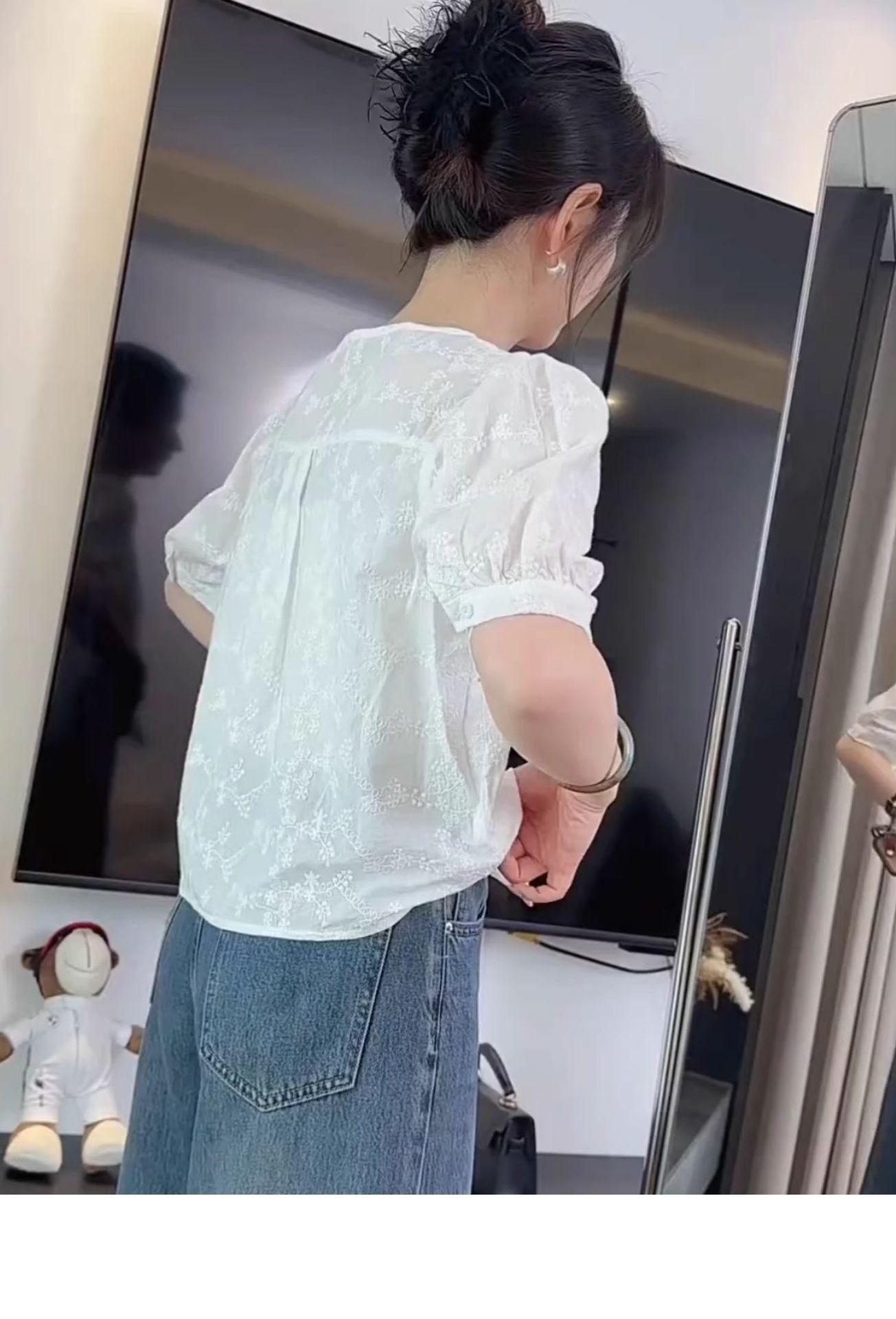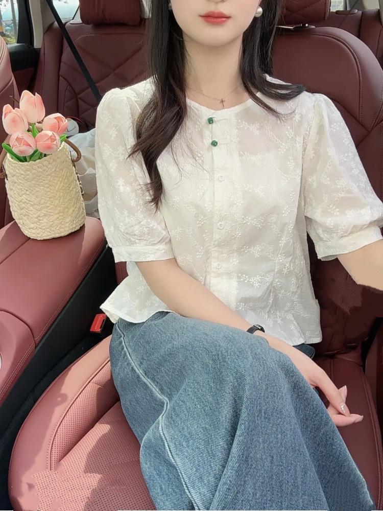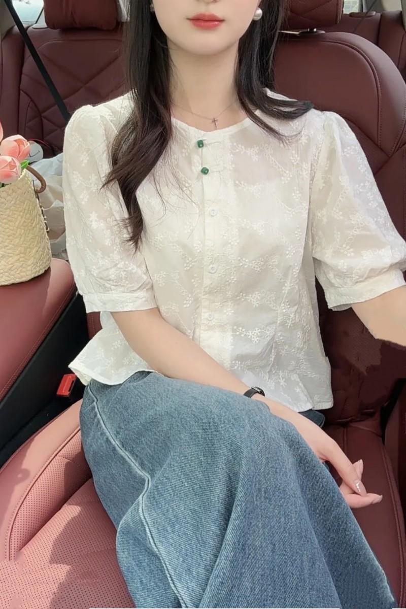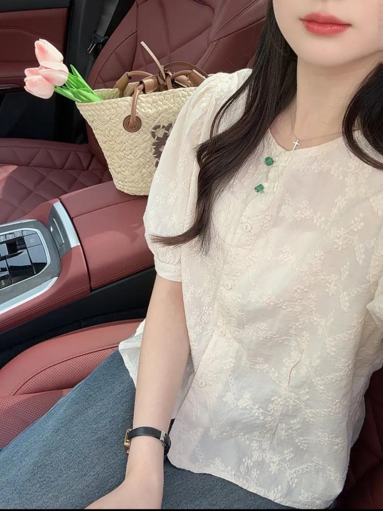 Camisa Refinada de Manga Corta con Jacquard Bordado y Tapeta Doble con Botones Verdes para Mujer Verano 2025 Nuevo Top Corto Hermoso y a la Moda