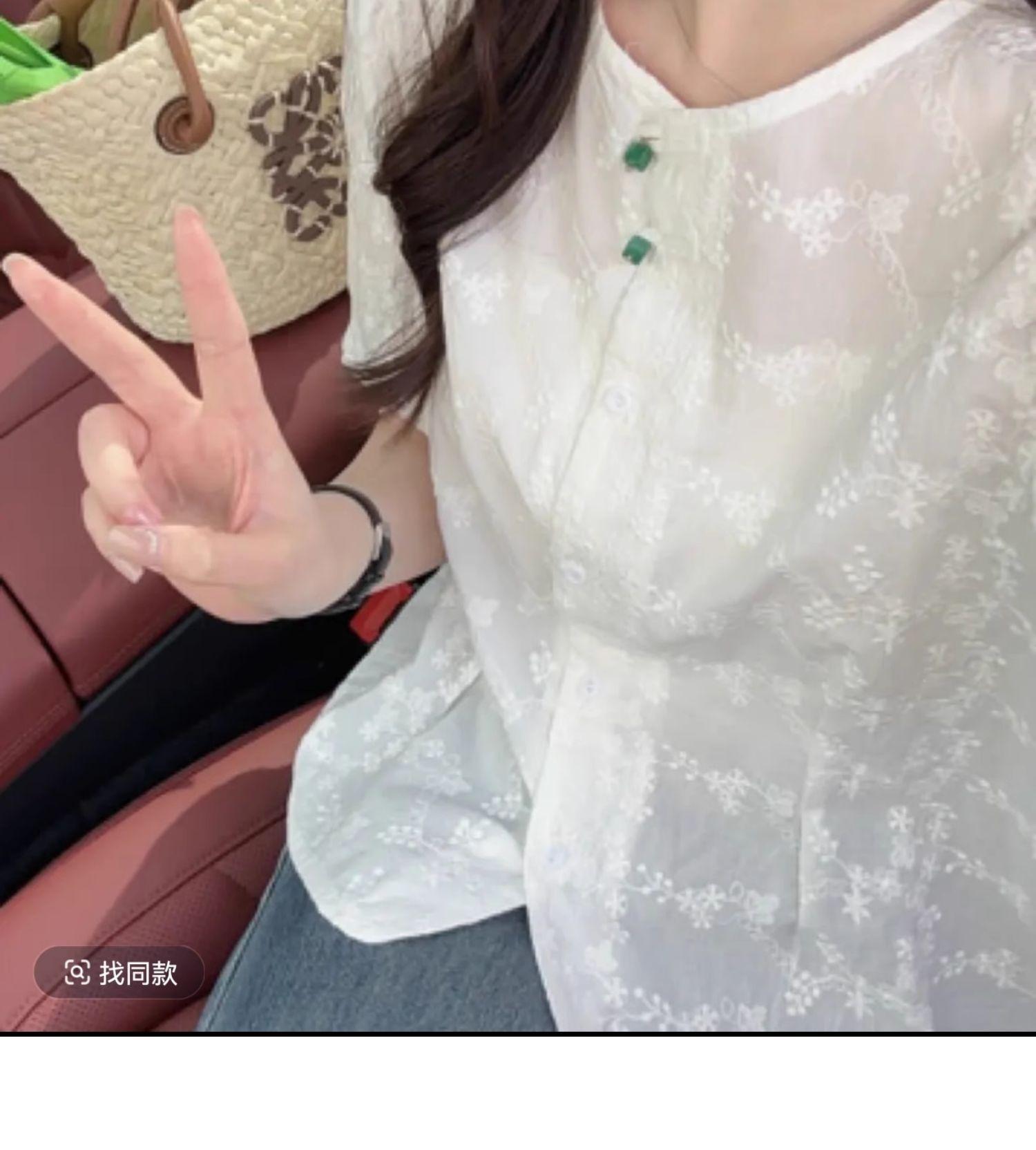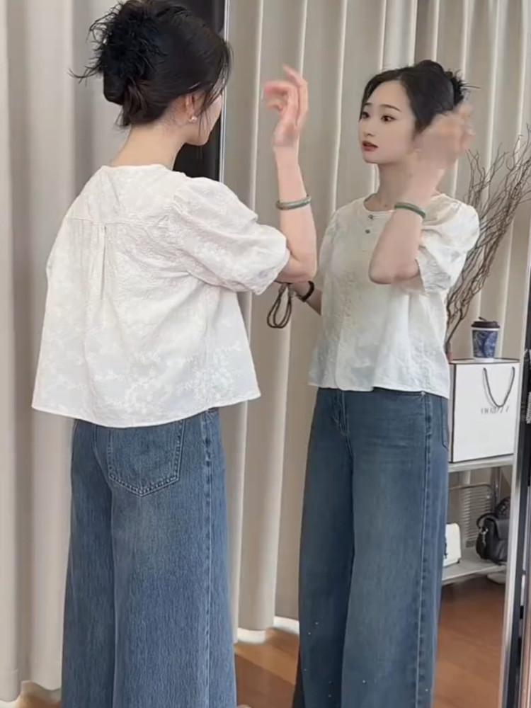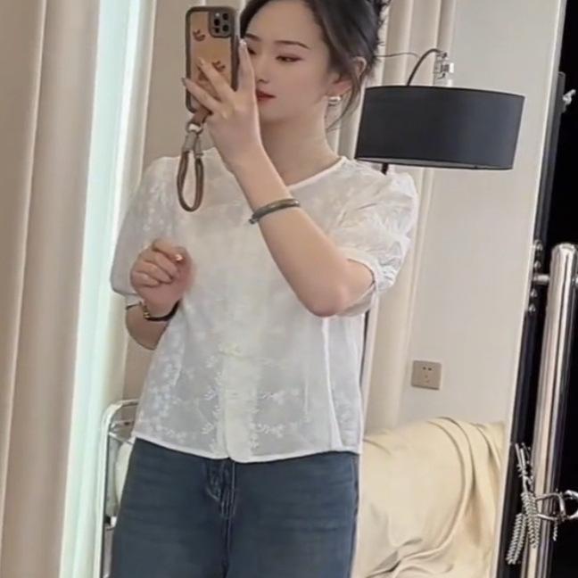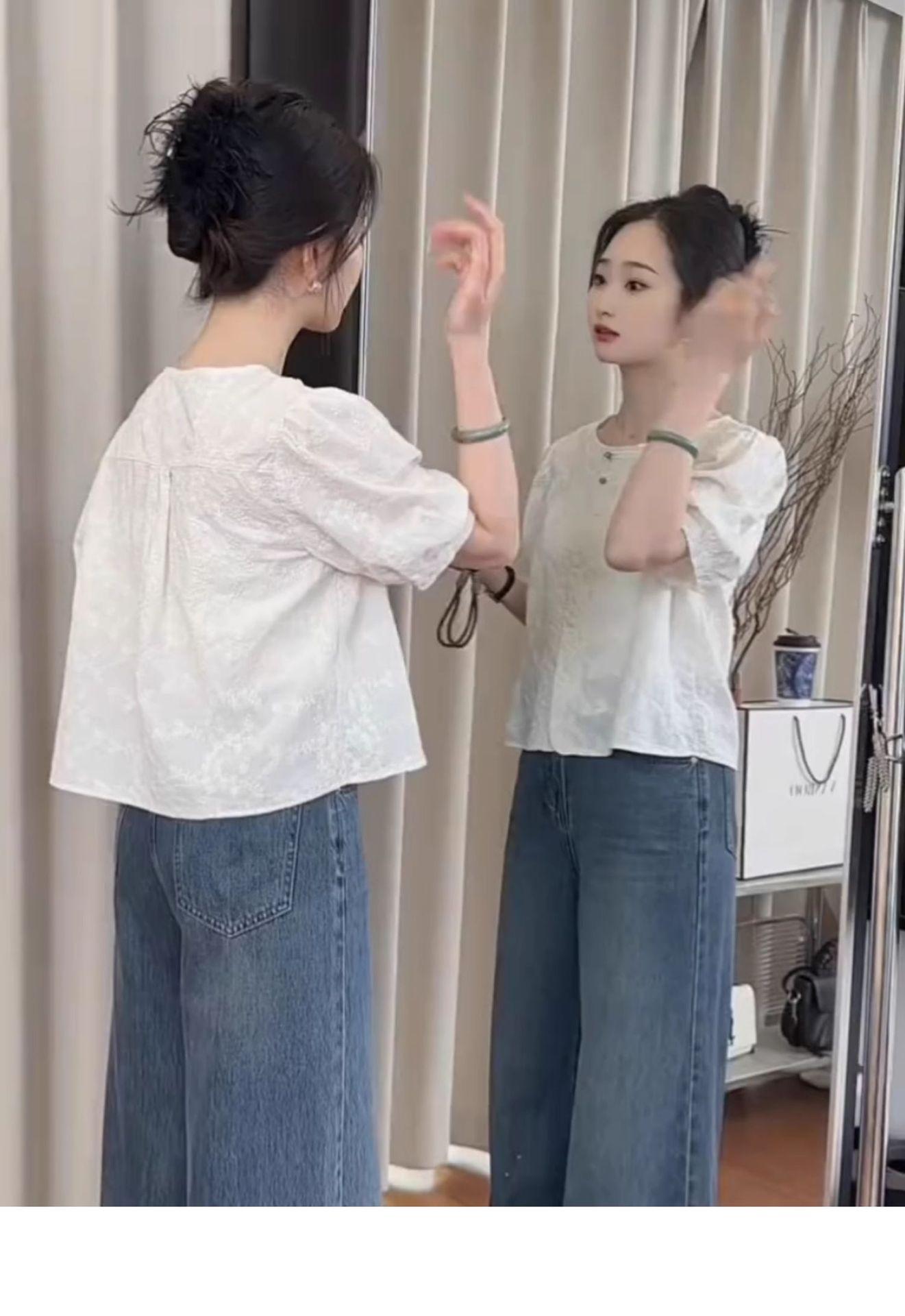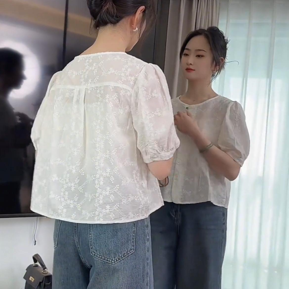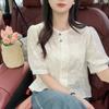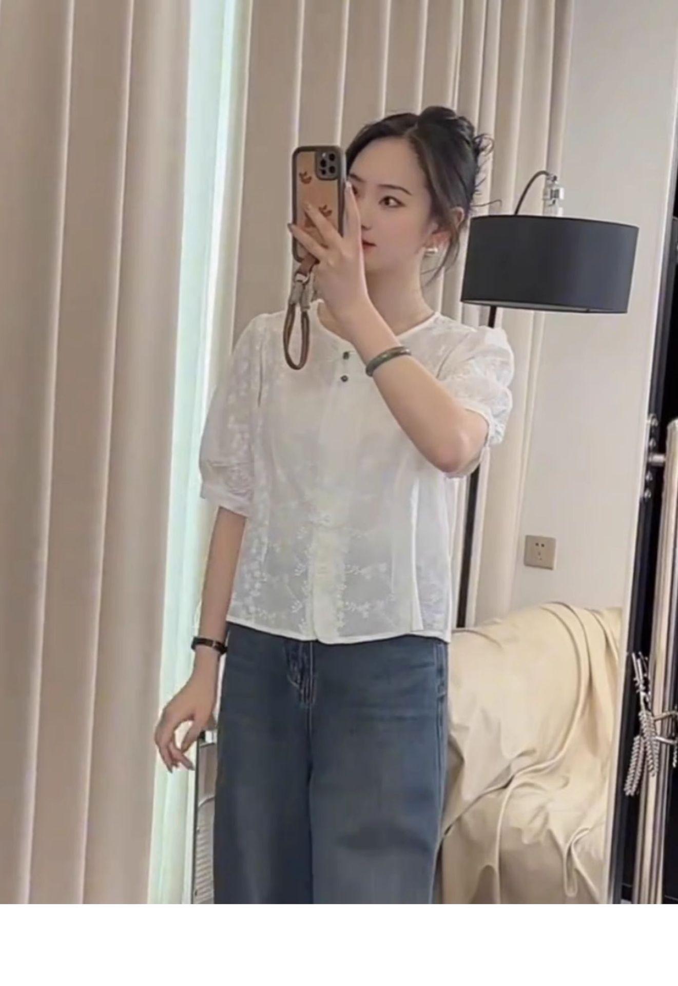 Camisa Refinada de Manga Corta con Jacquard Bordado y Tapeta Doble con Botones Verdes para Mujer Verano 2025 Nuevo Top Corto Hermoso y a la Moda