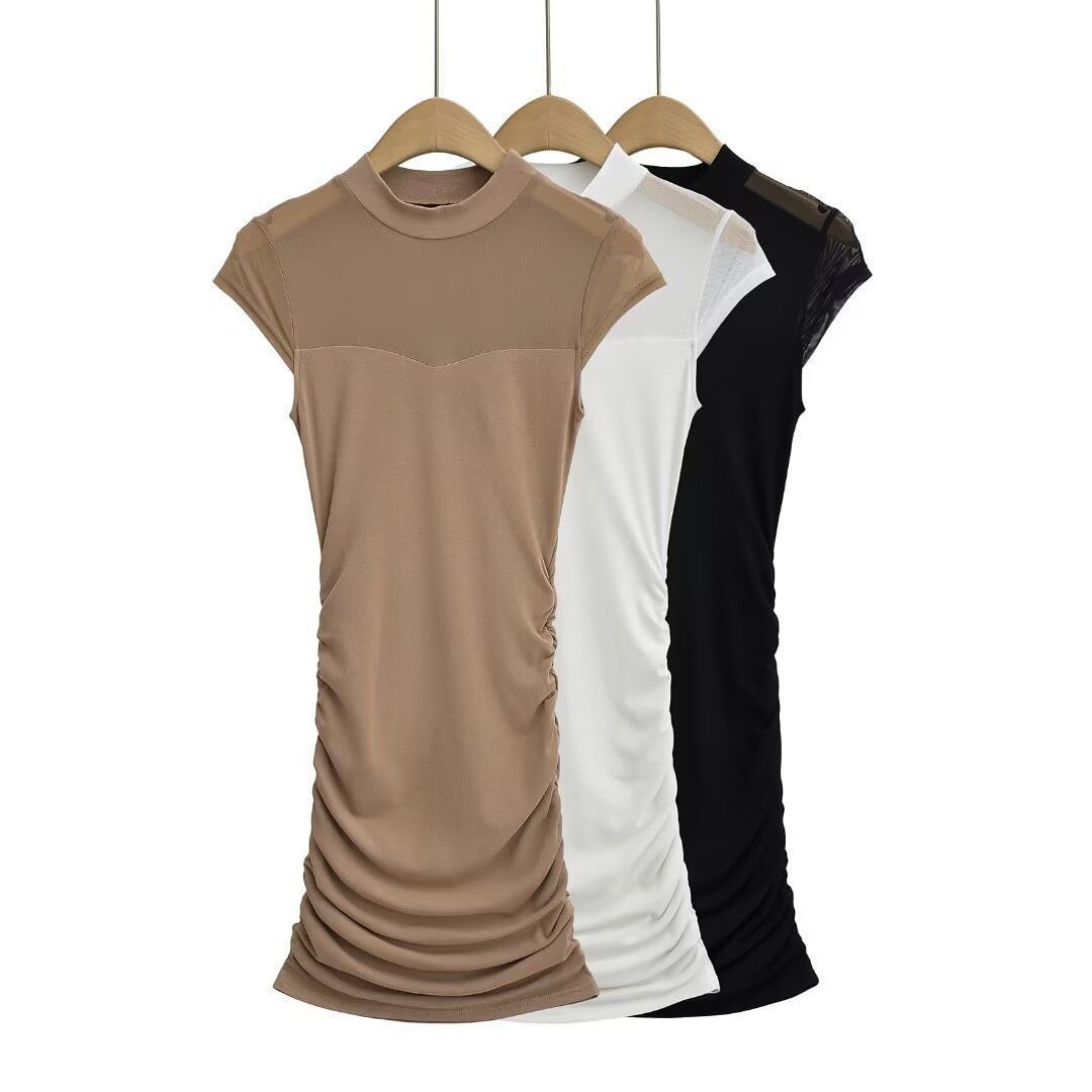 2025 Deseo Puro Estilo Europeo y Americano Nuevo Sexy Empalme de Malla Cuello Redondo Falda de Cadera Vestido Sexy Elegante Ajustado
