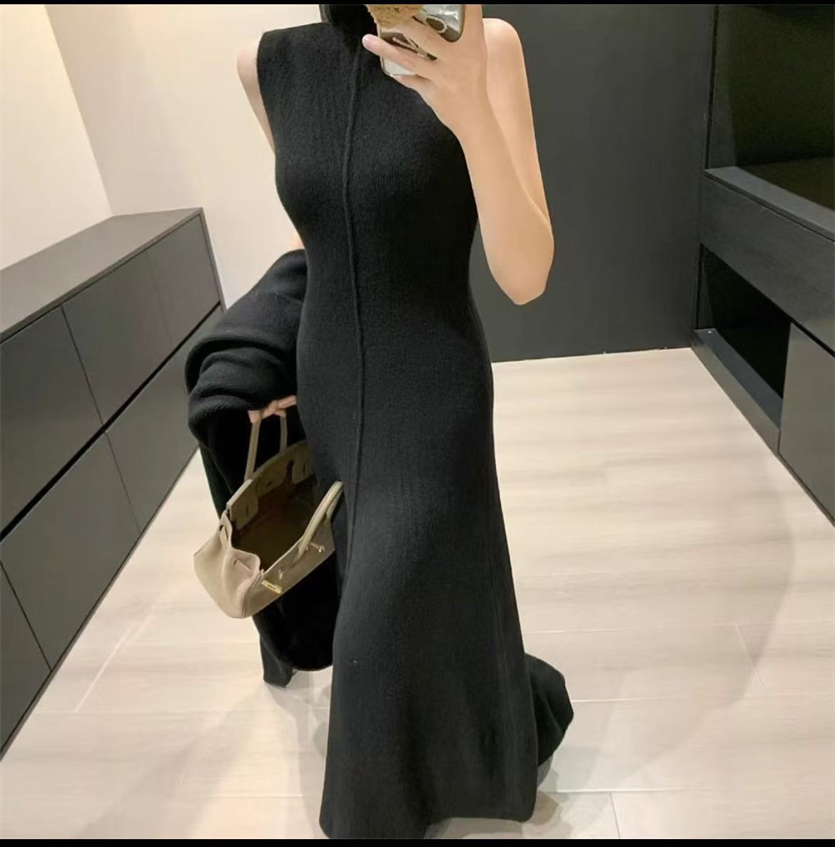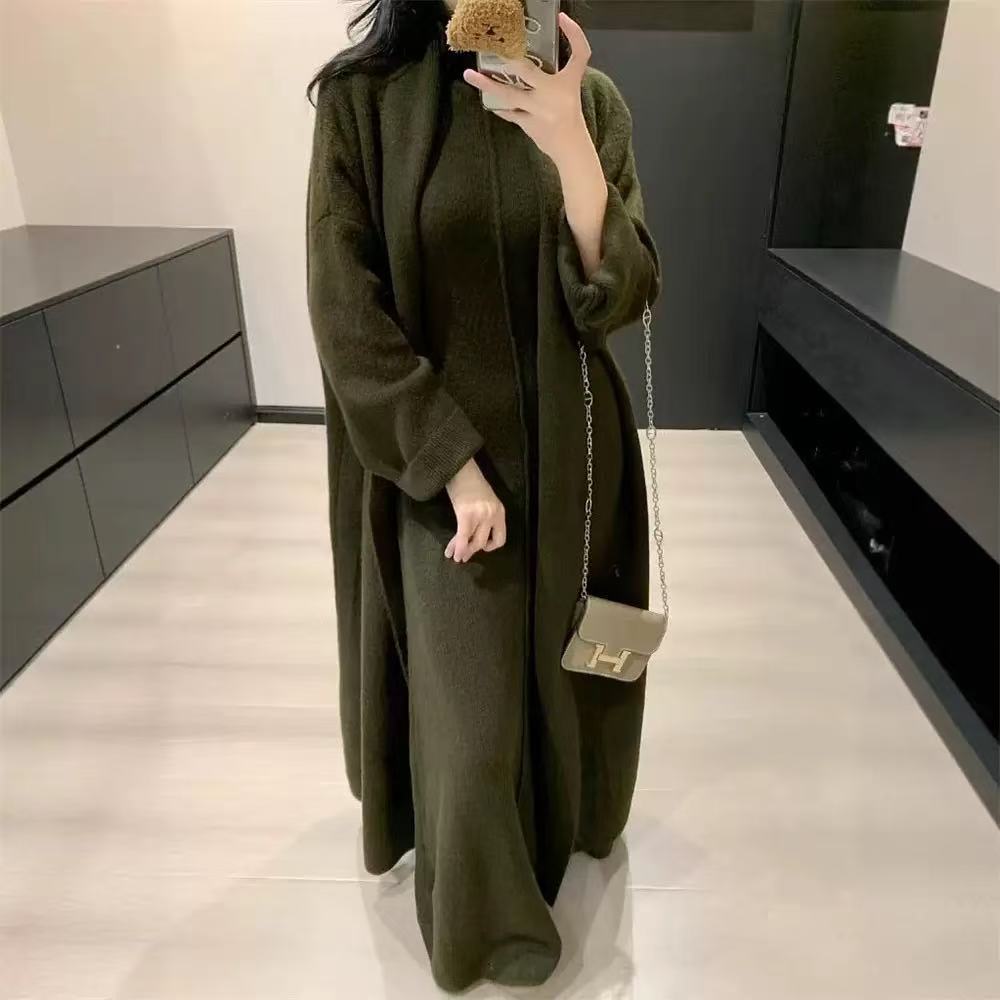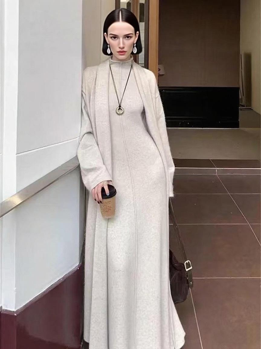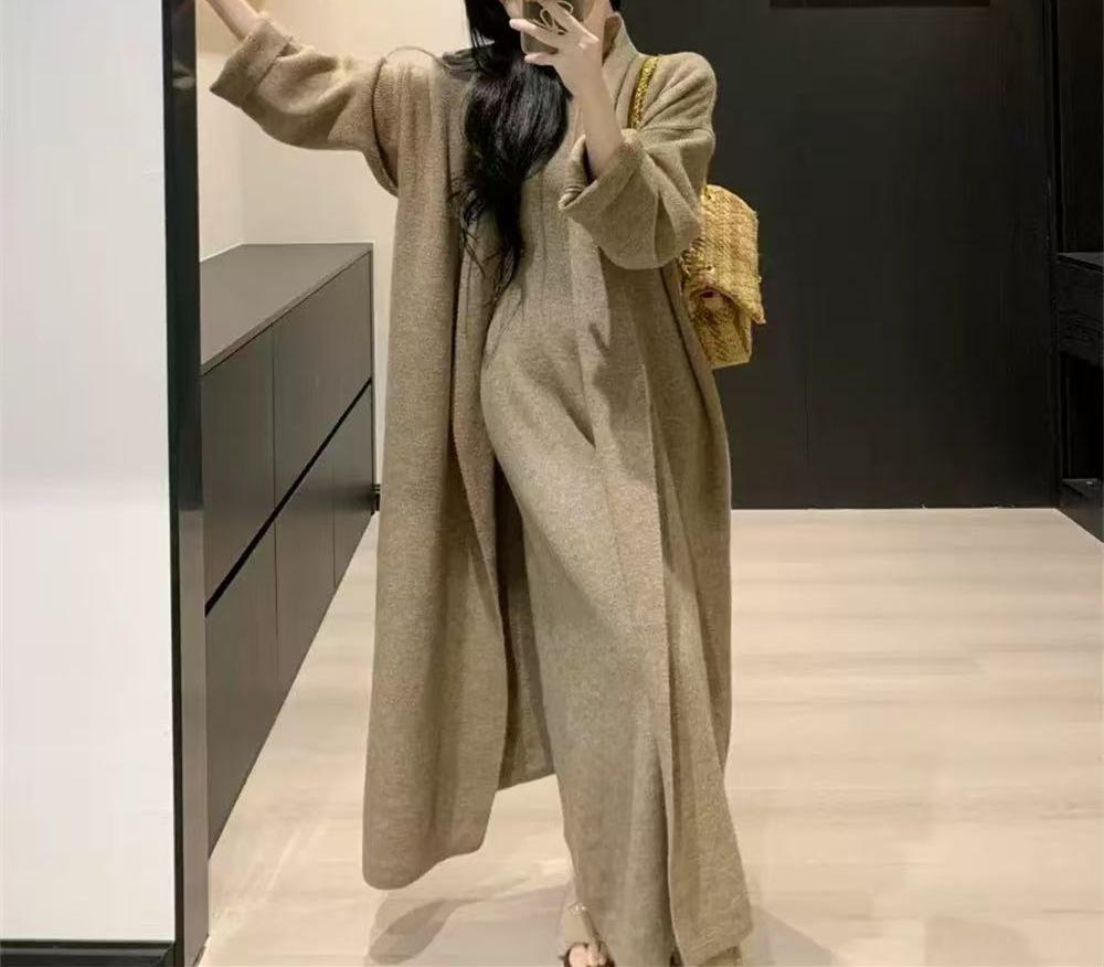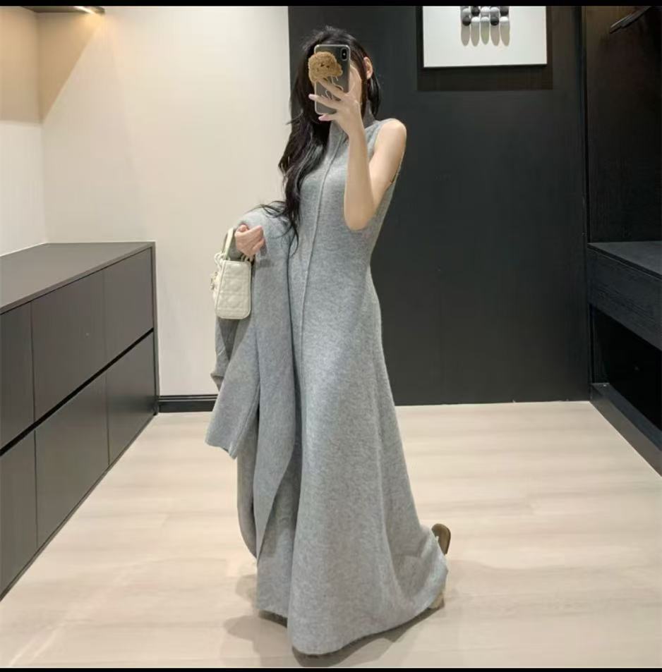 Vestido Largo de Punto de Otoño e Invierno, Cuello Alto, Vestido Chaleco sin Mangas, Abrigo Elegante, Cárdigan y Vestido Suéter Conjunto de Dos Piezas