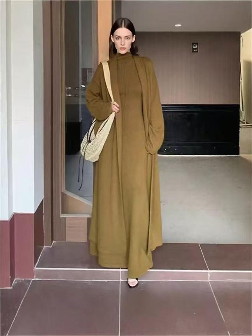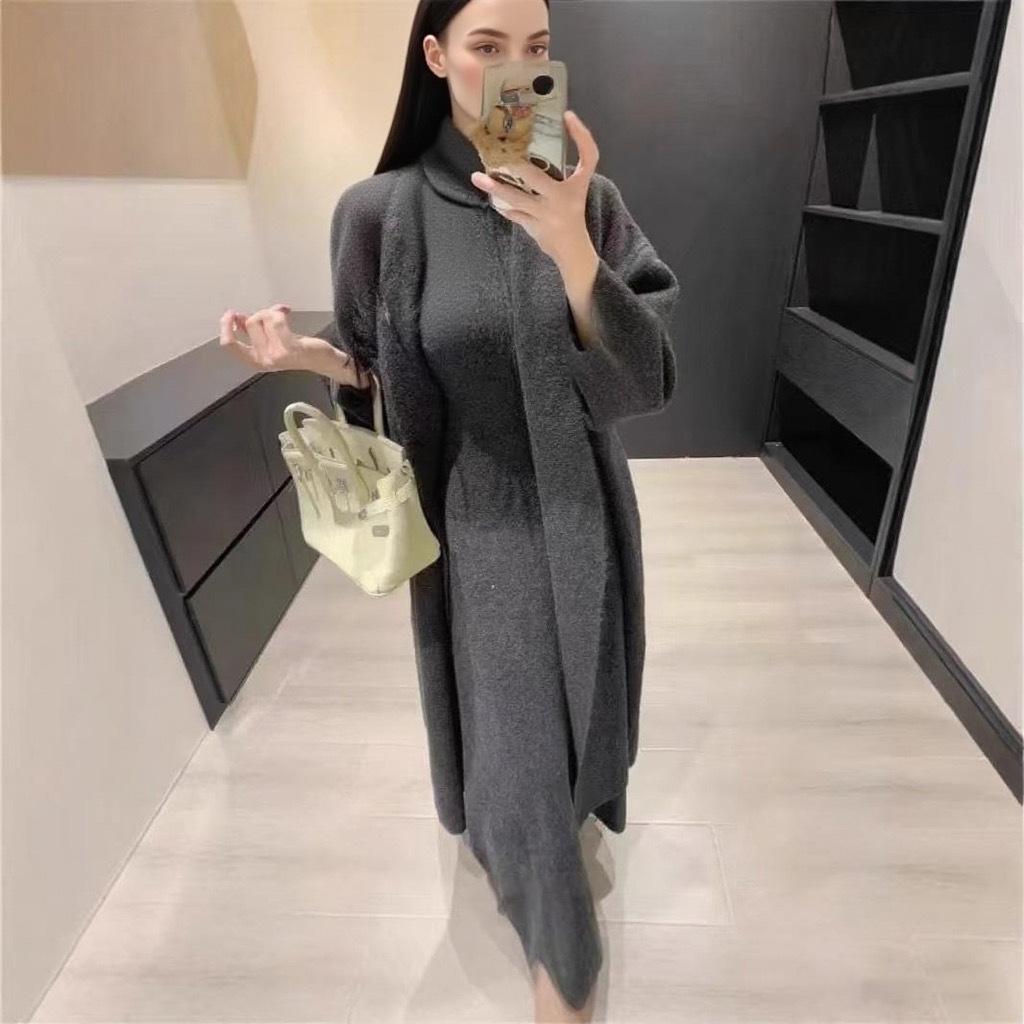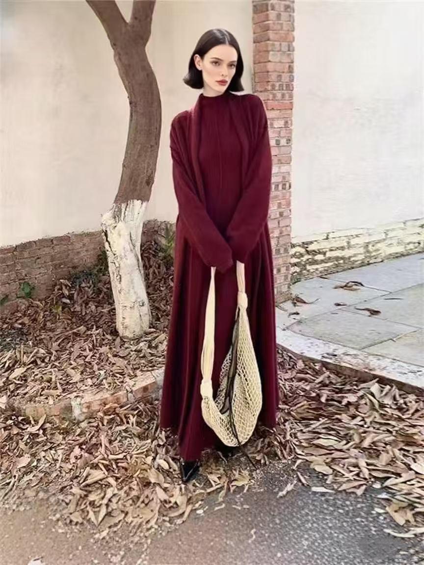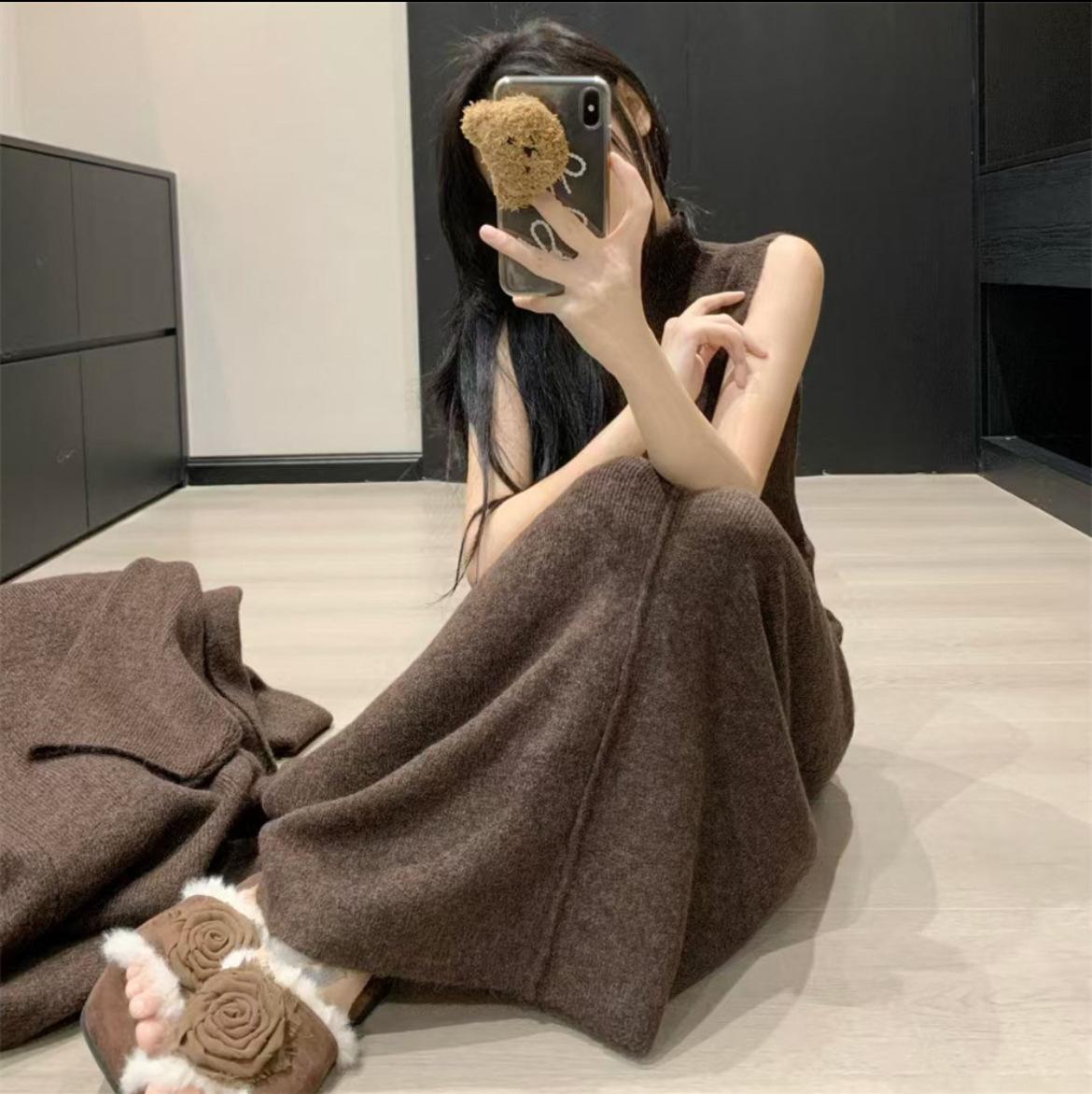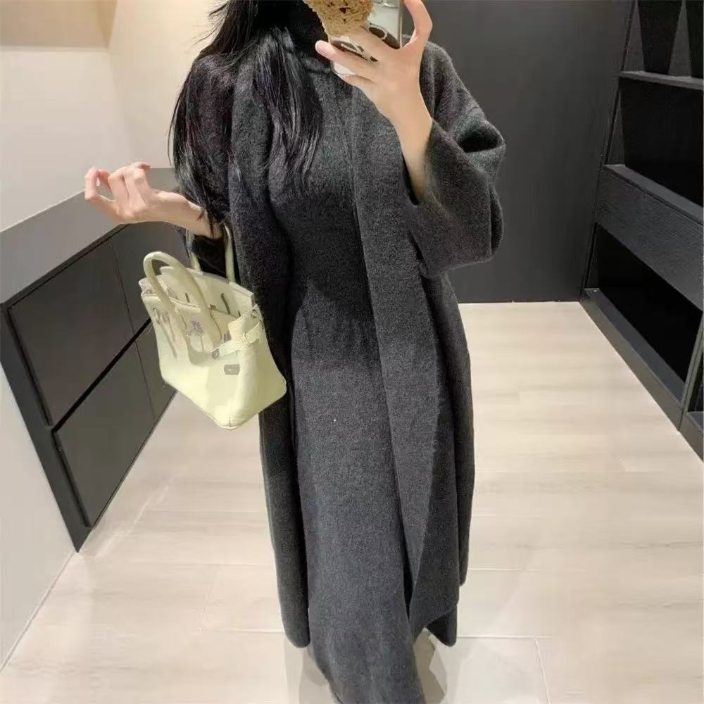 Vestido Largo de Punto de Otoño e Invierno, Cuello Alto, Vestido Chaleco sin Mangas, Abrigo Elegante, Cárdigan y Vestido Suéter Conjunto de Dos Piezas