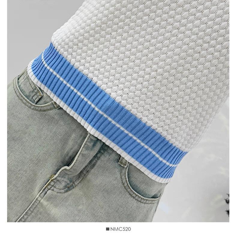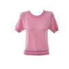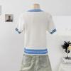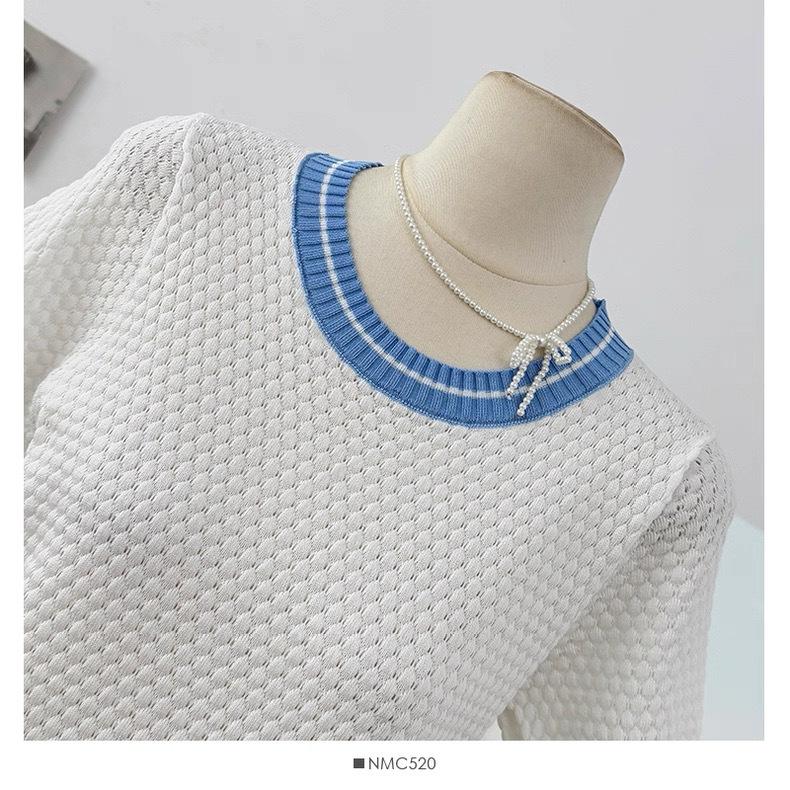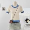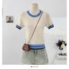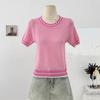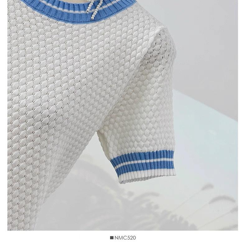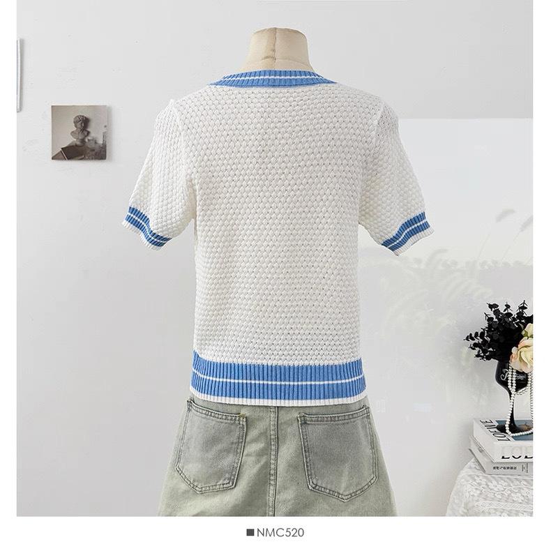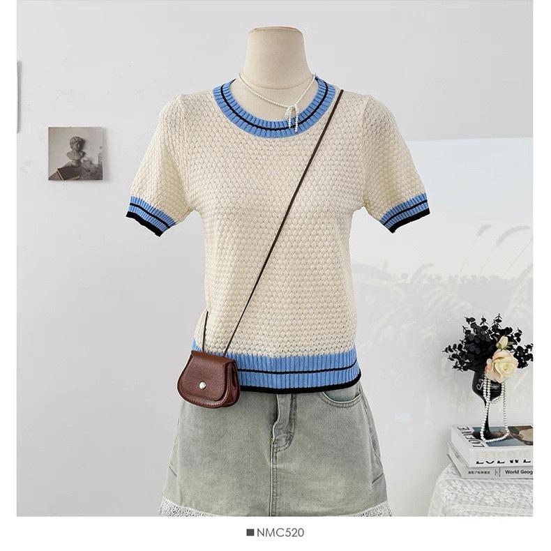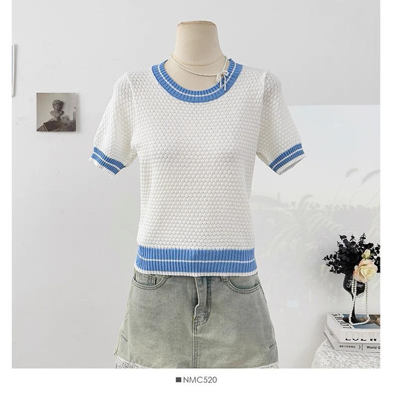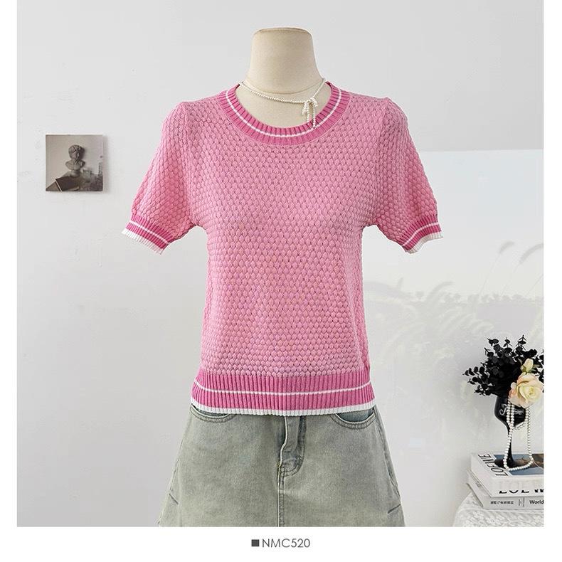 Top de Punto de Manga Corta con Cuello Redondo y Rayas de Bloque de Color Dulce y Fresco para Mujer, Verano, Delgado, Calado, Adelgazante