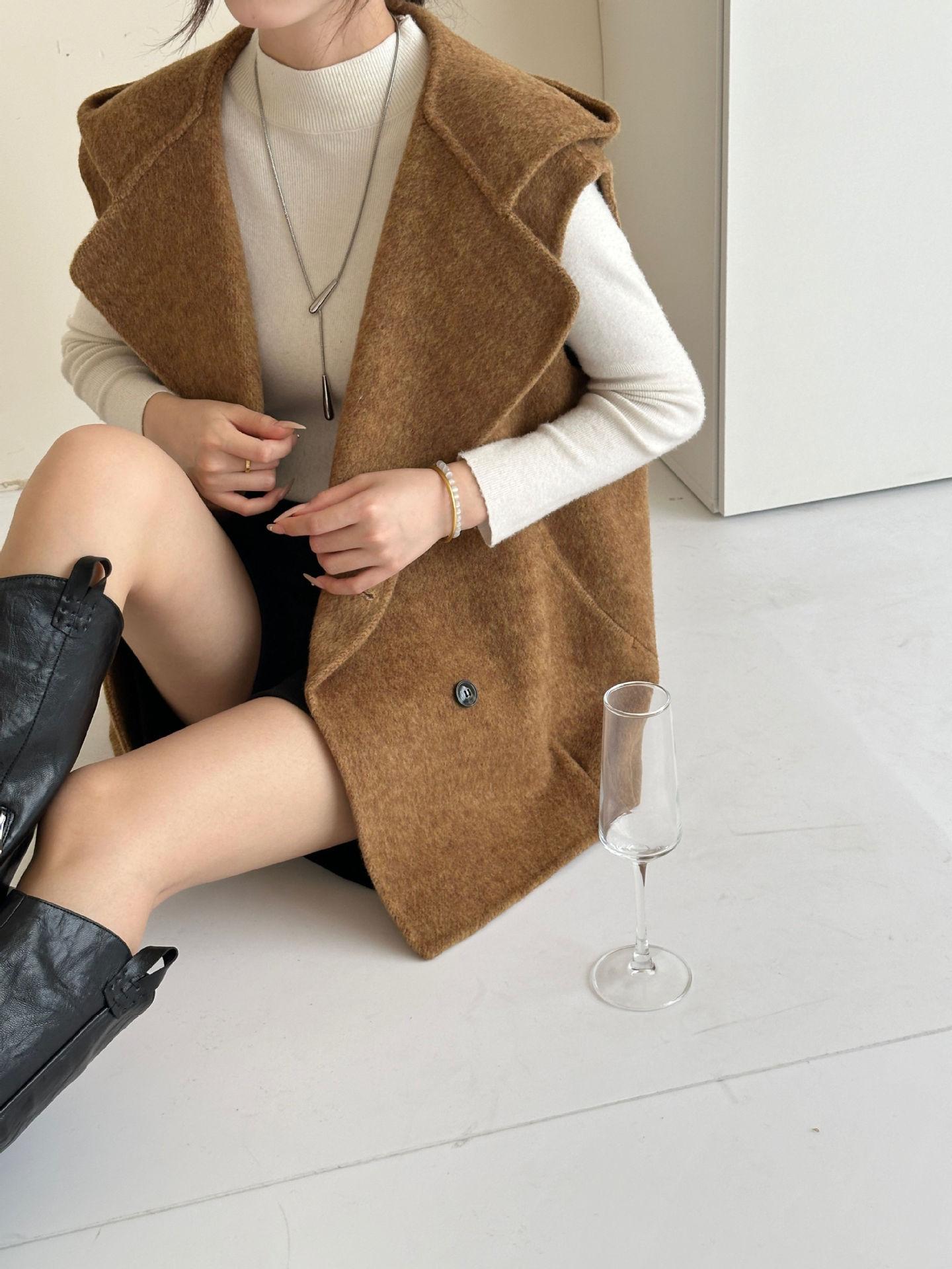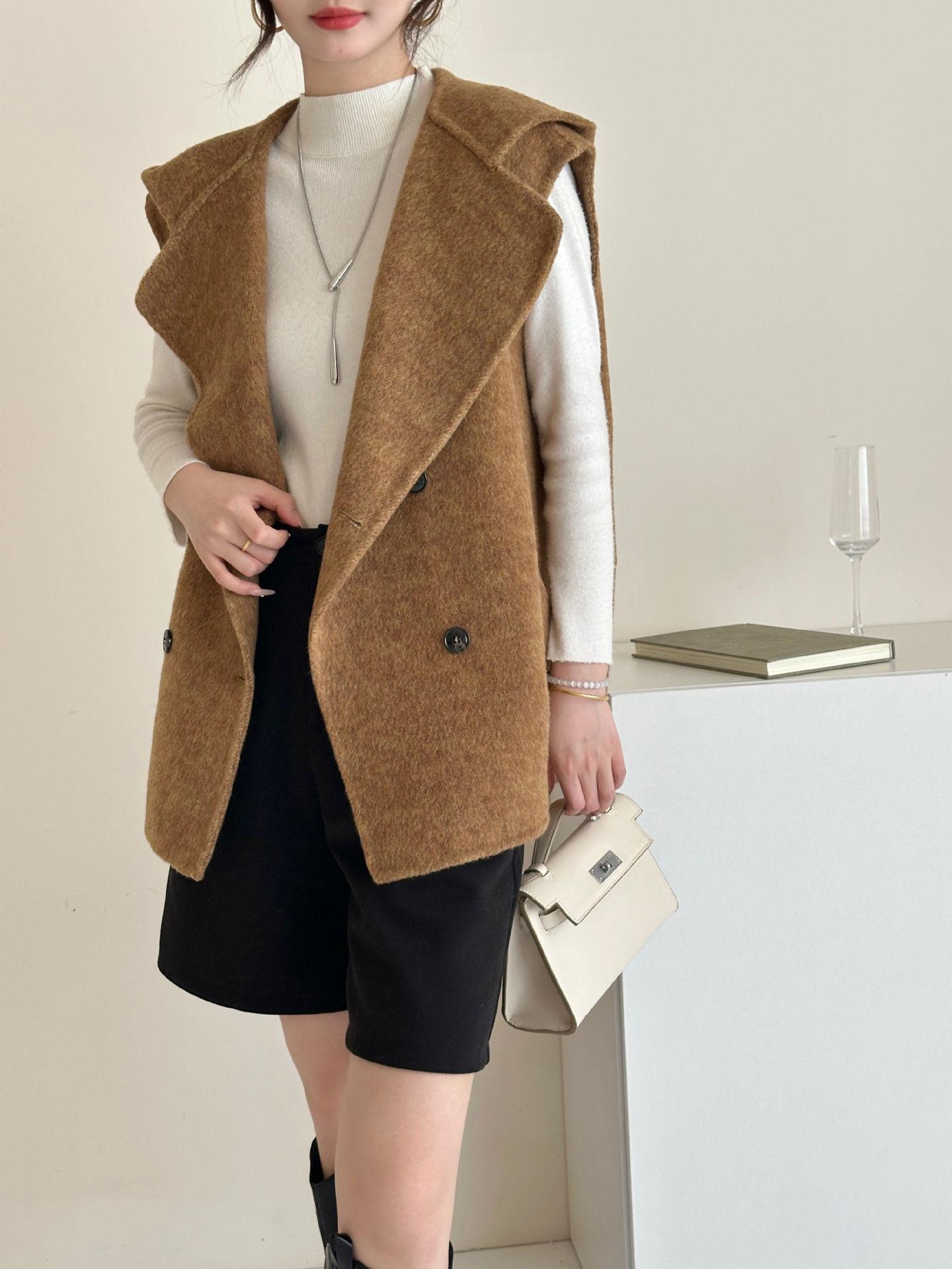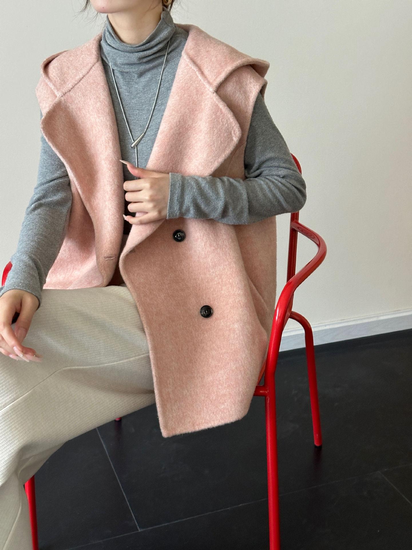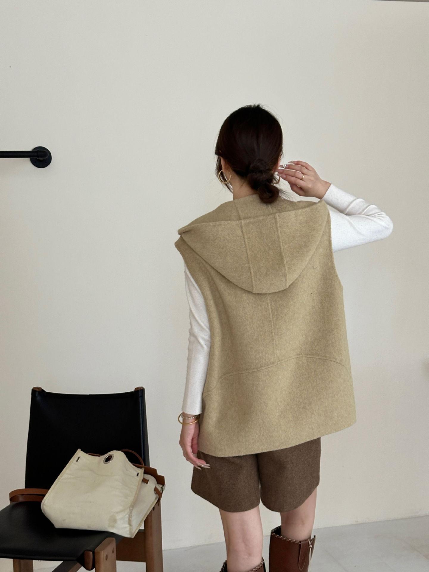 Chaleco de Lana sin Mangas de Largo Medio para Mujer Otoño e Invierno Nuevo Chaleco de Lana para Mujer de Color Sólido con Capucha Doble Abotonadura Nylon de Doble Cara