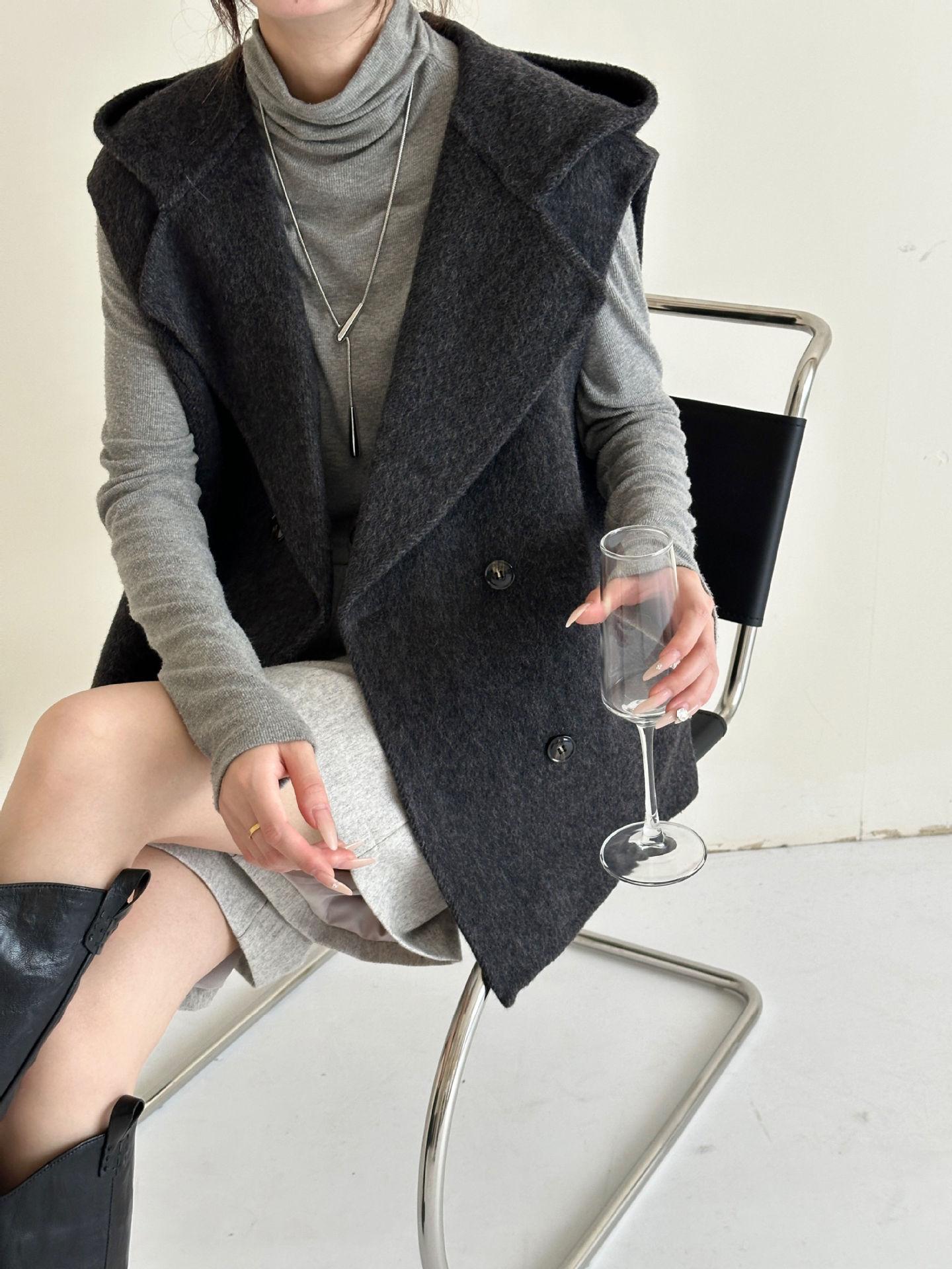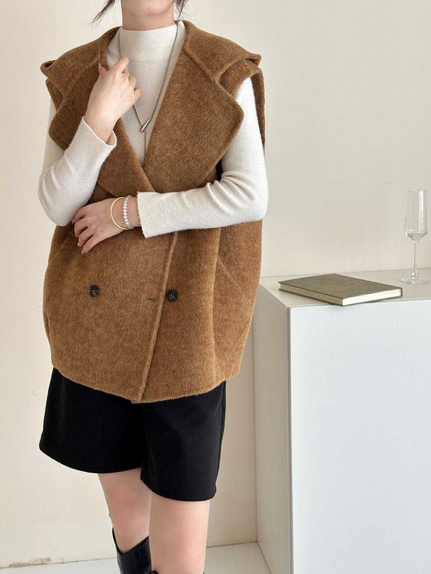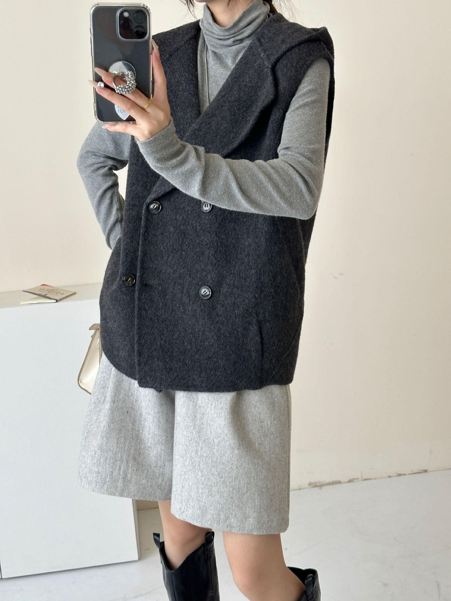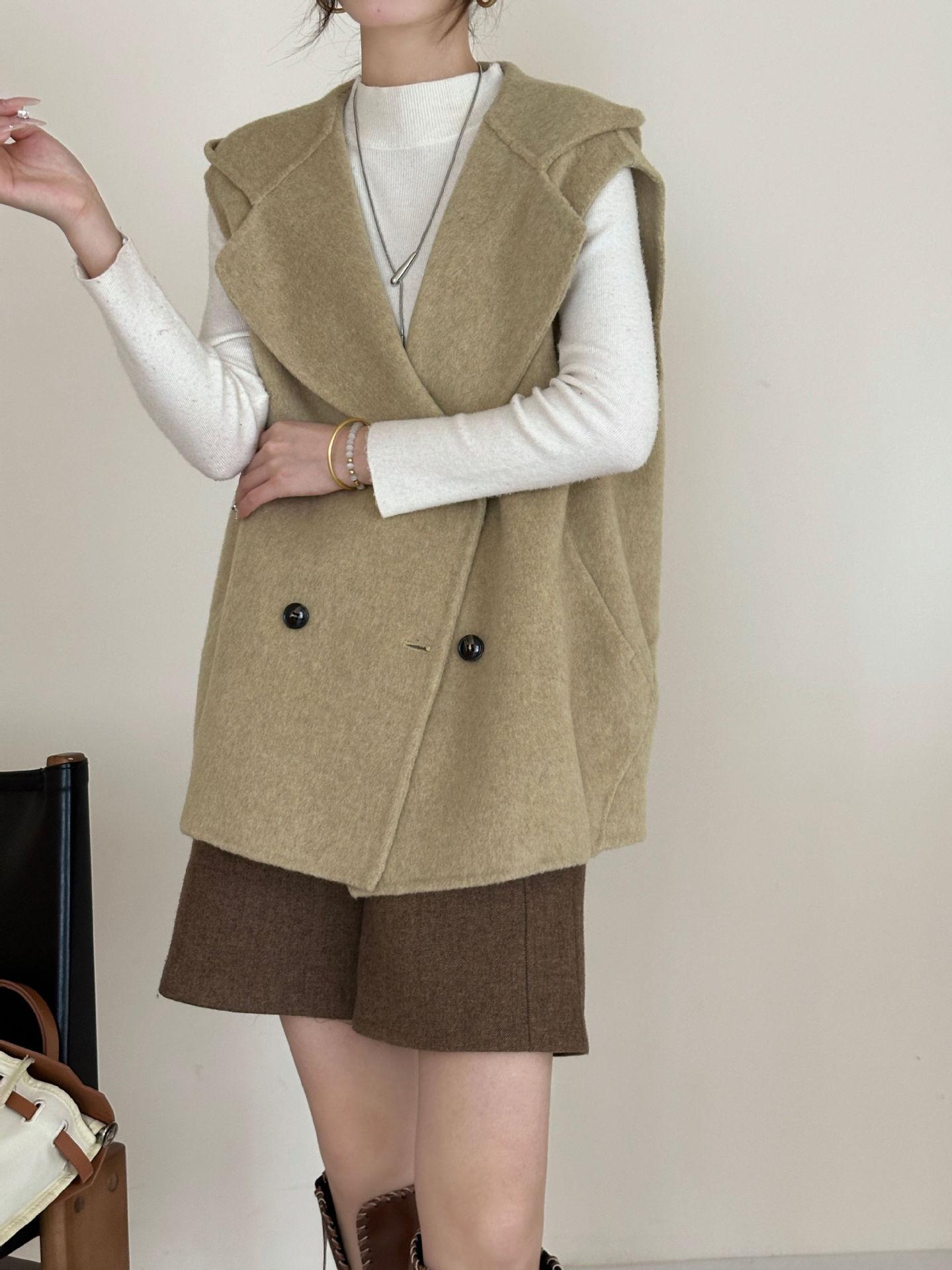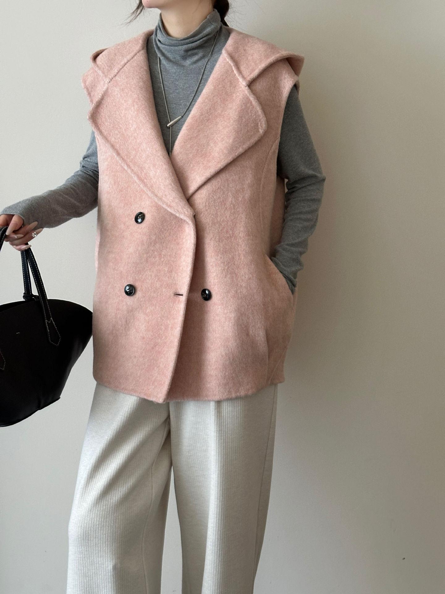 Chaleco de Lana sin Mangas de Largo Medio para Mujer Otoño e Invierno Nuevo Chaleco de Lana para Mujer de Color Sólido con Capucha Doble Abotonadura Nylon de Doble Cara