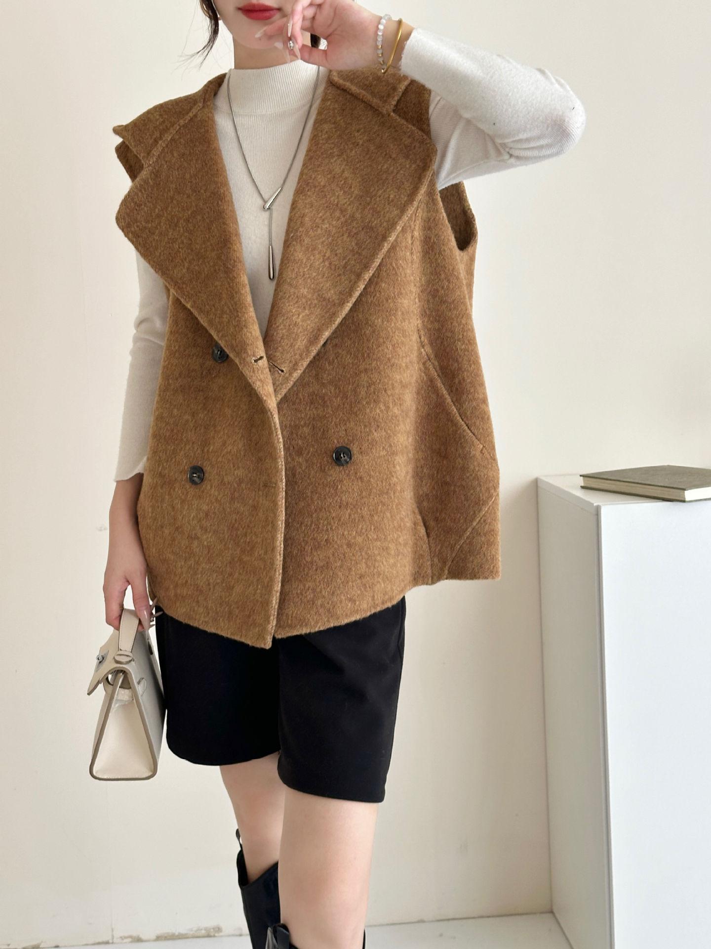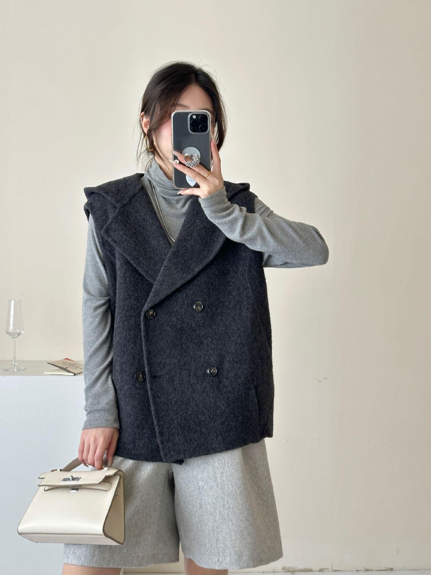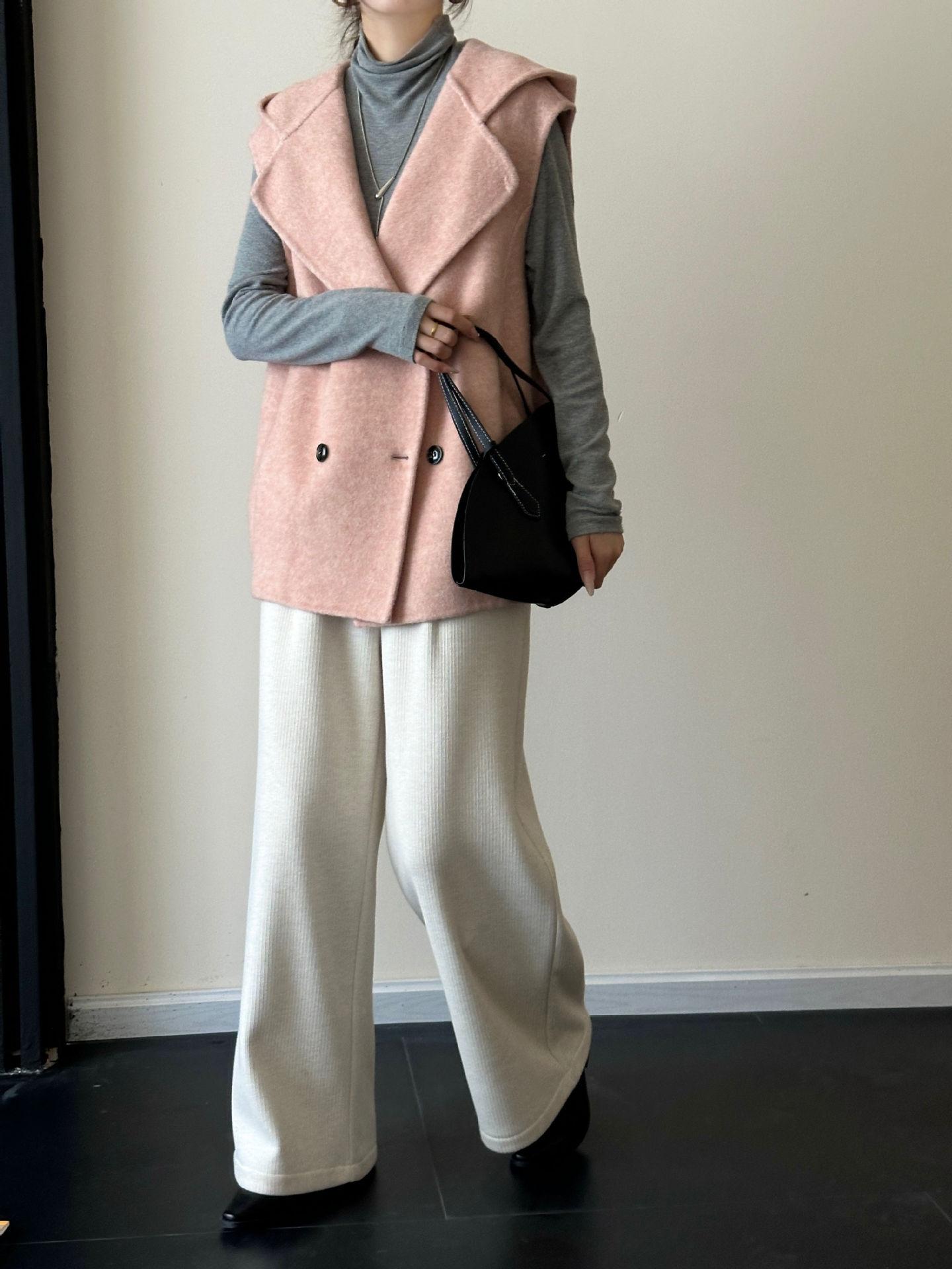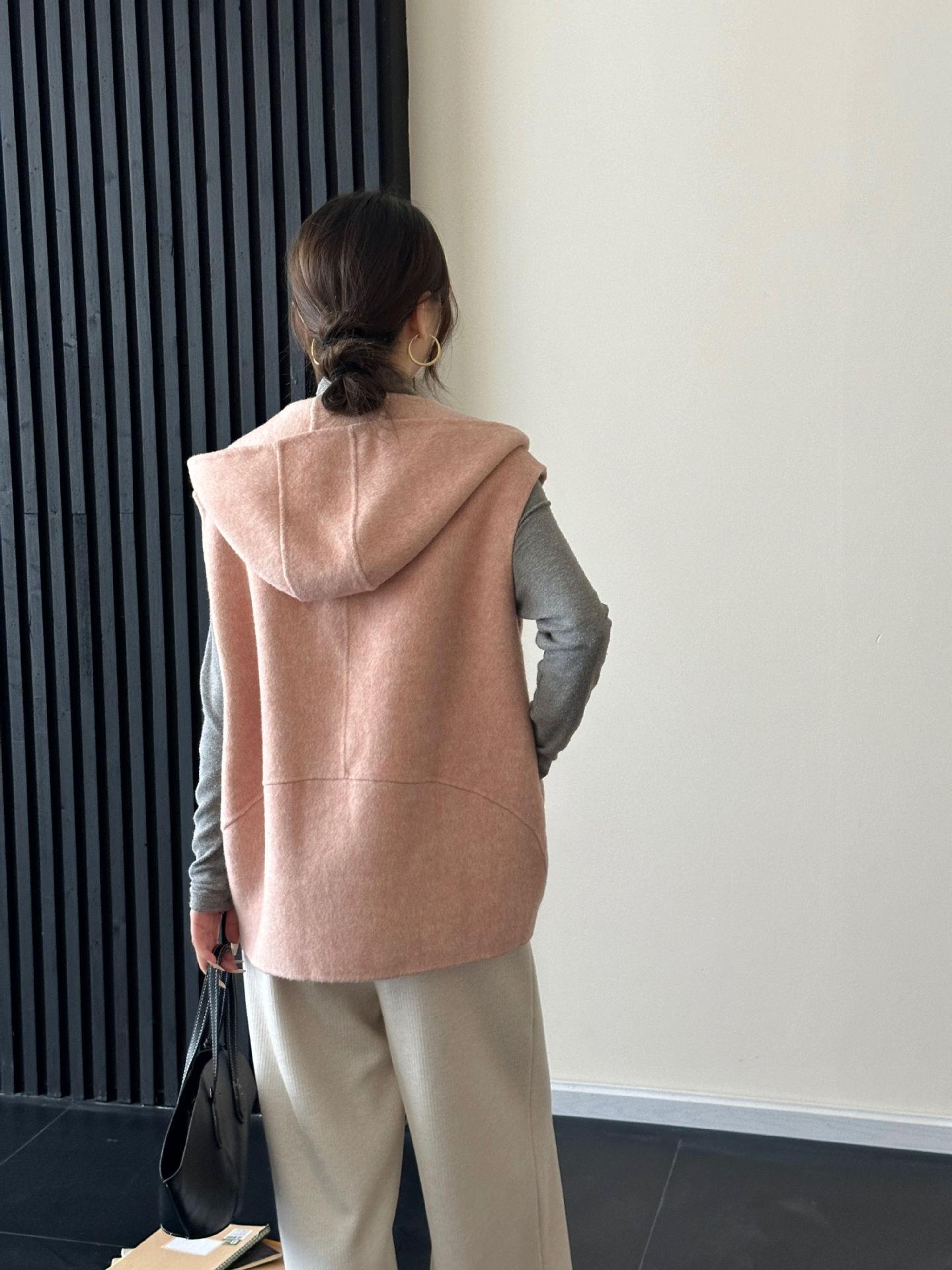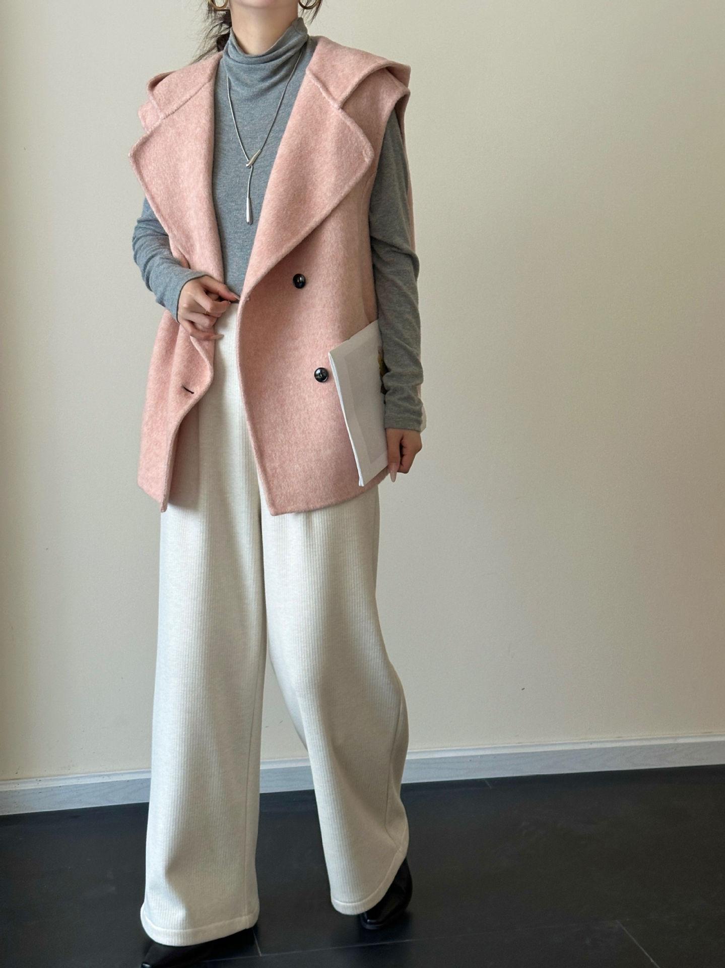 Chaleco de Lana sin Mangas de Largo Medio para Mujer Otoño e Invierno Nuevo Chaleco de Lana para Mujer de Color Sólido con Capucha Doble Abotonadura Nylon de Doble Cara