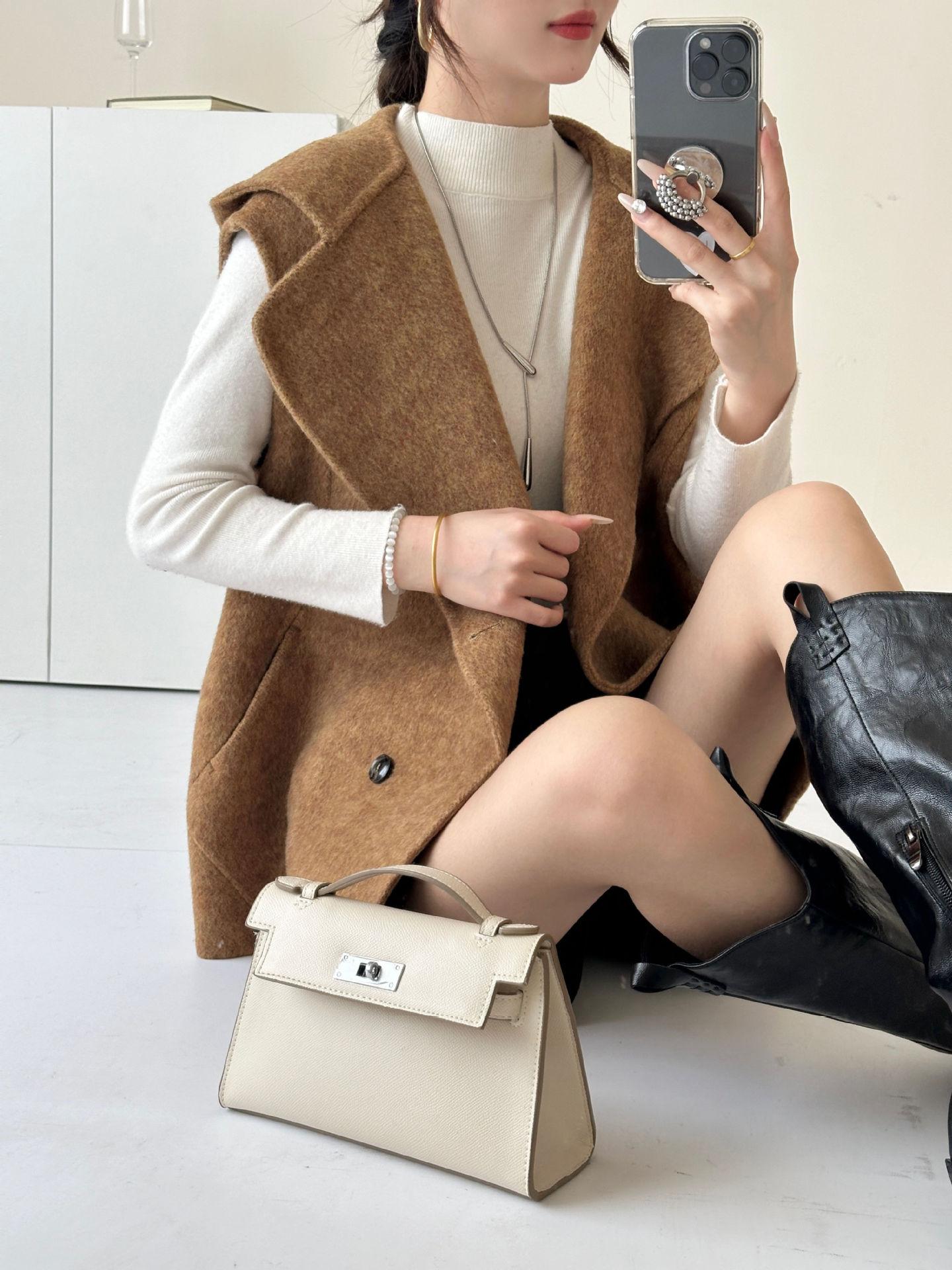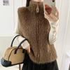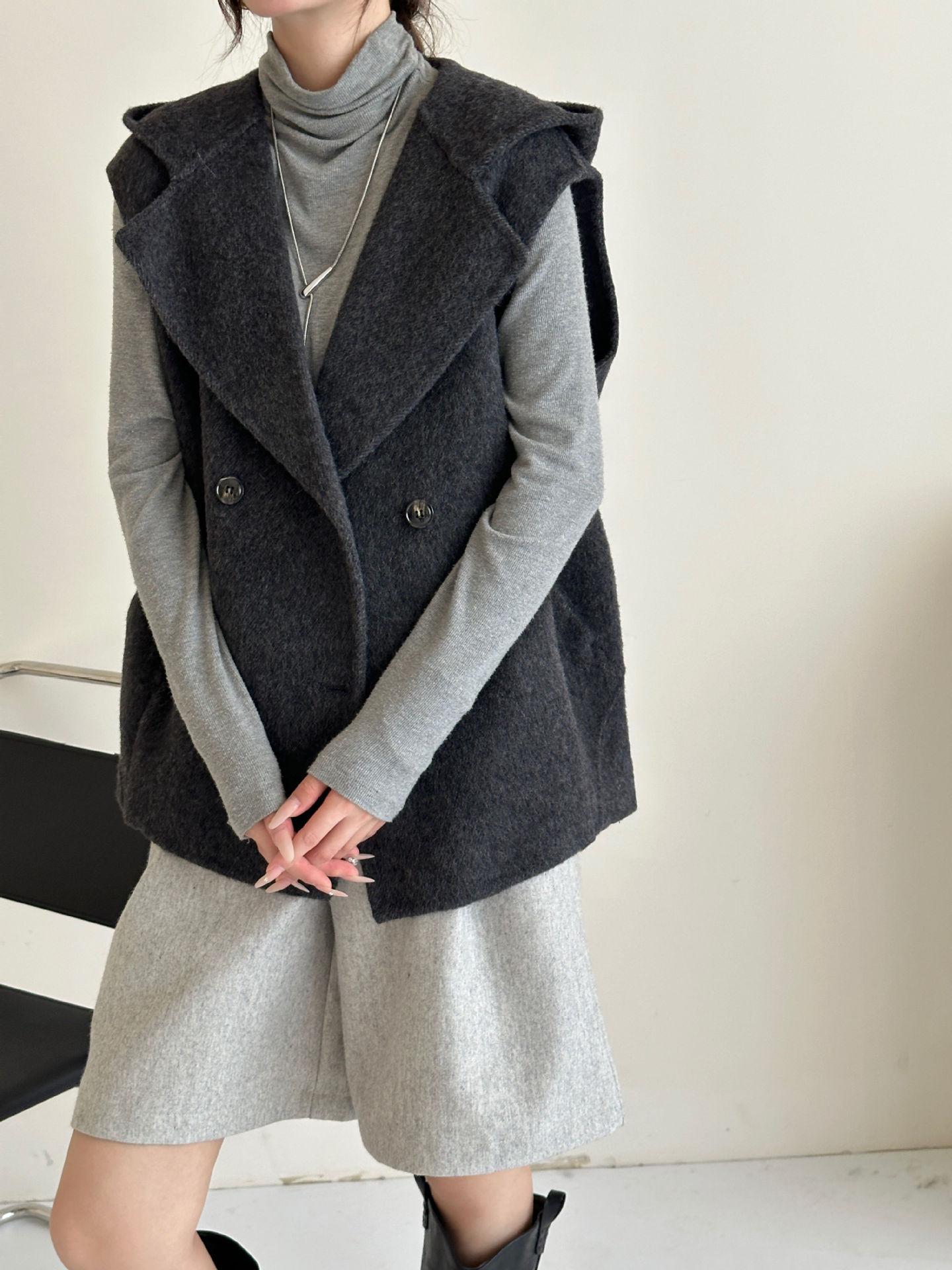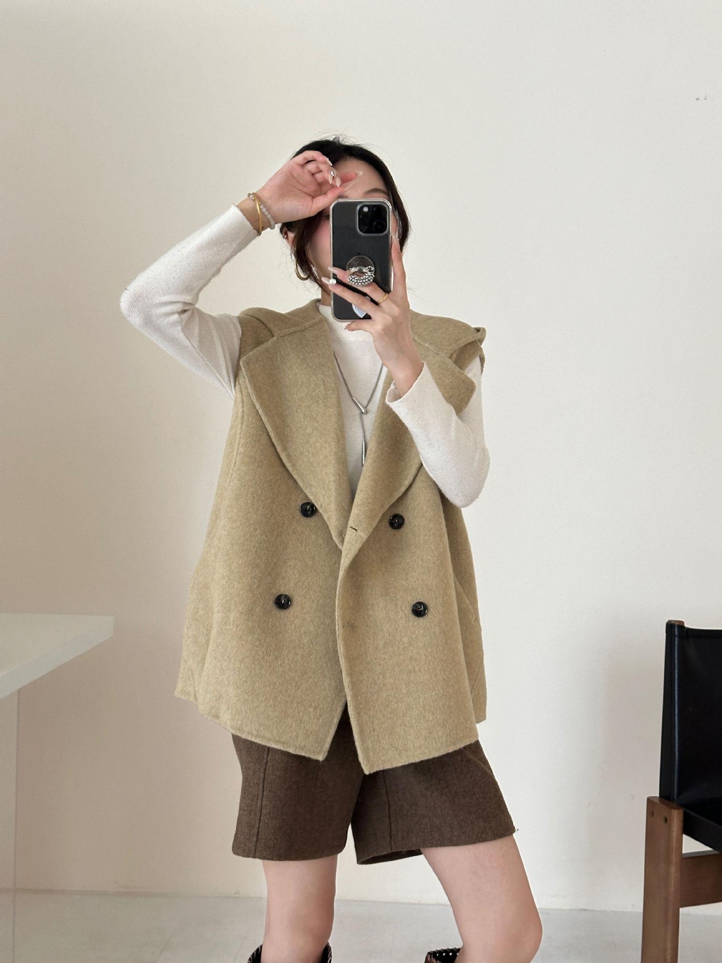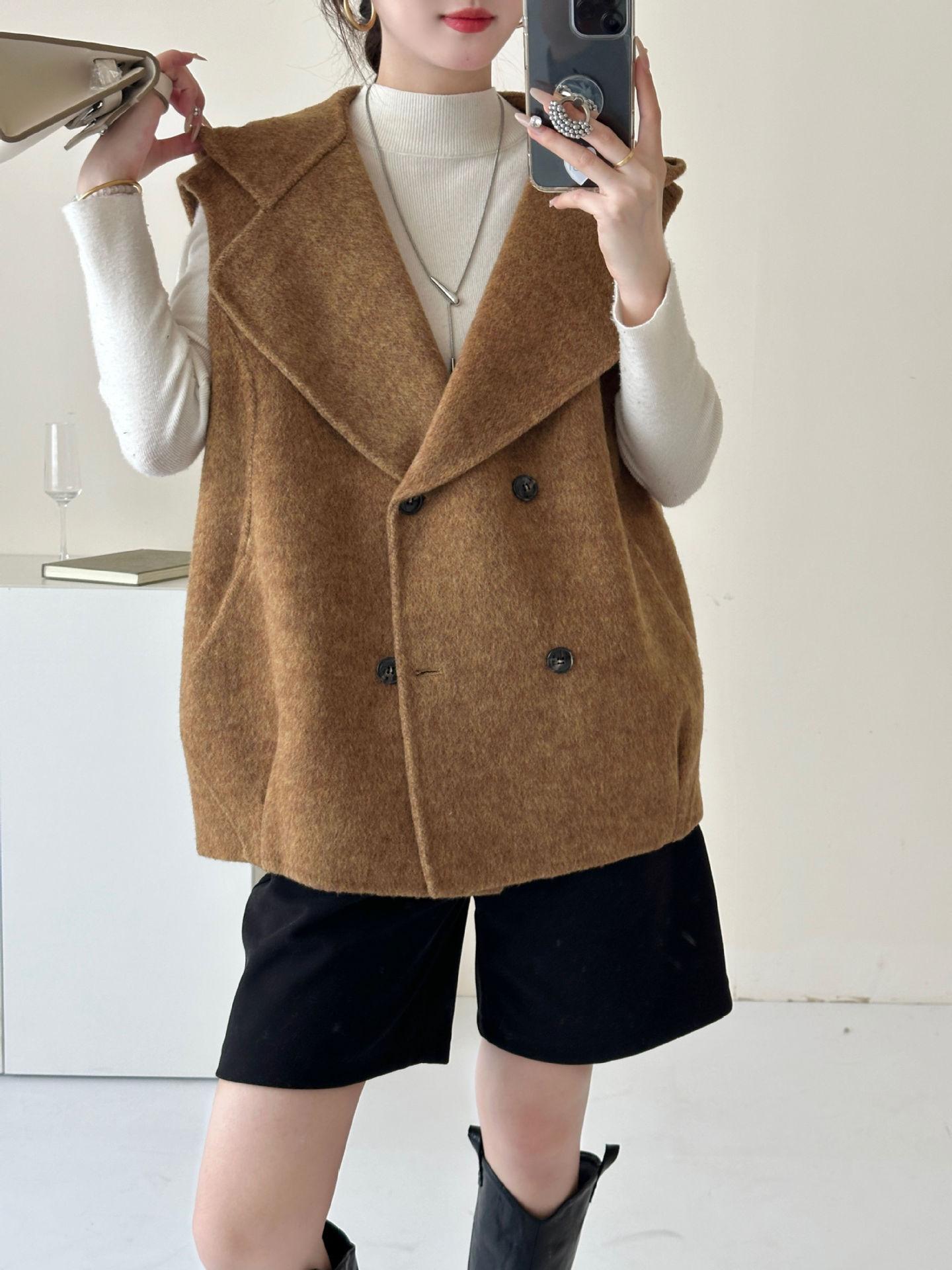 Chaleco de Lana sin Mangas de Largo Medio para Mujer Otoño e Invierno Nuevo Chaleco de Lana para Mujer de Color Sólido con Capucha Doble Abotonadura Nylon de Doble Cara