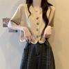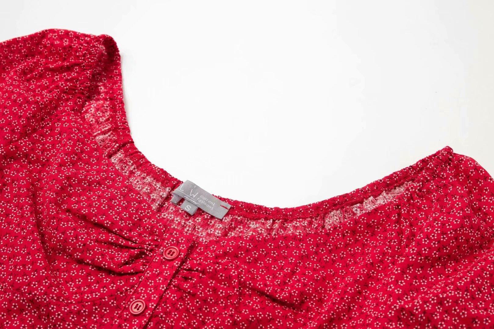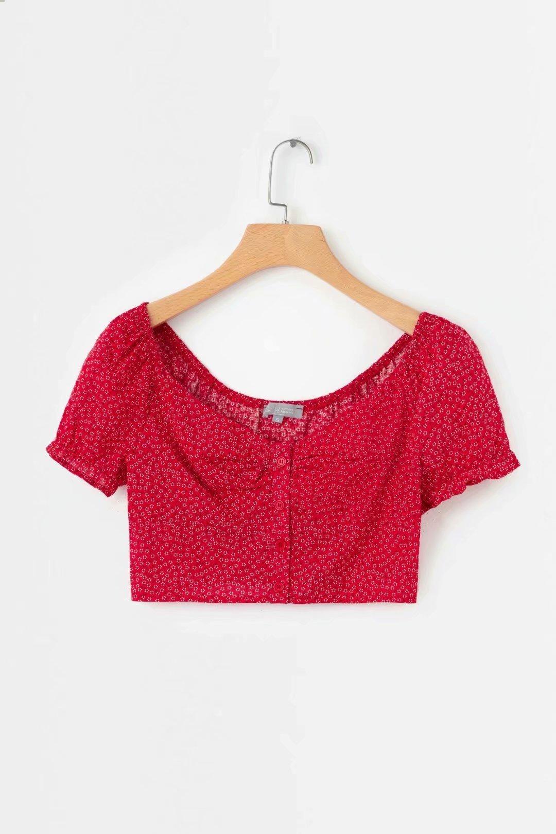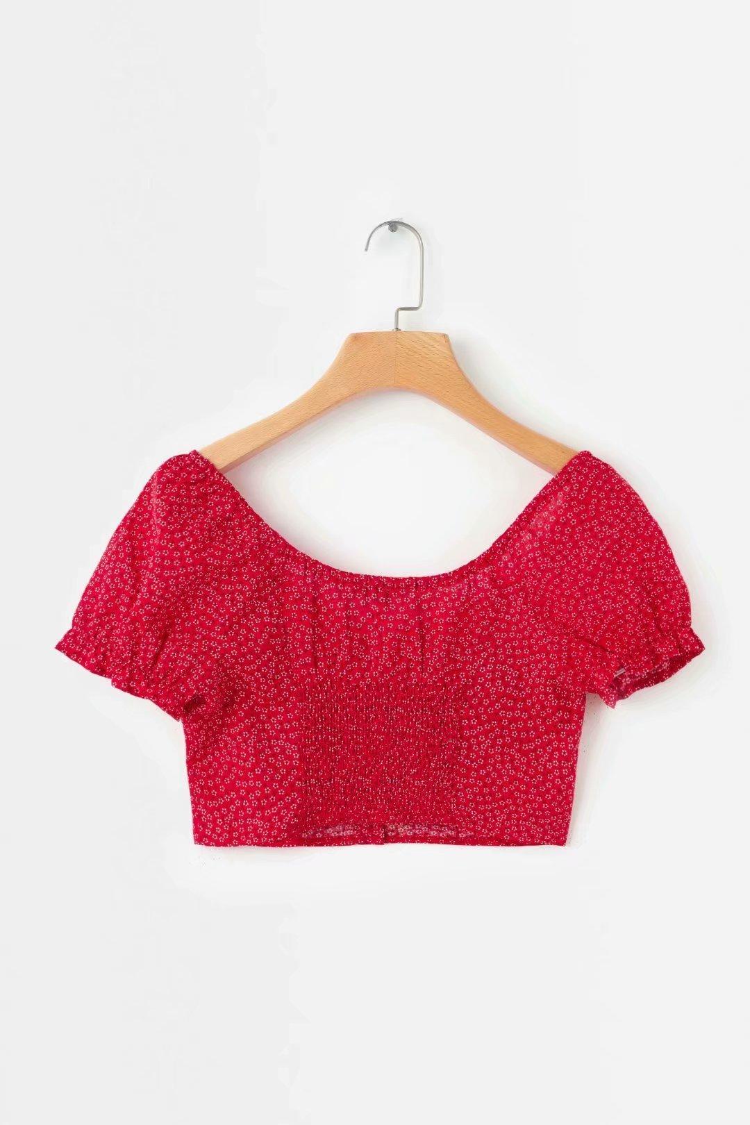 Primavera 2021 nuevo top corto elegante de viaje de corte ajustado con estampado de estilo europeo y americano que deja al descubierto la cintura y manga corta con cuello