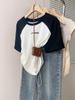 Playera de Manga Corta de Algodón Puro Retro Americano de Hombro Derecho para Mujer en Verano con Diseño de Color Contrastante Nicho Dulce y Picante Top Corto con Cordón