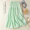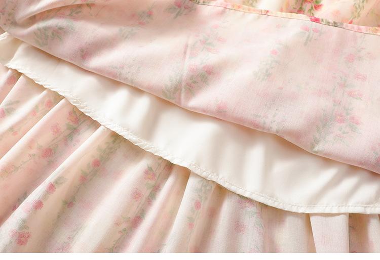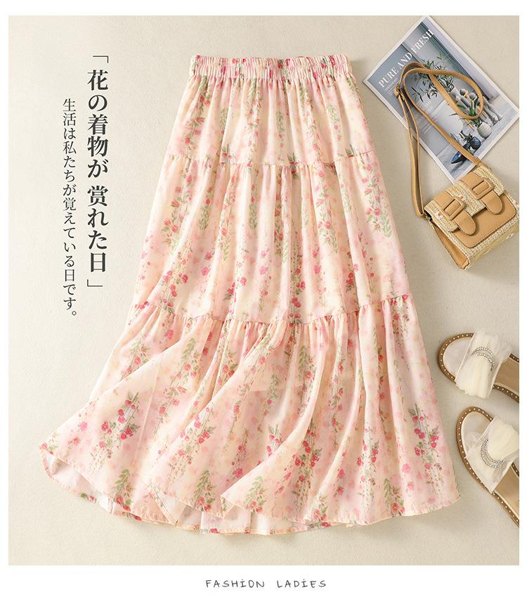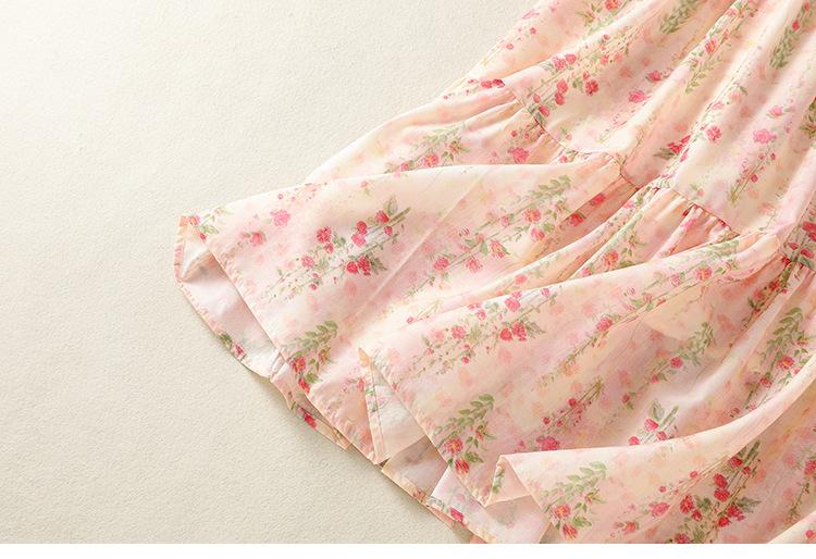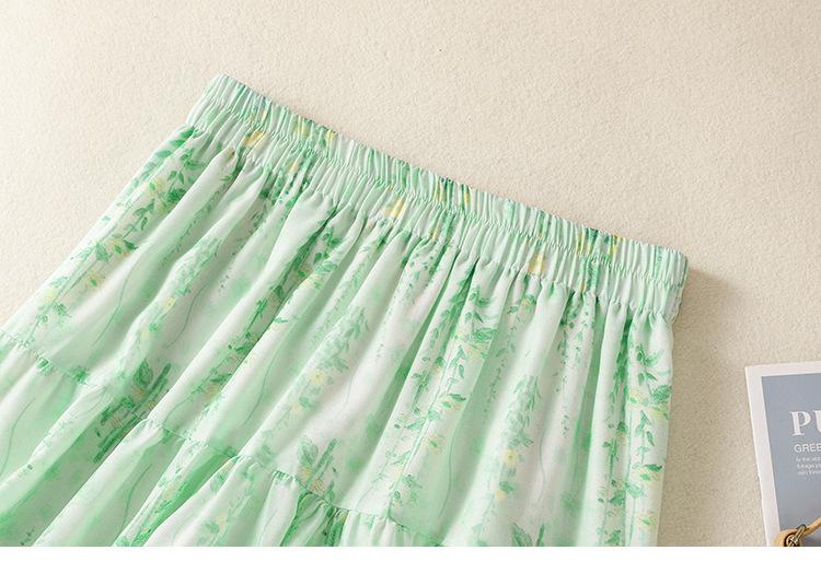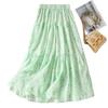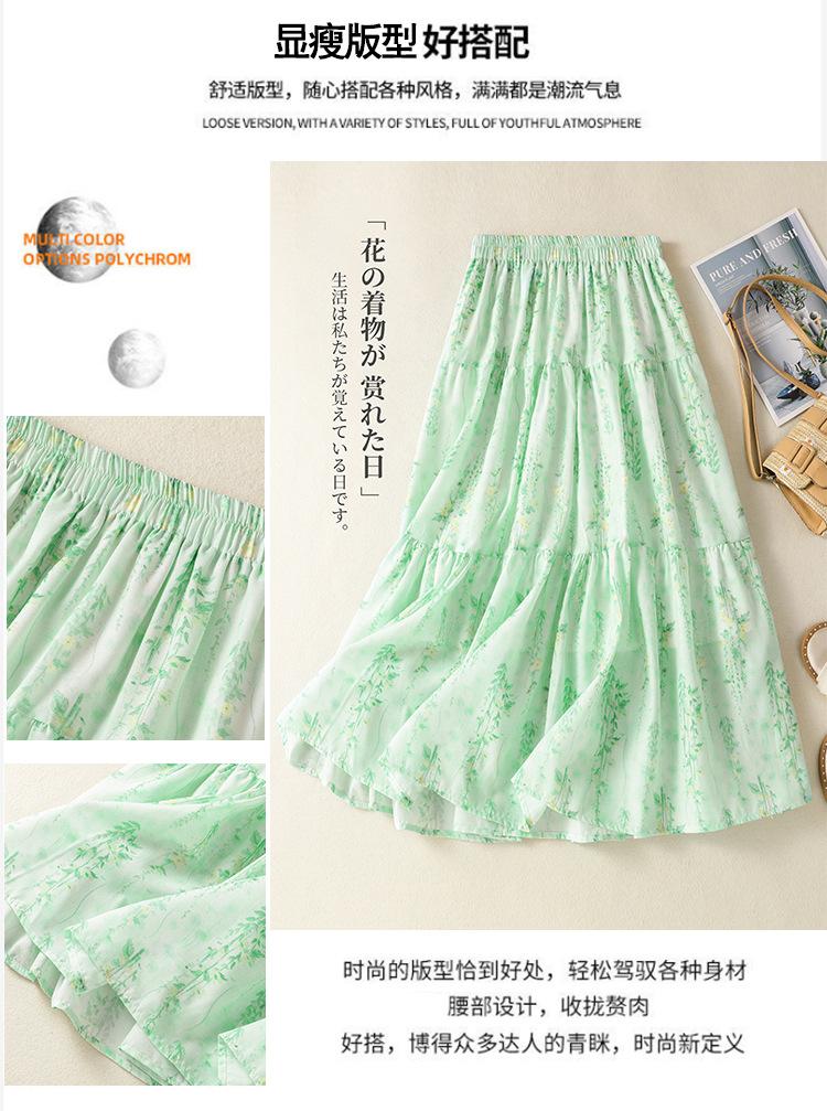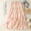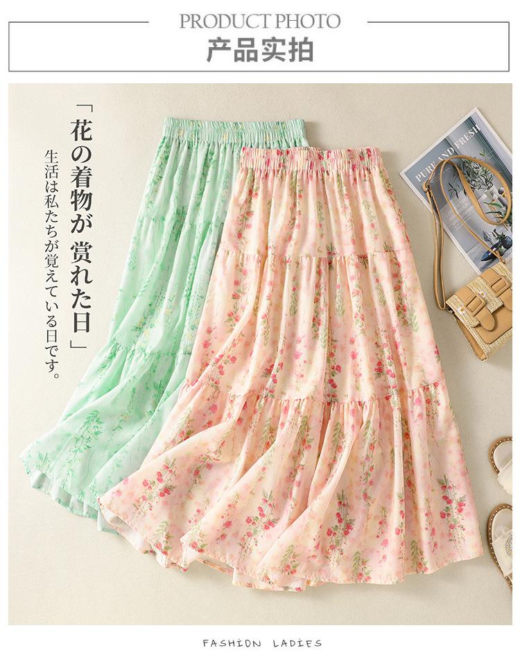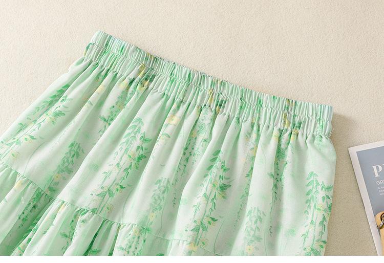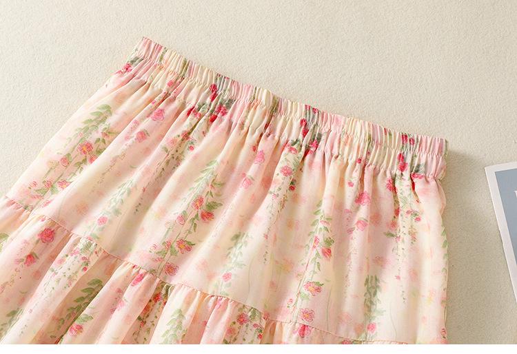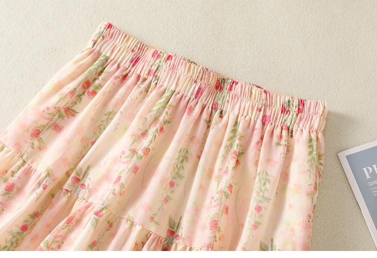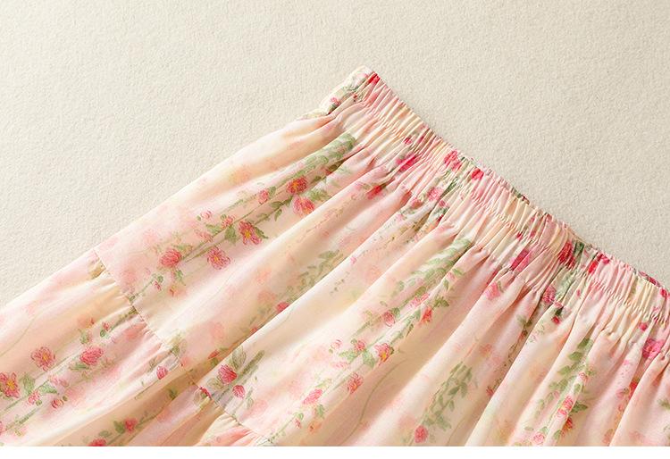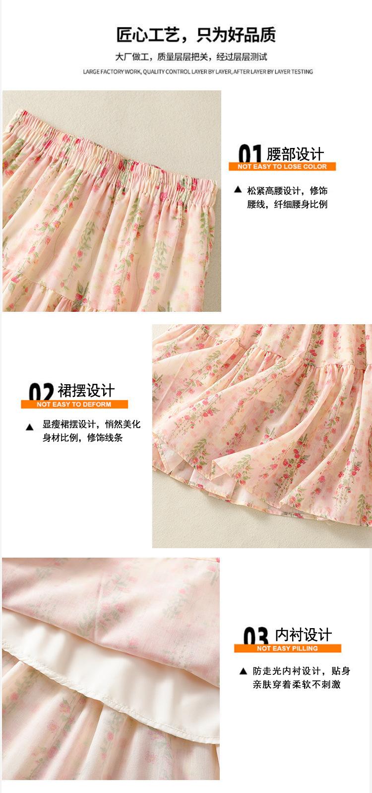 Foto real de la nueva falda forrada floral rosa y verde de estilo francés fresco pequeño para el verano 2025 con estilo suave y aspecto adelgazante
