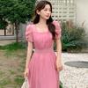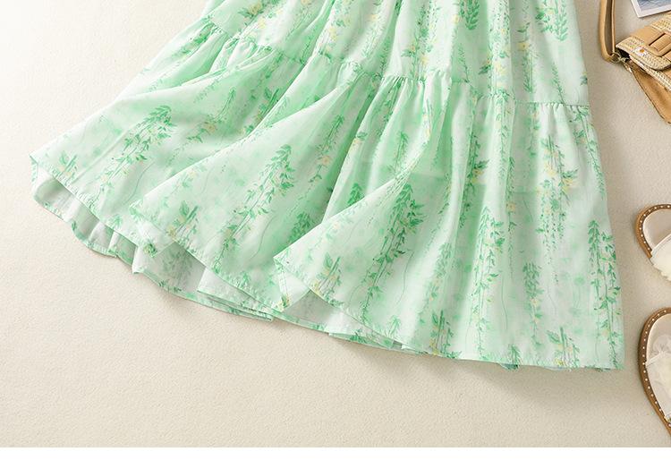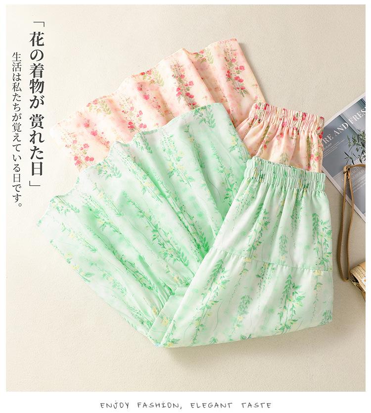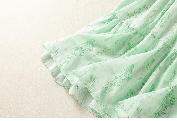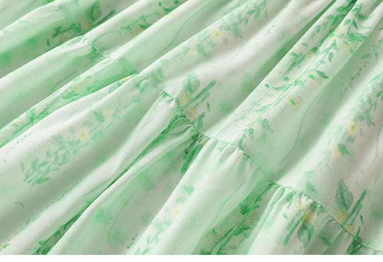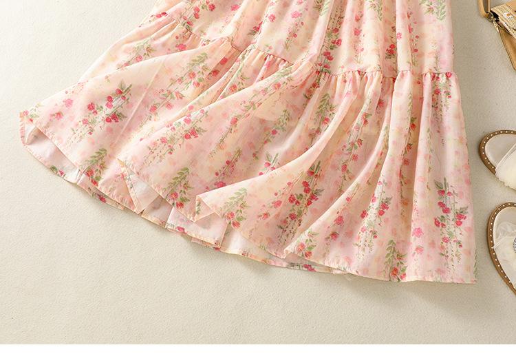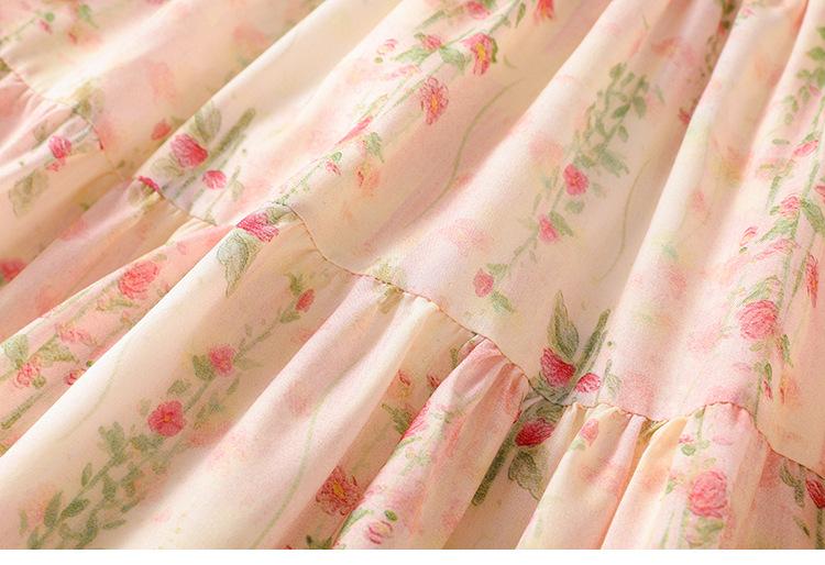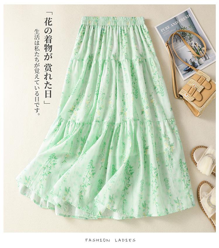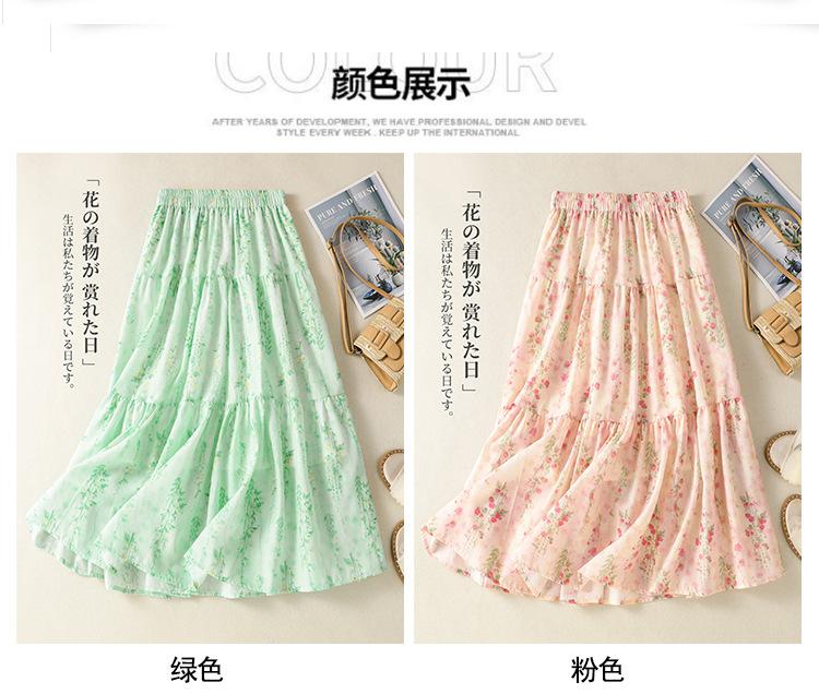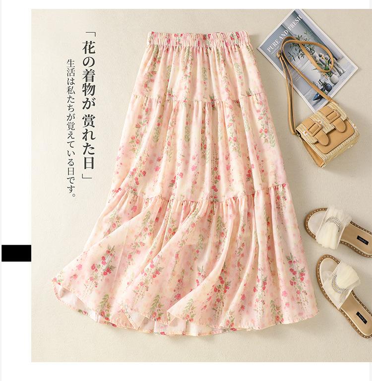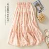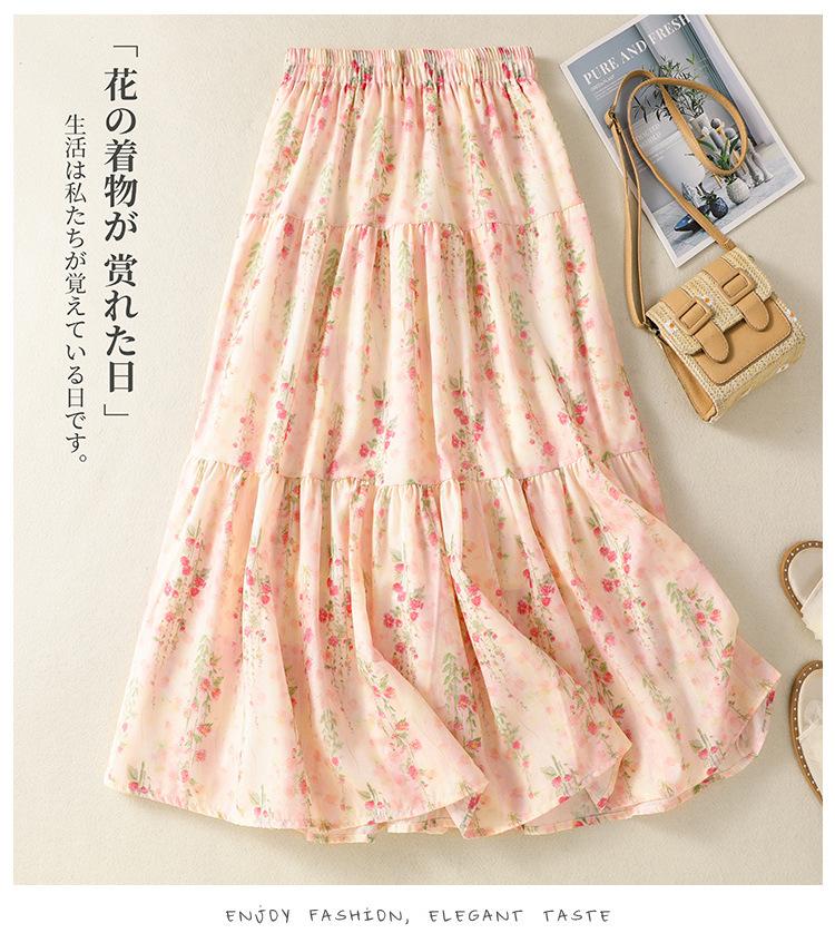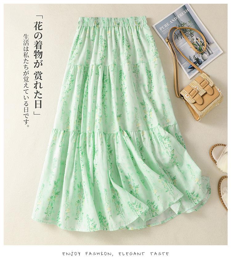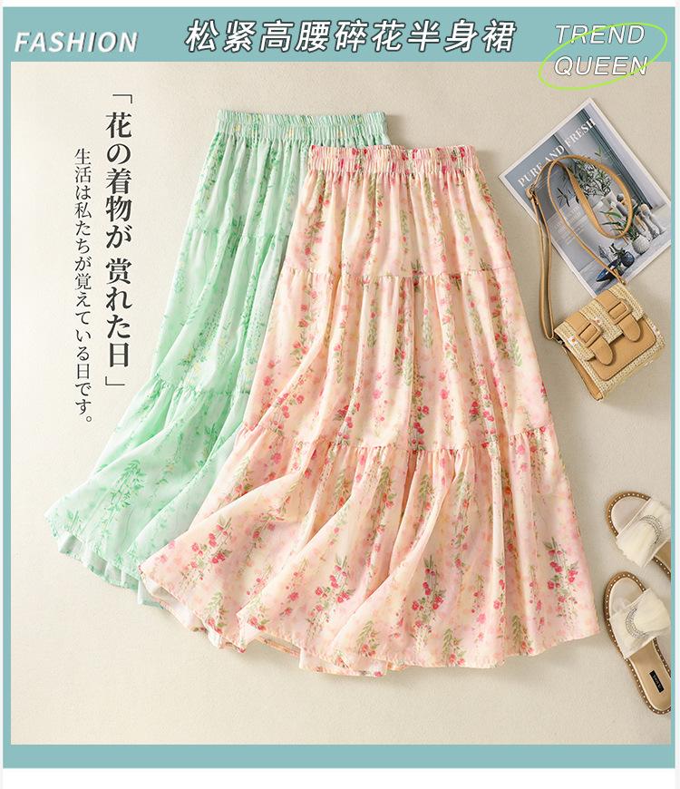 Foto real de la nueva falda forrada floral rosa y verde de estilo francés fresco pequeño para el verano 2025 con estilo suave y aspecto adelgazante