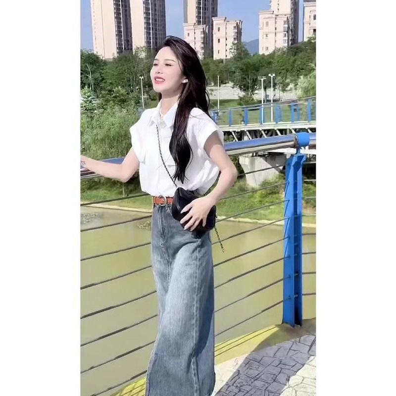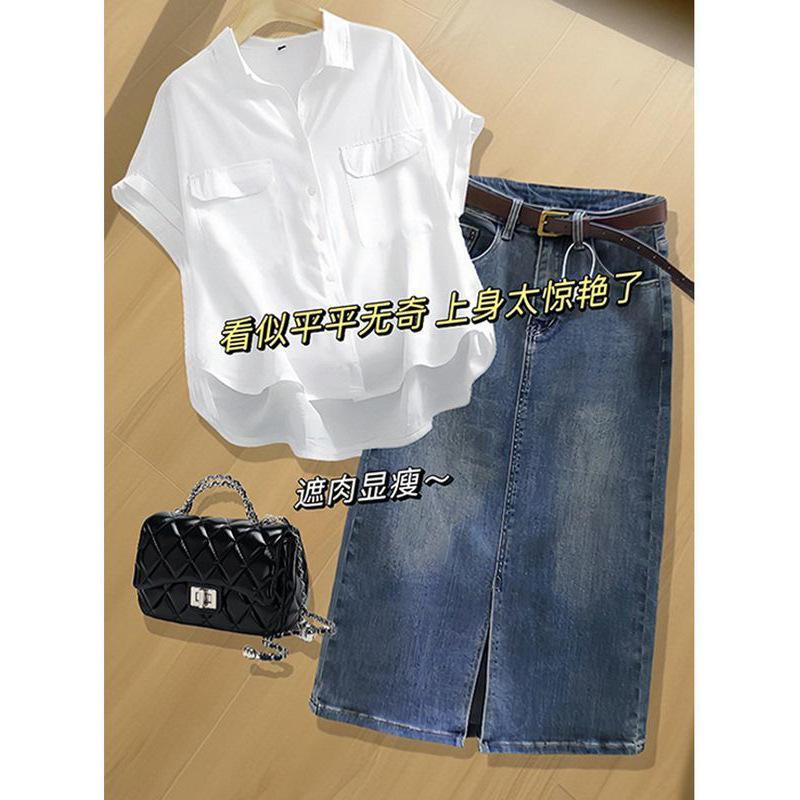 Temperamento usar un conjunto de ropa que reduce la edad verano camisa blanca pura retro falda de mezclilla traje de dos piezas para mujer