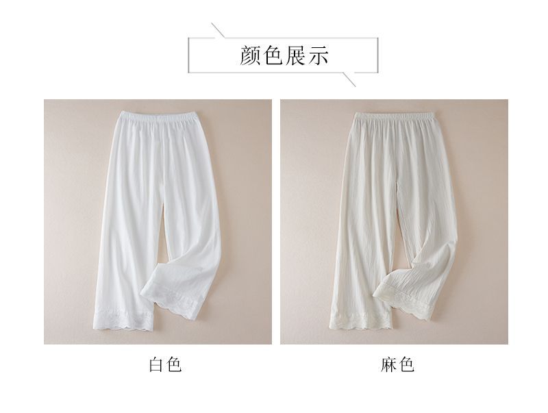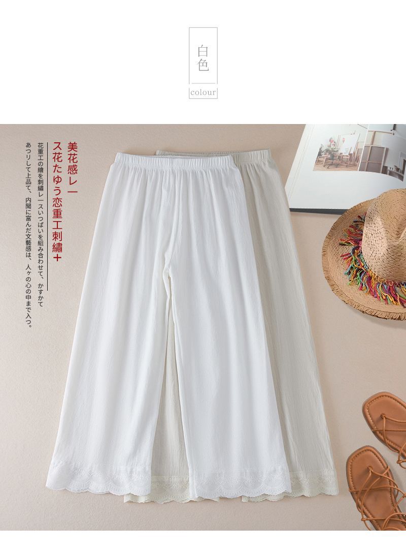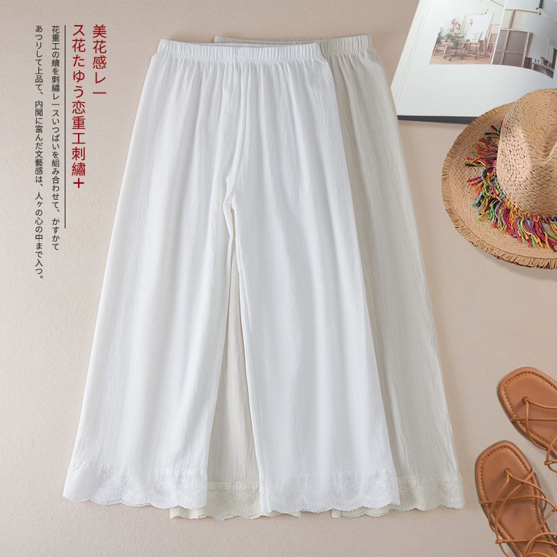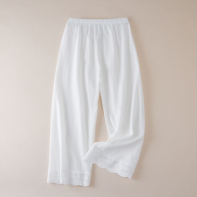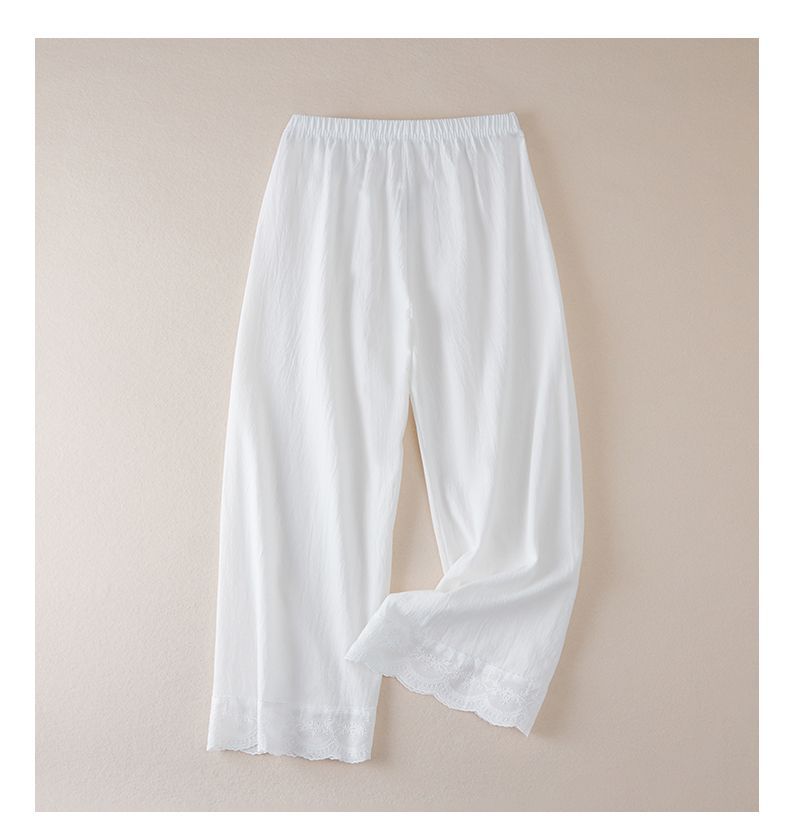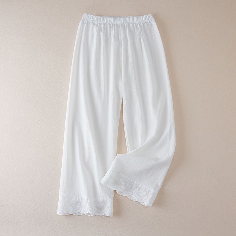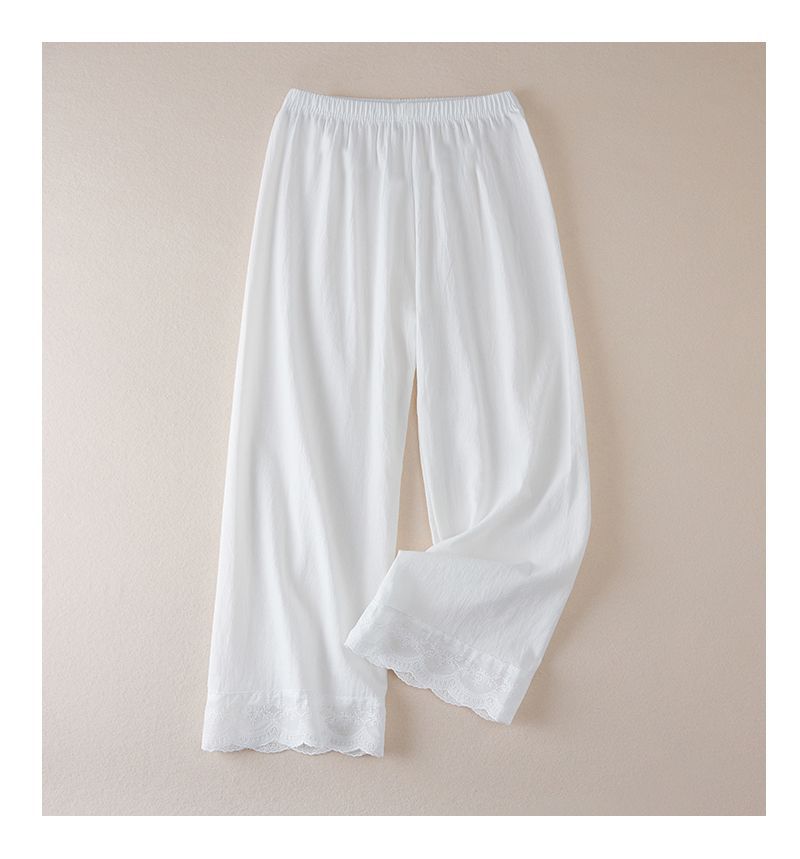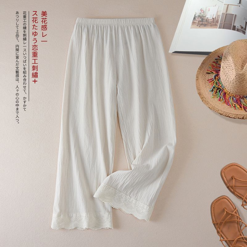 2025 Primavera/Verano Nuevo Literario Retro Color Sólido Pantalones Casuales Pantalones de Pierna Ancha Pantalones Sueltos Nueve Puntos con Encaje Empalmado Ropa de Mujer